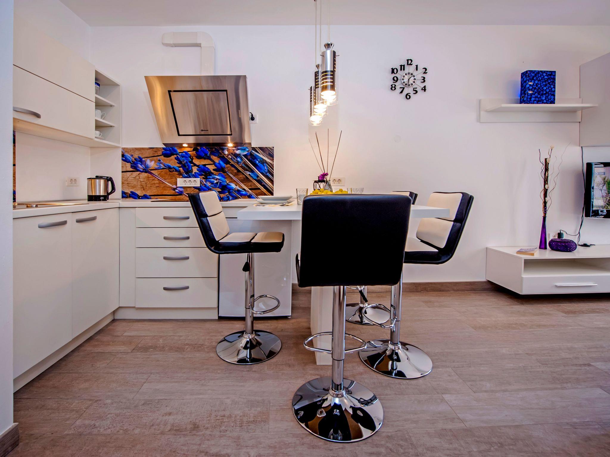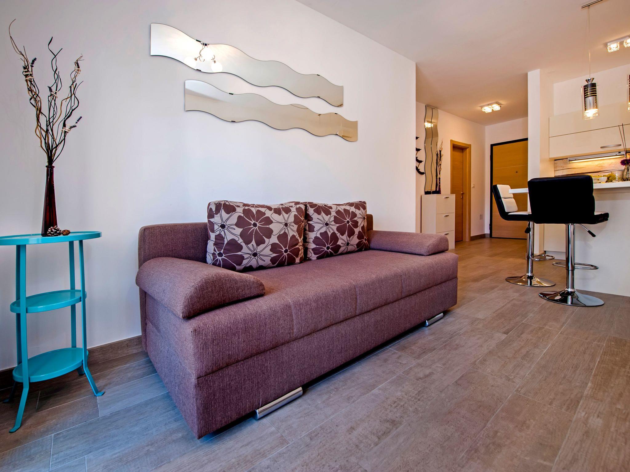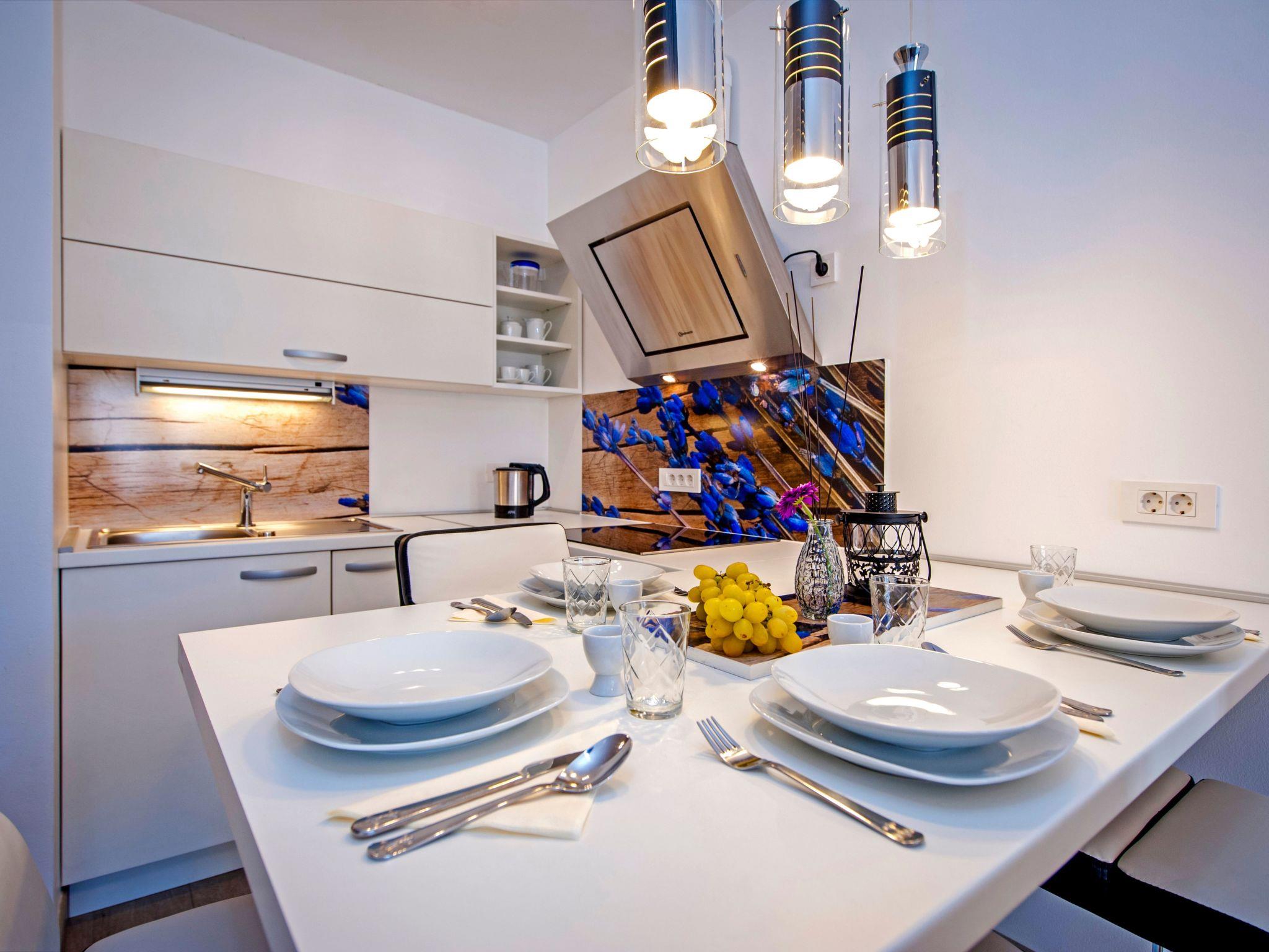 The 42m² holiday apartment is on the ground floor of the apartment building and is suitable for four persons. Maximum usage of space was the aim for the well-being of guests during their stay. The centerpiece of the apartment is the living room with a cosy sitting area with a sofa and large flat-screen TV along with an integrated modern dining space and kitchen corner. The bedroom has two separate beds that can also be joined together. Two further guests can sleep on the sofa bed in the living room. In the spacious modern bathroom fitted with a shower cubicle, washbasin, washing machine, bidet and WC you have ample space for a stress-free start to the day. You can use the wireless Internet connection free of charge.