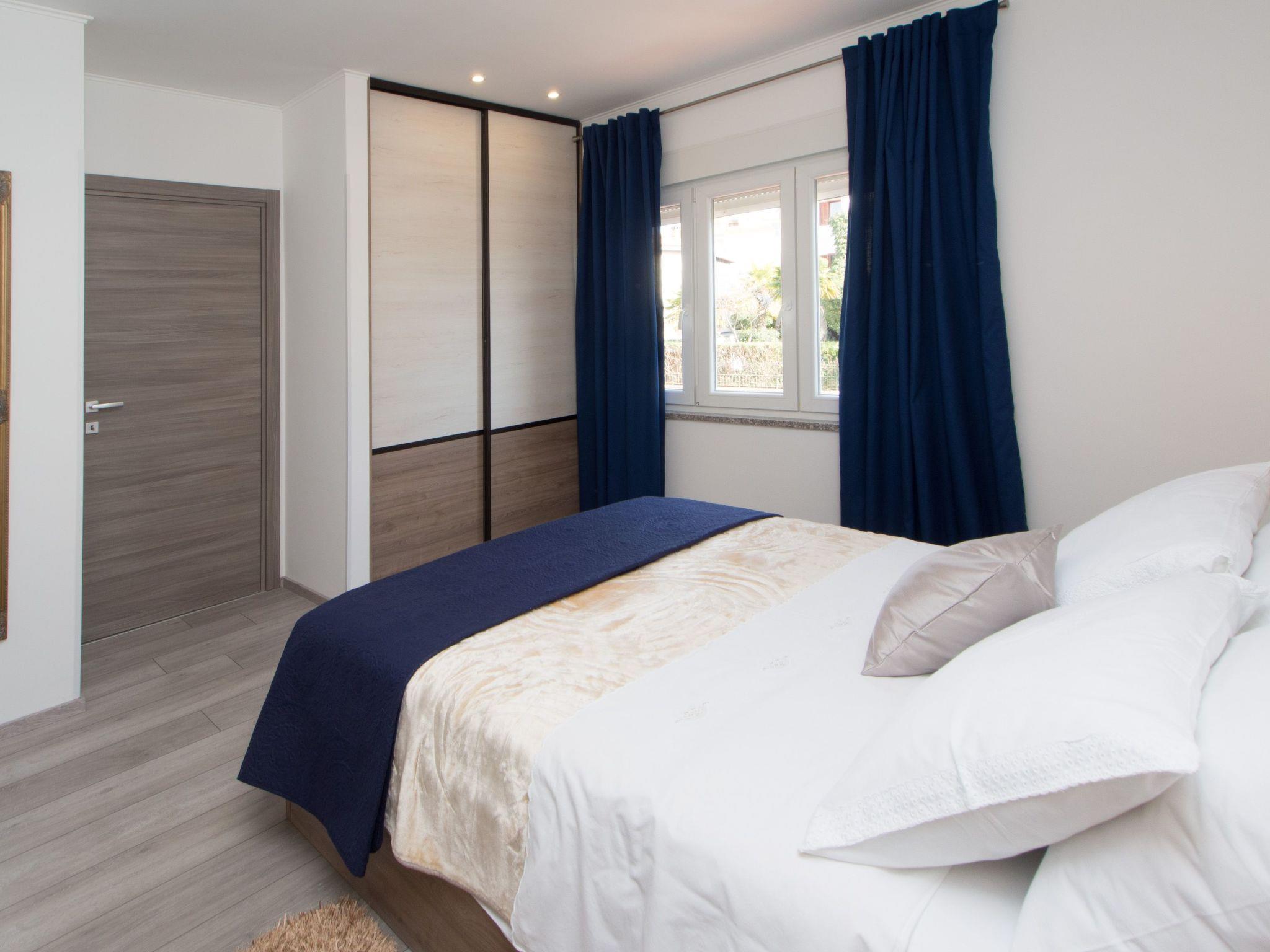 The 55m² holiday apartment is on the upper floor of a two-storey residential house. The lower floor is occupied by a Croatian family, while the owner lives in the apartment next door. Fully renovated just recently in 2019, the apartment offers all modern amenities, including air conditioning units in the living room and bedroom and WiFi Internet access in all rooms. The apartment consists of an open-plan living and dining room with an integrated, fully-equipped kitchen and a bedroom with a top modern bathroom. The living room provides a comfortable sofa, an armchair, a flat-screen TV with satellite channels and a stereo system. The sofa can be converted into a bed for a third guest (approx. 120 x 200cm). Next to the dining space is an adjoining modern built-in kitchen with only the latest of appliances: ceramic hob (induction) with a cooker hood, a fridge with a freezer compartment, a kettle and a coffee machine. The bedroom is furnished with a double bed (160 x 200cm), a wall cupboard with ample storage space for your clothing and luggage, as well as a desk and a large mirror. The top modern, tasteful cream/brown tiled bathroom has a generous walk-in shower cubicle, a washbasin with a cupboard underneath and a wall mirror, a hairdryer and a toilet.