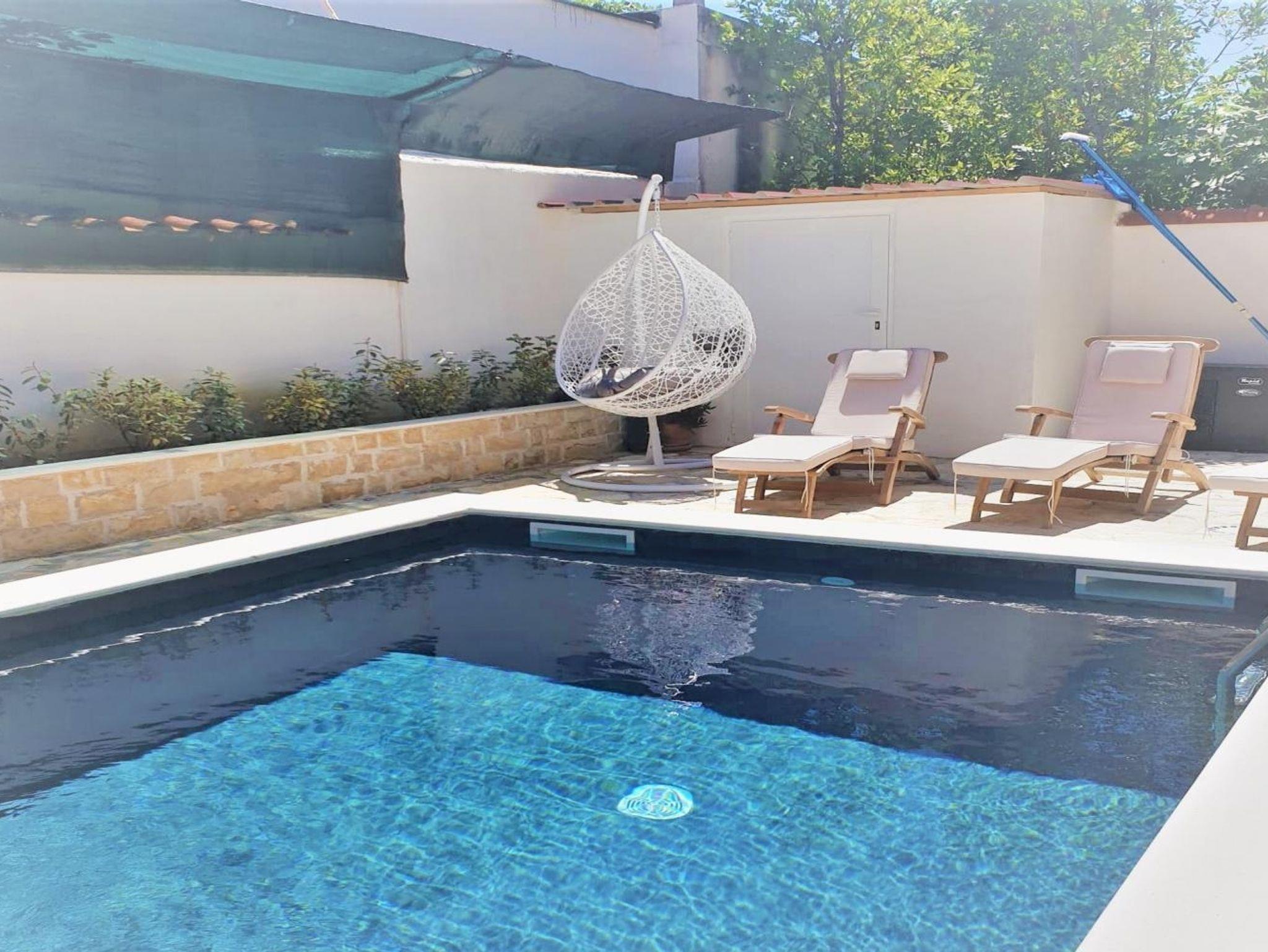 Umgebung des Objekts (Ordentlich), Hof (550m2, Sitzbereich), Parkplatz (Anzahl der Parkplätze: 6, Entfernung vom Objekt: im Hof), Pool: gemeinsam, Dimensionen: 14m x 4m x 1.5m, Wassertyp: Süßwasser, Heizung: Ja, Grill: gemeinsam, WiFi Internet, Föhn, Bügeleisen, Bügelbrett, Kinderbett