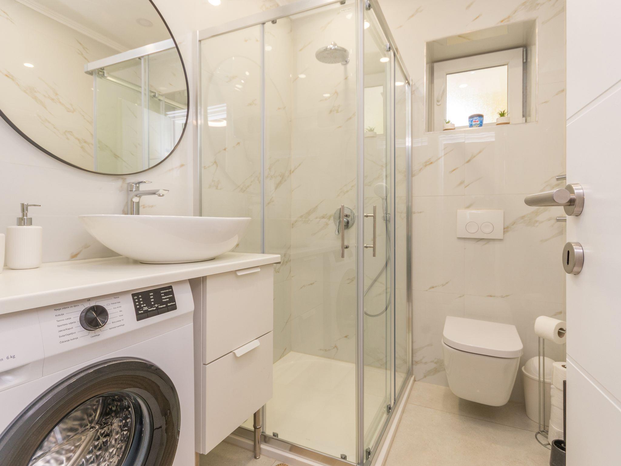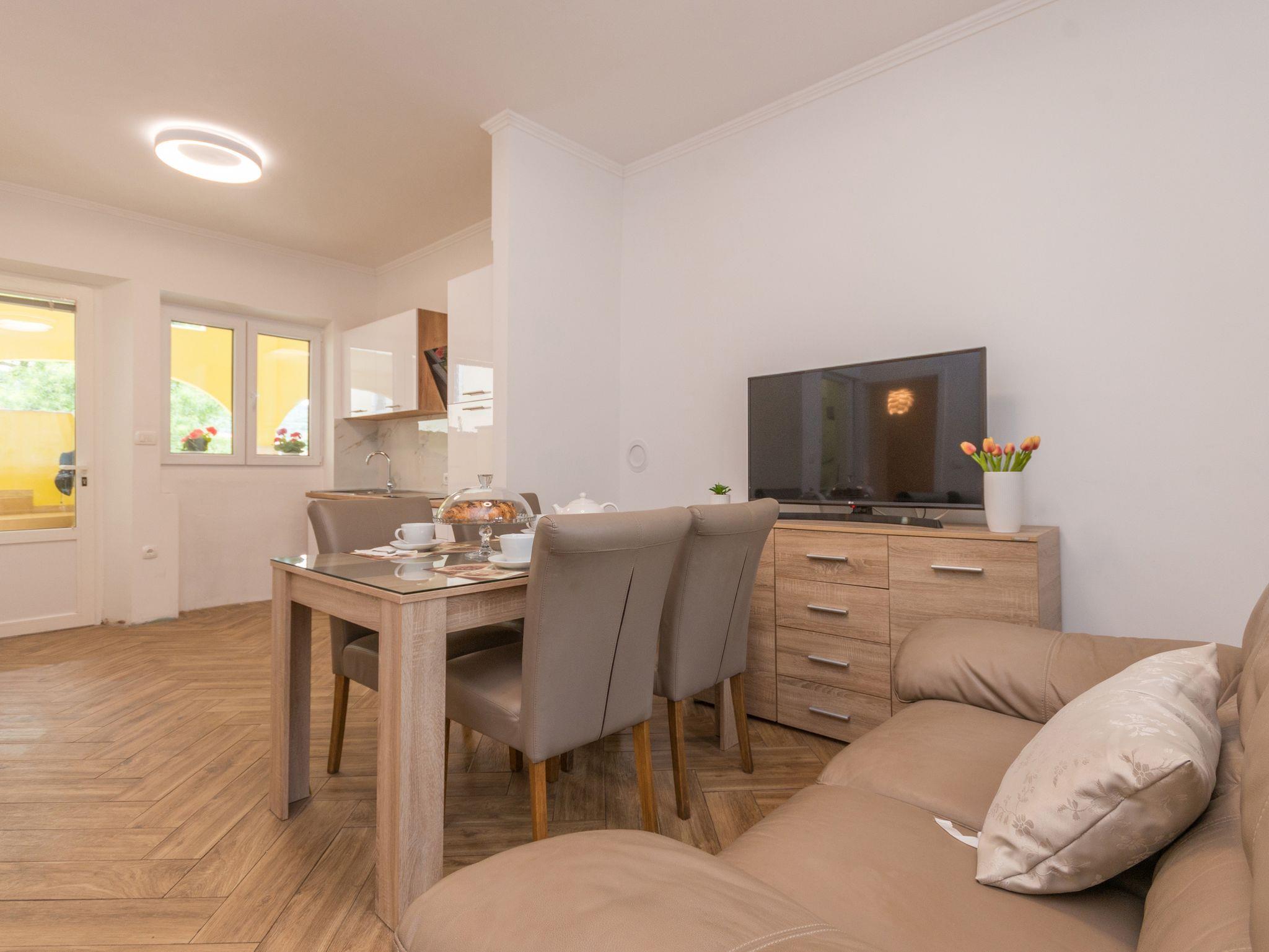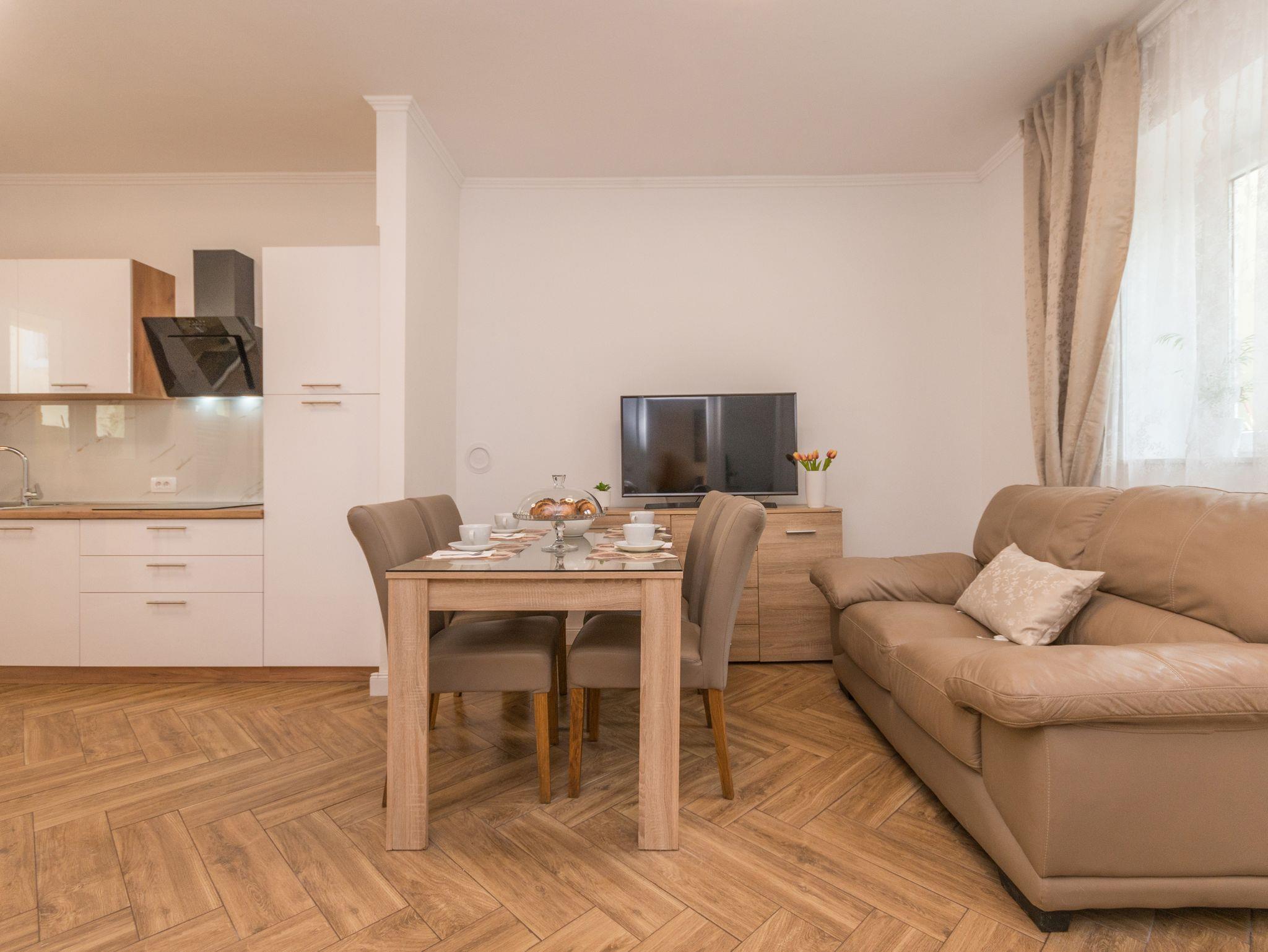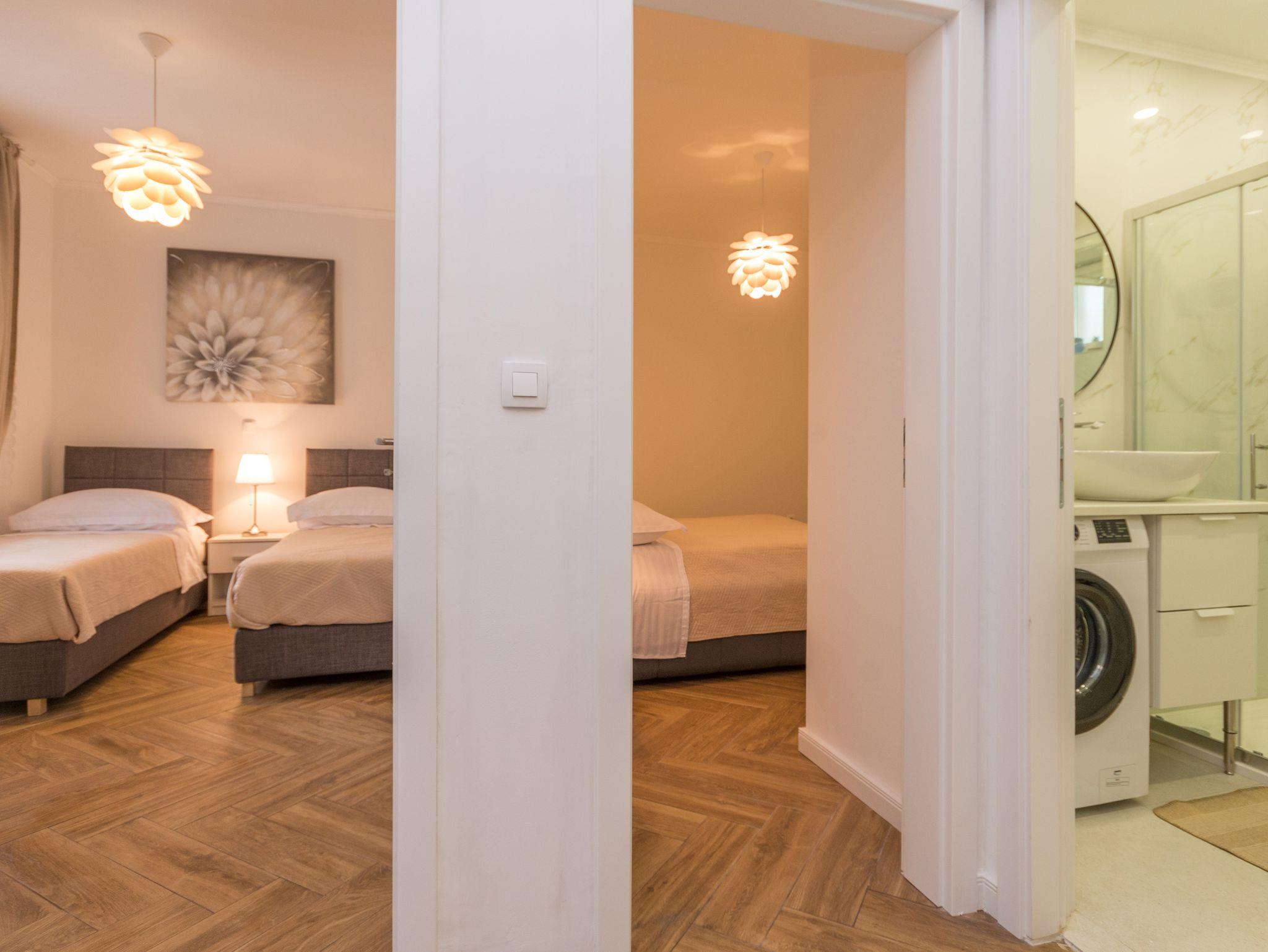 Ferienwohnung bietet Platz für 4 Gäste. Die Betten sind in Schlafzimmern, die es 2 gibt, innerhalb einer Gesamtfläche von 42m2, angeordnet. Die Gäste haben eine eigene Terrasse zur Verfügung, auf der sie in warmen Sommernächten genießen können. Es ist erlaubt, Speisen auf dem Gemeinschafts-Grill vorzubereiten. IM PREIS INBEGRIFFEN: Kurtaxe, Endreinigung, Klimatisierung, Parkplatz, Internet, Kinderbett. VERBINDLICHE ZUSÄTZLICHE KOSTEN: Aufzahlung für Kurzaufenthalte (prozentualer Zuschlag pro Nächtigungsanzahl: 30% - 1, 20% - 2, 10% - 3). Die Verfügbarkeit zusätzlicher Dienstleistungen in Ihrem reservierten Termin und die Preise derselben (falls nicht aufgeführt) müssen im Voraus überprüft werden. Zusätzliche Dienstleistungen die in der Zahlungsaufforderung nicht aufgeführt sind werden direkt beim Vermieter bezahlt, angenommen der Gast nutzt auch diese.