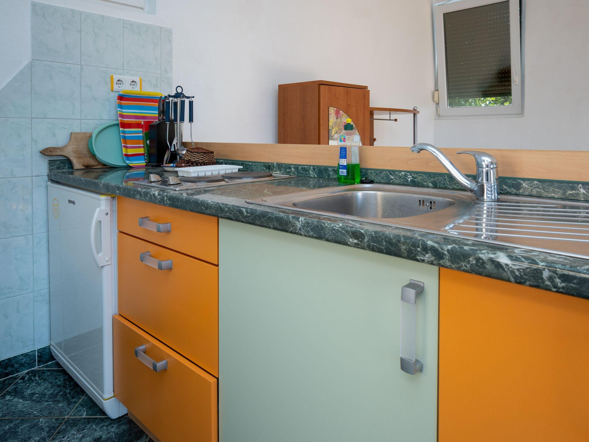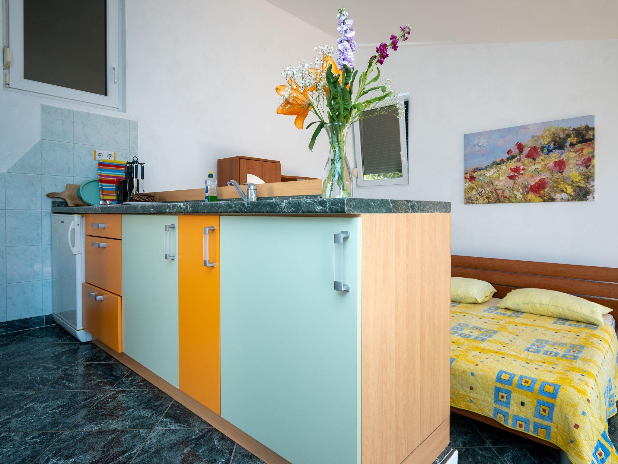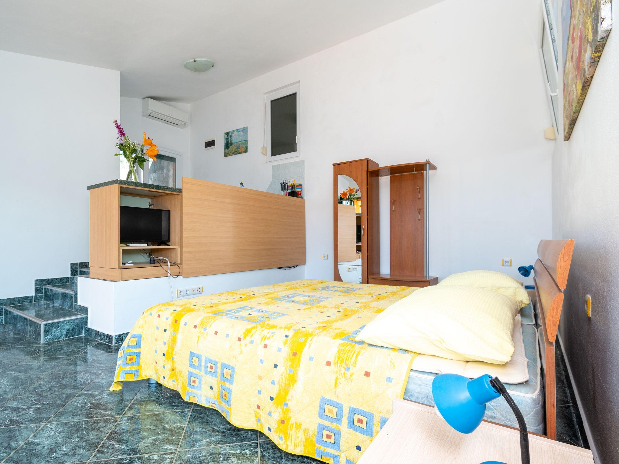 Studio bietet Platz für 2 Gäste. Die Betten sind in Schlafzimmern, die es 1 gibt, innerhalb einer Gesamtfläche von 24m2, angeordnet. Die Gäste haben eine eigene Terrasse zur Verfügung, auf der sie in warmen Sommernächten genießen können. Das Studio-Apartment bietet Meerblick. Es ist erlaubt, Speisen auf dem Gemeinschafts-Grill vorzubereiten. In der Unterkunftseinheit besteht die Möglichkeit des Mitbringens von Haustieren gegen Aufpreis. IM PREIS INBEGRIFFEN: Kurtaxe, Endreinigung, Klimatisierung, Parkplatz, Internet, Zusatzbett, Bügeleisen, Föhn, 1 Bett für Kinder (im Preis enthalten). VERBINDLICHE ZUSÄTZLICHE KOSTEN: Aufzahlung für Kurzaufenthalte (prozentualer Zuschlag pro Nächtigungsanzahl: 30% - 1, 20% - 2, 10% - 3). UNVERBINDLICHE ZUSÄTZLICHE KOSTEN: Haustiere (5,00 € pro Nacht). Die Verfügbarkeit zusätzlicher Dienstleistungen in Ihrem reservierten Termin und die Preise derselben (falls nicht aufgeführt) müssen im Voraus überprüft werden. Zusätzliche Dienstleistungen die in der Zahlungsaufforderung nicht aufgeführt sind werden direkt beim Vermieter bezahlt, angenommen der Gast nutzt auch diese. Ermäßigung auf den Grundpreis: Gratistag 14=13 (bei einem Aufenthalt von 14 Tagen oder mehr erhalten Sie einen Gratistag für den Aufenthalt bis 31.12.26).