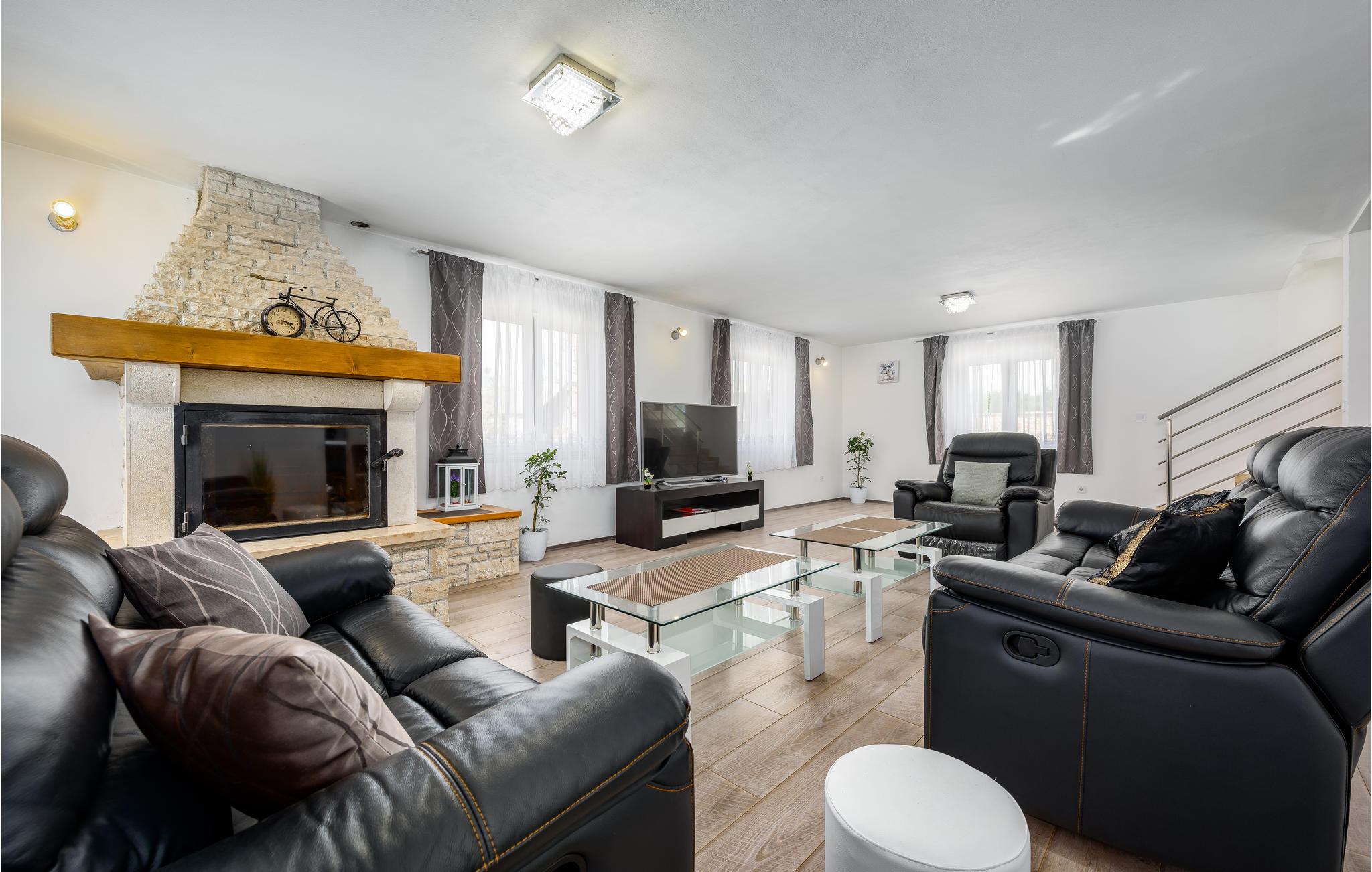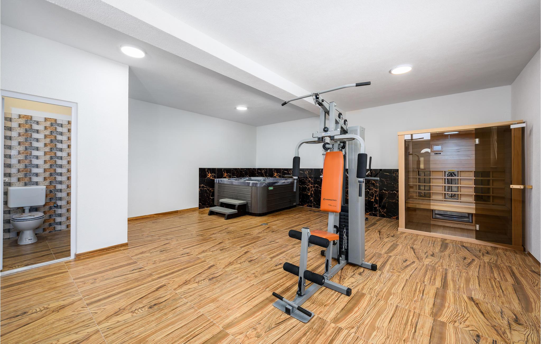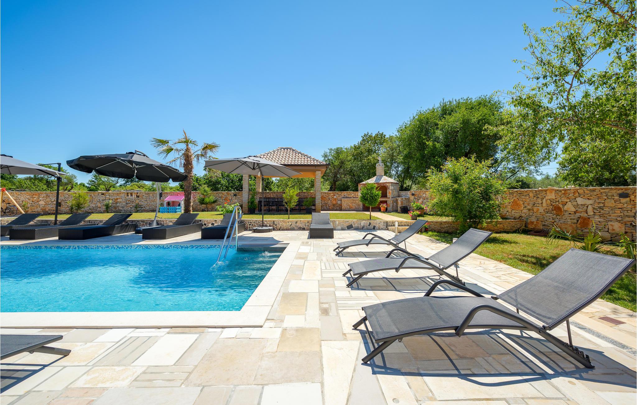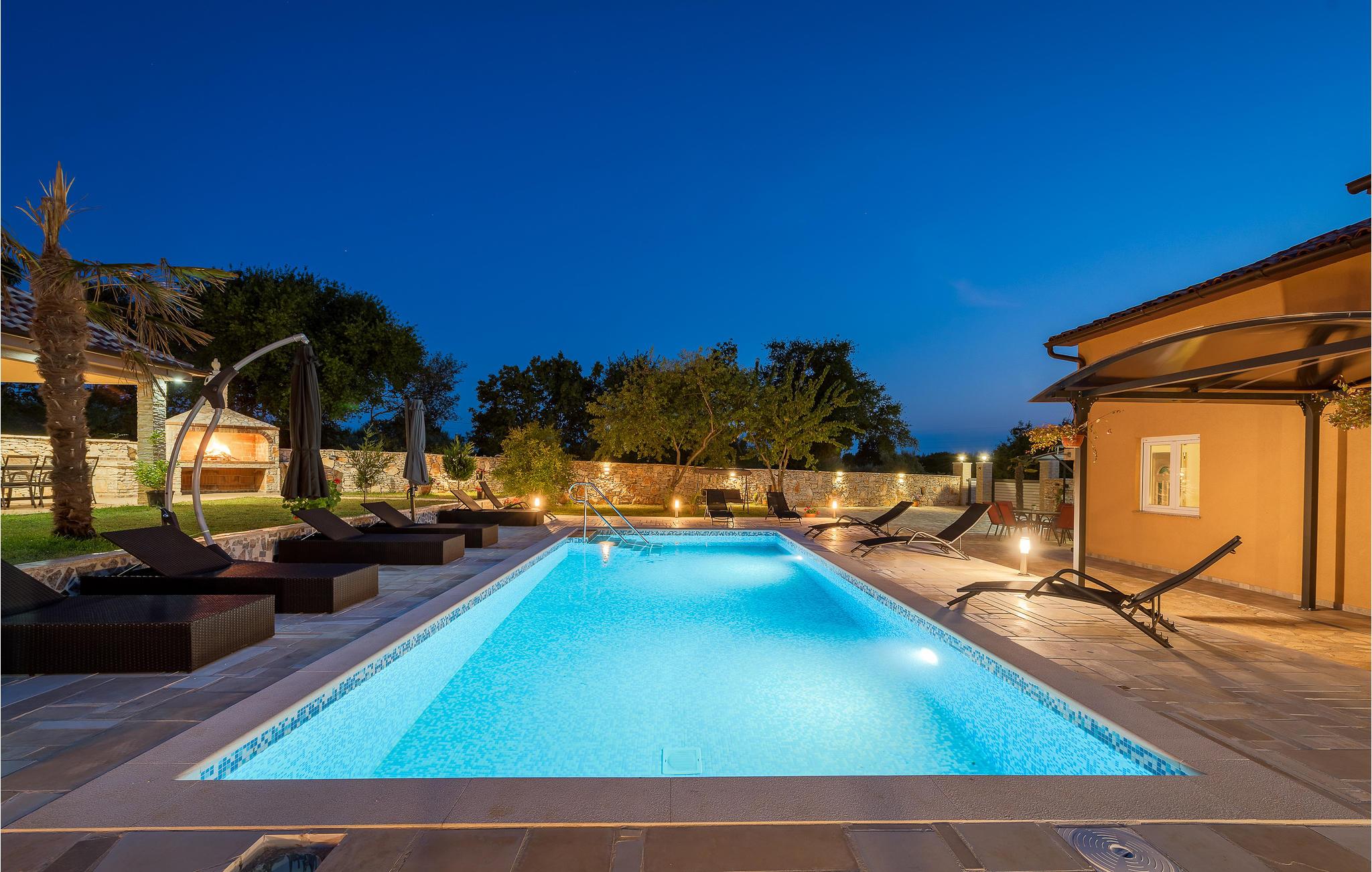 Det ligger i en lille landsby nær den gamle bydel i Vodnjan. Den rummelige opholdsstue i stueetagen består af et køkken, stue, soveværelse og badeværelse, mens der ovenpå er der fem soveværelser mere og to badeværelser. Foruden den store pool venter et wellness-rum i den separate bygning med sauna, boblebad og fitnessudstyr på ejendommen. I har også et udendørs køkken med en grill og en overdækket terrasse, hvor I med sikkerhed vil tilbringe mange timer udendørs.