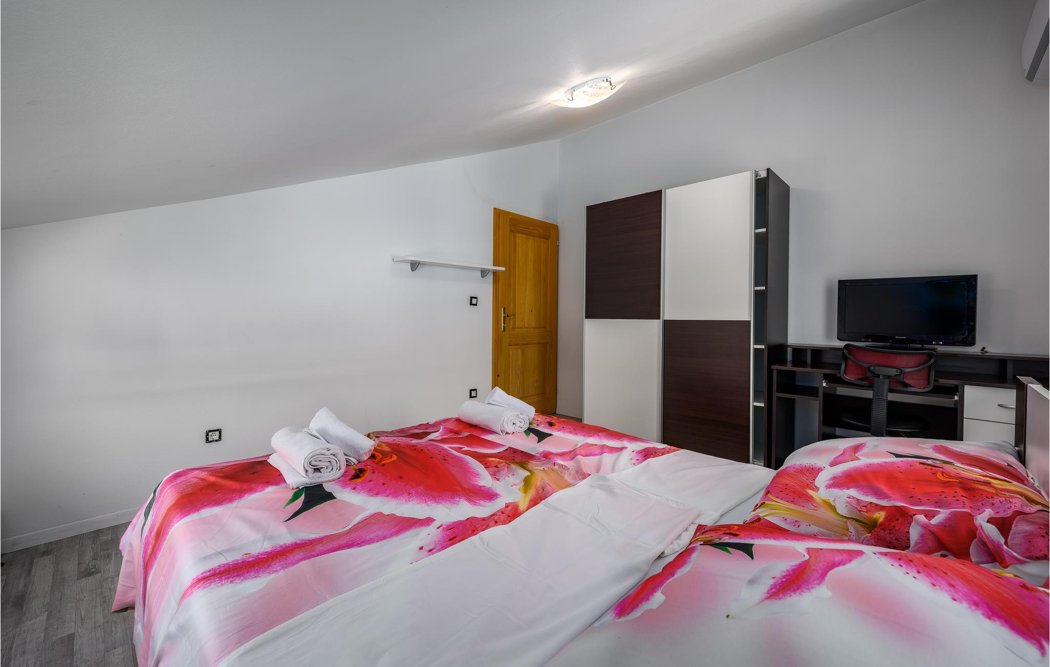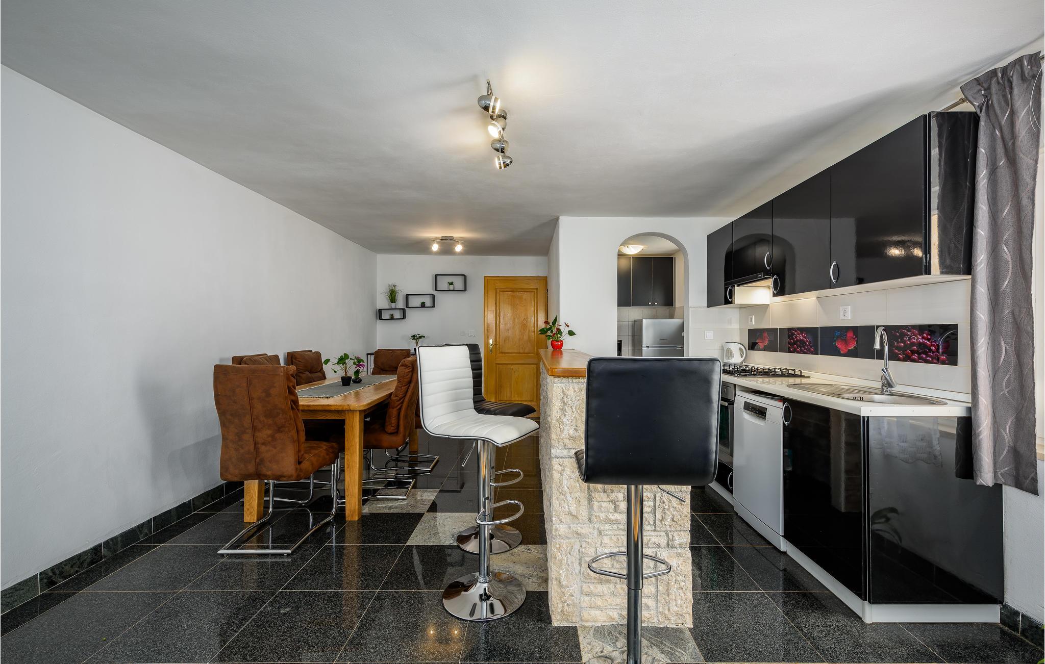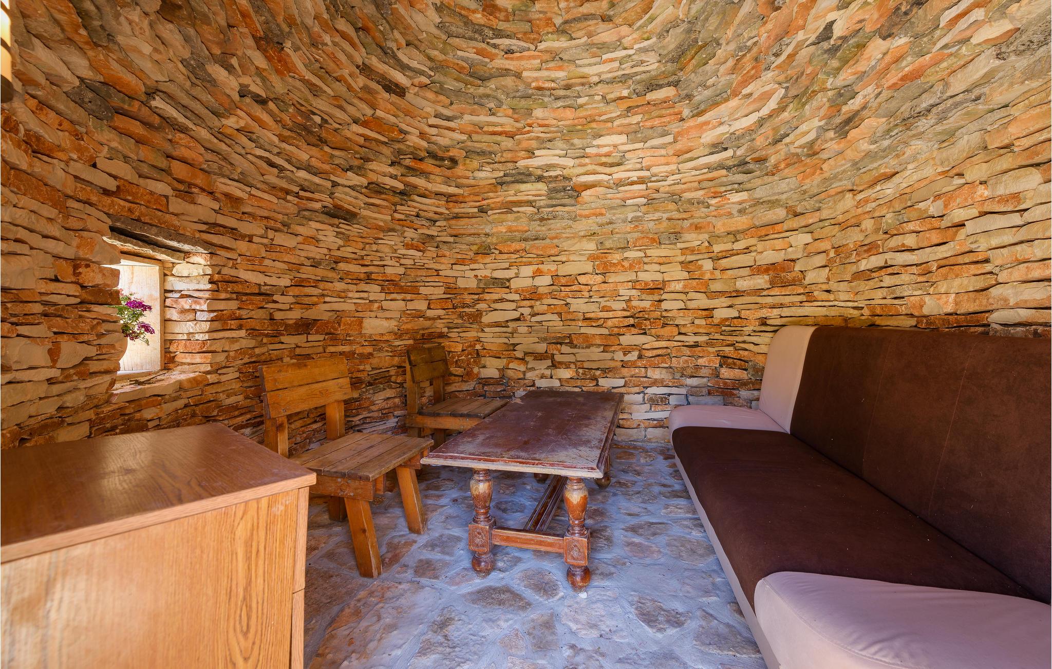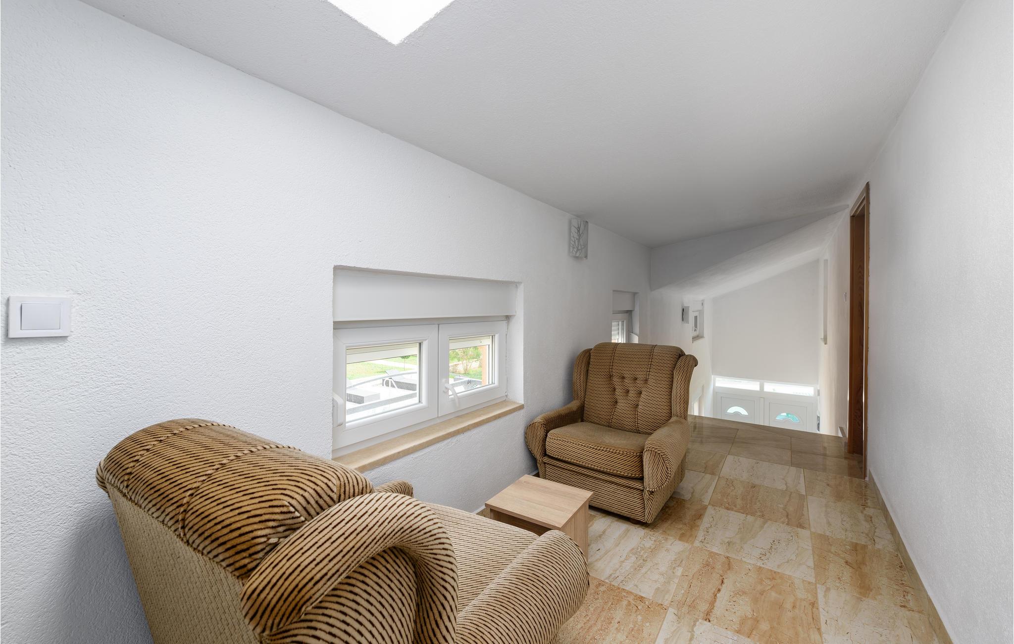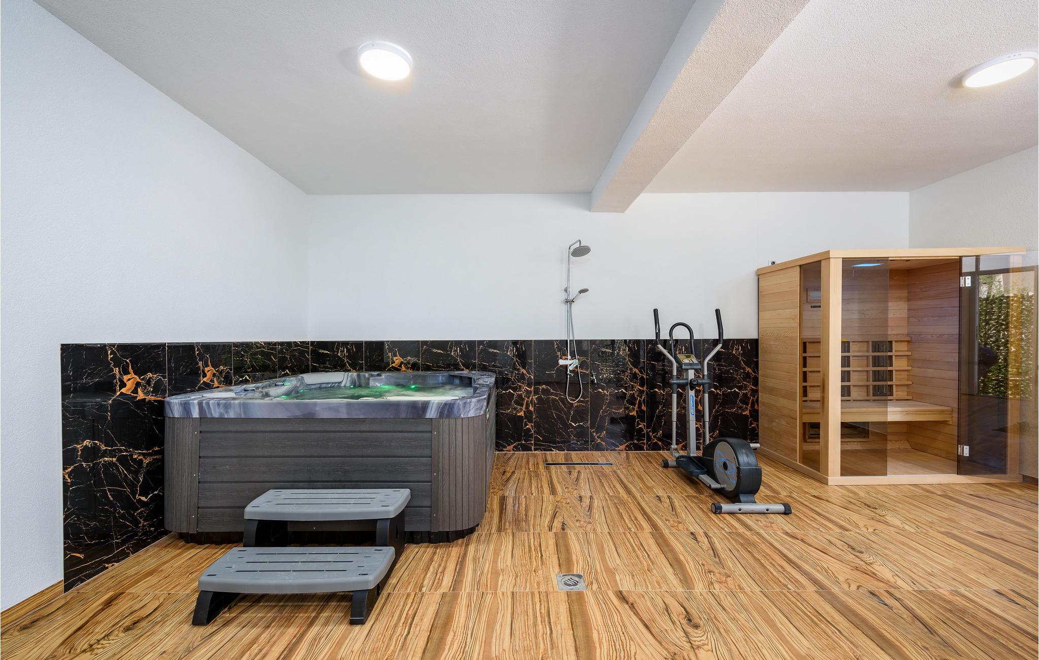 Det ligger i en lille landsby nær den gamle bydel i Vodnjan. Den rummelige opholdsstue i stueetagen består af et køkken, stue, soveværelse og badeværelse, mens der ovenpå er der fem soveværelser mere og to badeværelser. Foruden den store pool venter et wellness-rum i den separate bygning med sauna, boblebad og fitnessudstyr på ejendommen. I har også et udendørs køkken med en grill og en overdækket terrasse, hvor I med sikkerhed vil tilbringe mange timer udendørs.