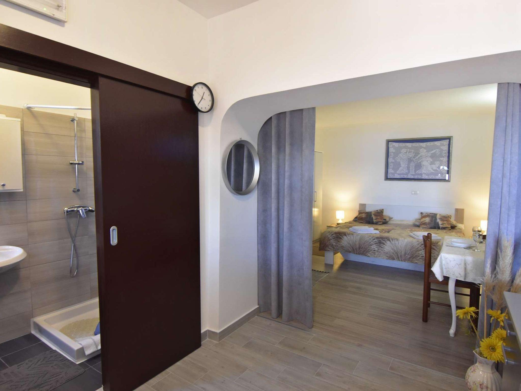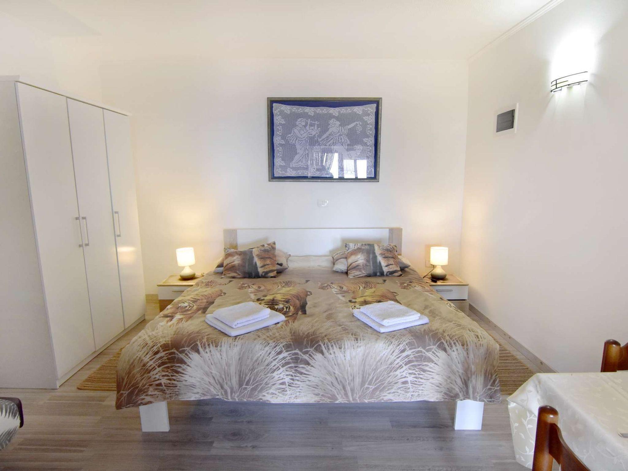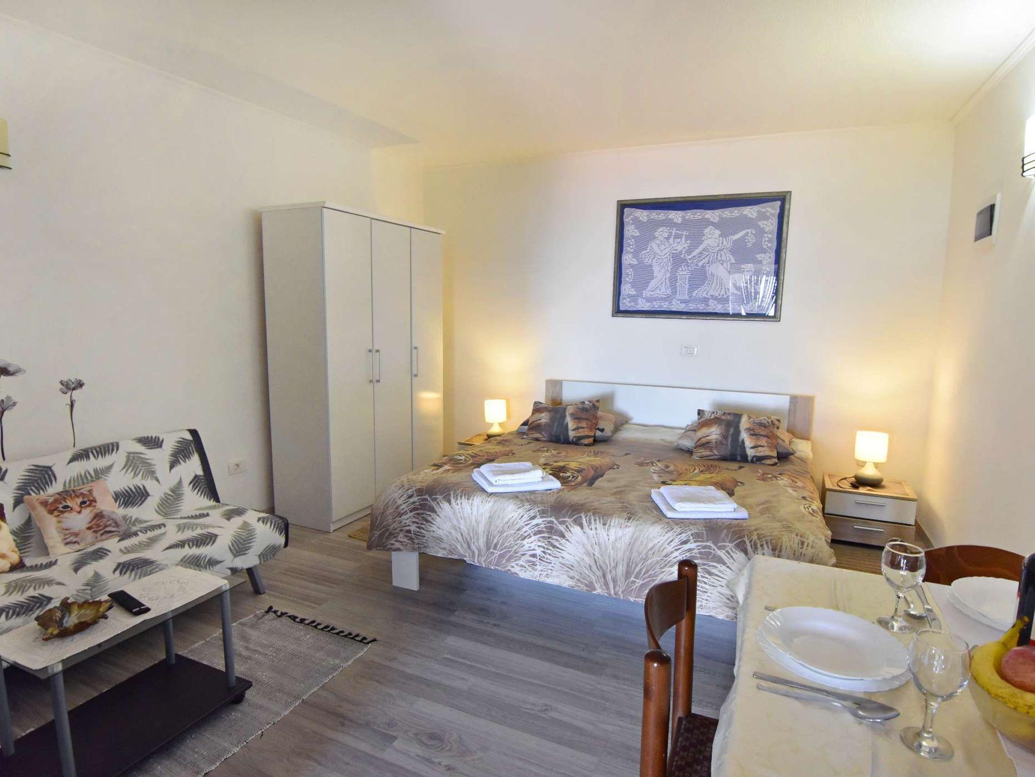 Studio bietet Platz für 3 Gäste. Die Betten sind in Schlafzimmern, die es 1 gibt, innerhalb einer Gesamtfläche von 28m2, angeordnet. Die Gäste haben eine eigene Terrasse zur Verfügung, auf der sie in warmen Sommernächten genießen können. Das Studio-Apartment bietet Meerblick. Es ist erlaubt, Speisen auf dem Gemeinschafts-Grill vorzubereiten. IM PREIS INBEGRIFFEN: Kurtaxe, Endreinigung, Klimatisierung, Parkplatz, Internet. Die Verfügbarkeit zusätzlicher Dienstleistungen in Ihrem reservierten Termin und die Preise derselben (falls nicht aufgeführt) müssen im Voraus überprüft werden. Zusätzliche Dienstleistungen die in der Zahlungsaufforderung nicht aufgeführt sind werden direkt beim Vermieter bezahlt, angenommen der Gast nutzt auch diese.