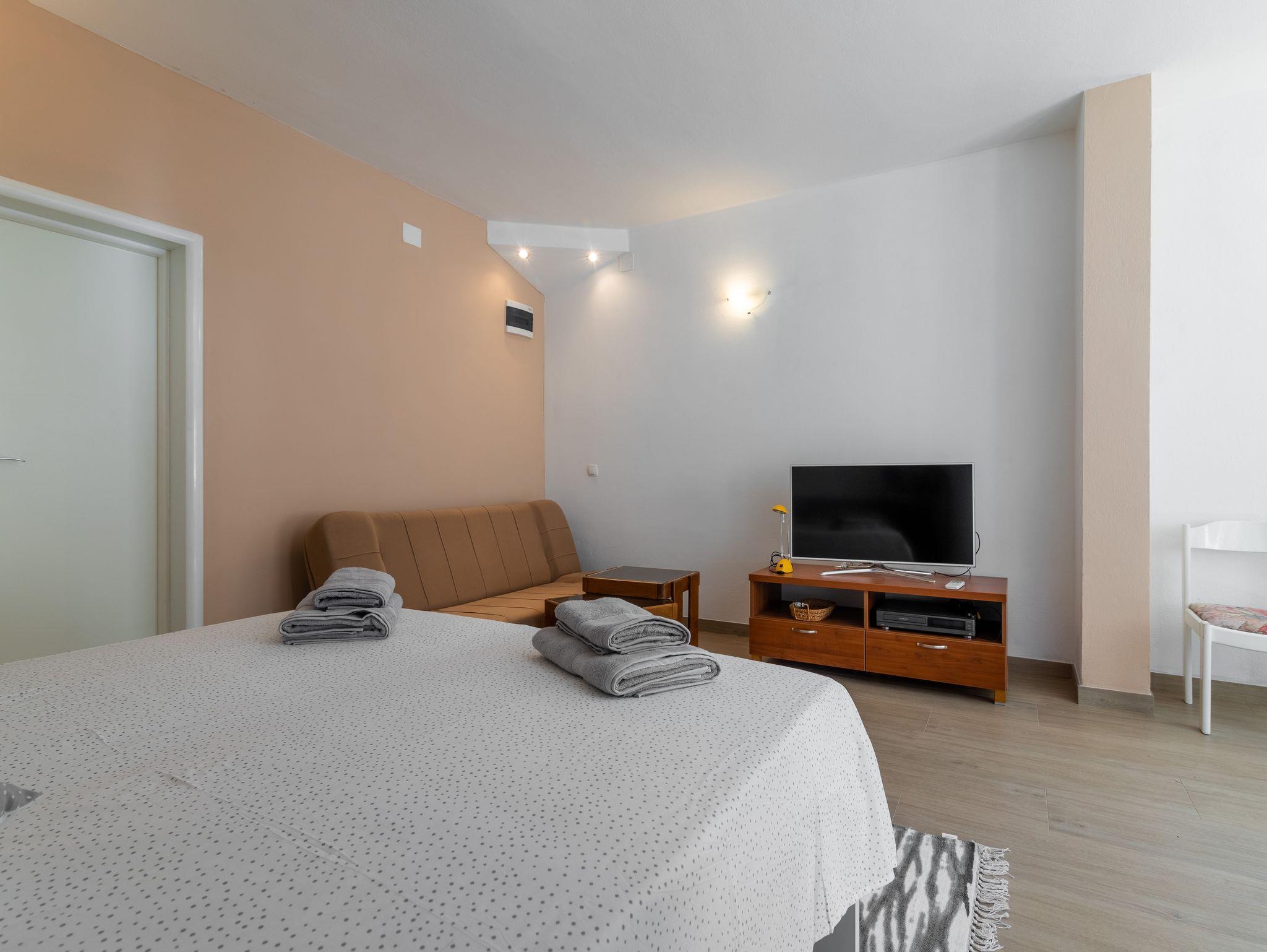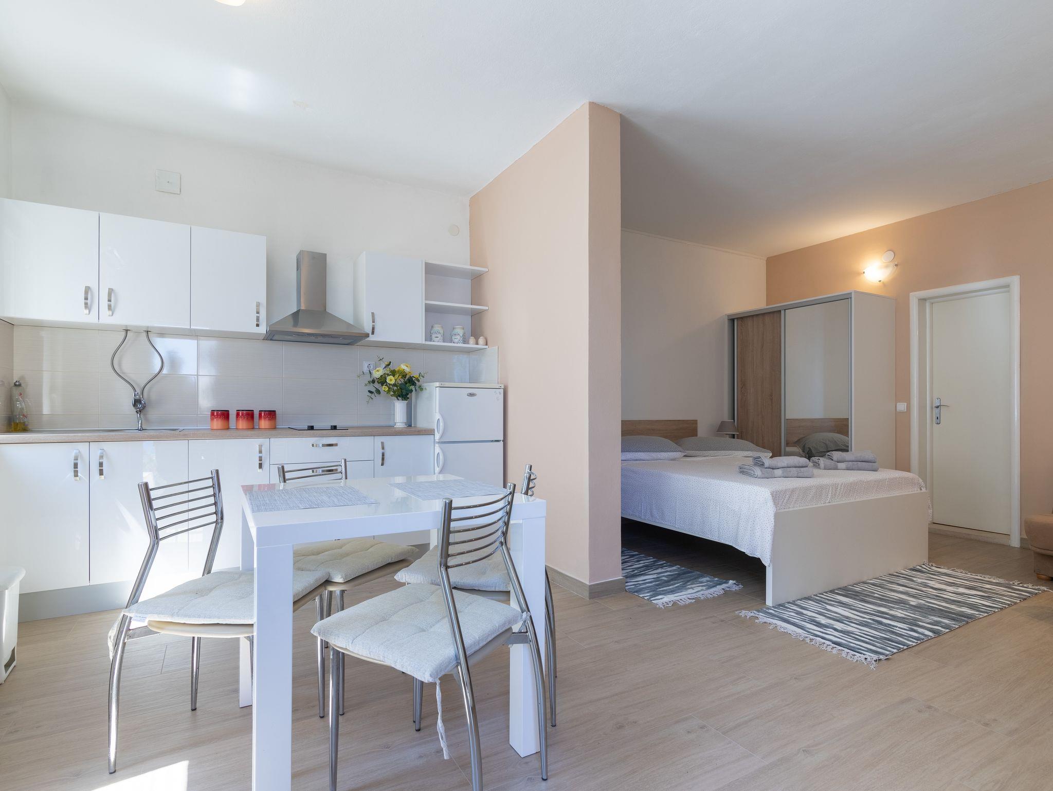 Studio bietet Platz für 3 Gäste. Die Betten sind in Schlafzimmern, die es 1 gibt, innerhalb einer Gesamtfläche von 33m2, angeordnet. Die Gäste haben eine eigene Terrasse zur Verfügung, auf der sie in warmen Sommernächten genießen können. Das Studio-Apartment bietet Meerblick. Es ist erlaubt, Speisen auf dem Gemeinschafts-Grill vorzubereiten. IM PREIS INBEGRIFFEN: Kurtaxe, Endreinigung, Klimatisierung, Zentralheizung, Parkplatz, Garage, Internet, Bootsanlegeplatz, Bügeleisen, Bügelbrett, Föhn, Sonnenschirm, Liegestühle. UNVERBINDLICHE ZUSÄTZLICHE KOSTEN: Wäschewaschen (3,00 € Waschen). Die Verfügbarkeit zusätzlicher Dienstleistungen in Ihrem reservierten Termin und die Preise derselben (falls nicht aufgeführt) müssen im Voraus überprüft werden. Zusätzliche Dienstleistungen die in der Zahlungsaufforderung nicht aufgeführt sind werden direkt beim Vermieter bezahlt, angenommen der Gast nutzt auch diese.