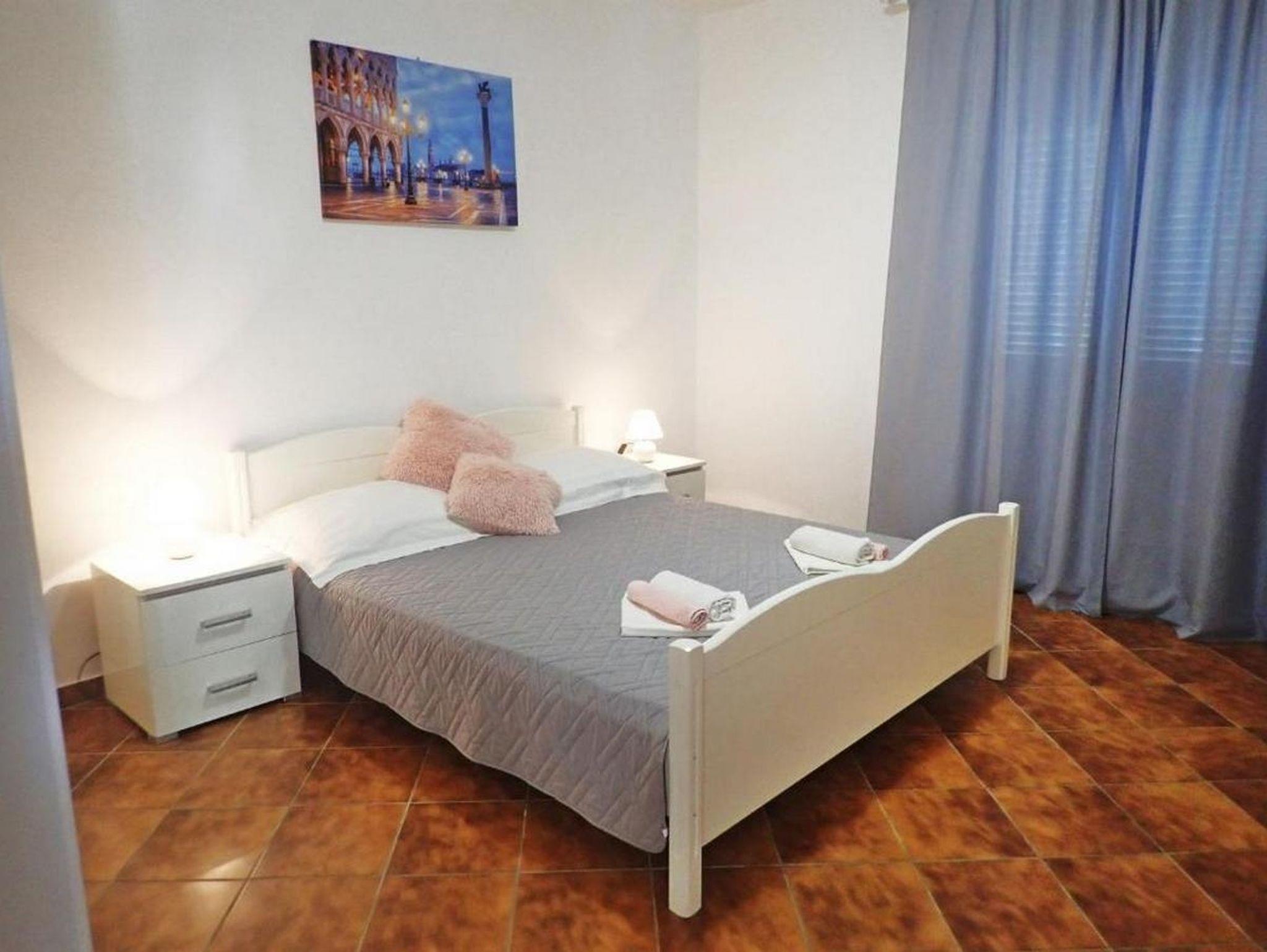 Ferienwohnung bietet Platz für 5 Gäste. Die Betten sind in Schlafzimmern, die es 2 gibt, und in Wohnzimmer, innerhalb einer Gesamtfläche von 55m2, angeordnet. Die Gäste haben eine eigene Terrasse zur Verfügung, auf der sie in warmen Sommernächten genießen können. Es ist erlaubt, Speisen auf dem Gemeinschafts-Grill vorzubereiten. IM PREIS INBEGRIFFEN: Kurtaxe, Endreinigung, Klimatisierung, Parkplatz, Internet, Kinderbett, Bügeleisen, Bügelbrett, Föhn, Liegestühle. VERBINDLICHE ZUSÄTZLICHE KOSTEN: Aufzahlung für Kurzaufenthalte (prozentualer Zuschlag pro Nächtigungsanzahl: 30% - 1, 20% - 2, 10% - 3). Die Verfügbarkeit zusätzlicher Dienstleistungen in Ihrem reservierten Termin und die Preise derselben (falls nicht aufgeführt) müssen im Voraus überprüft werden. Zusätzliche Dienstleistungen die in der Zahlungsaufforderung nicht aufgeführt sind werden direkt beim Vermieter bezahlt, angenommen der Gast nutzt auch diese.
