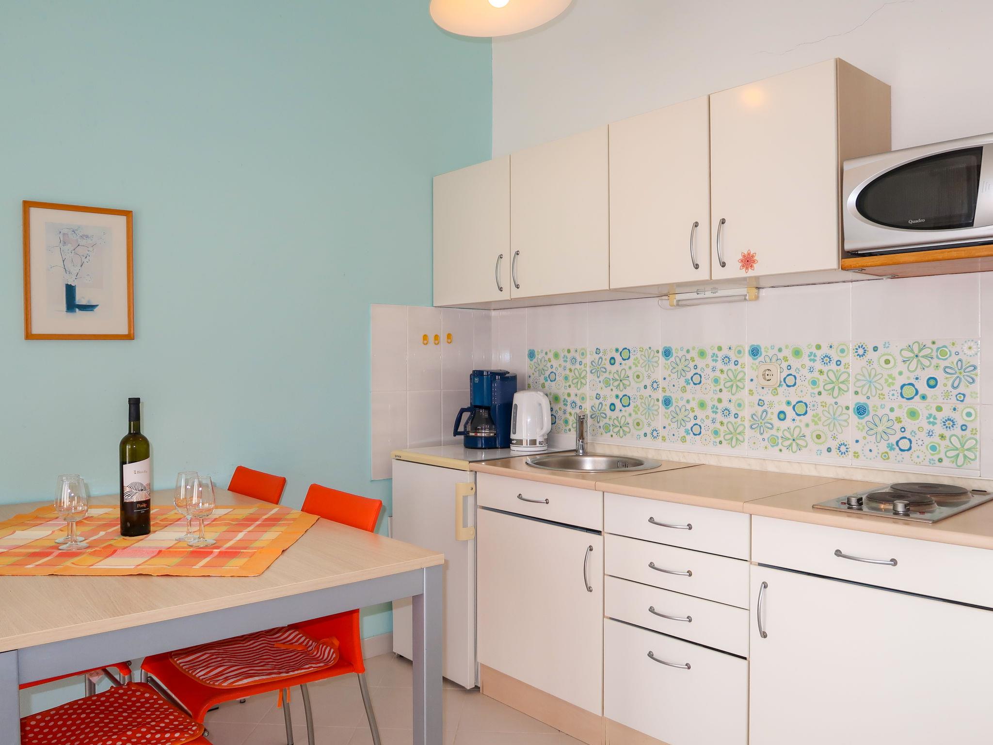 "Elena", 2-room apartment 45 m2 on 1st floor. Living/dining room with 1 double sofabed (140 cm, length 200 cm), satellite TV and air conditioning. Exit to the balcony. 1 room with 1 french bed (160 cm, length 200 cm). Open kitchen (2 hot plates, toaster, kettle, microwave, electric coffee machine). Shower/WC. Forced-air heating. Balcony 9 m2, terrace 11 m2, roofed. Terrace furniture, balcony furniture. Beautiful view of the sea. Facilities: Internet (WiFi, free).