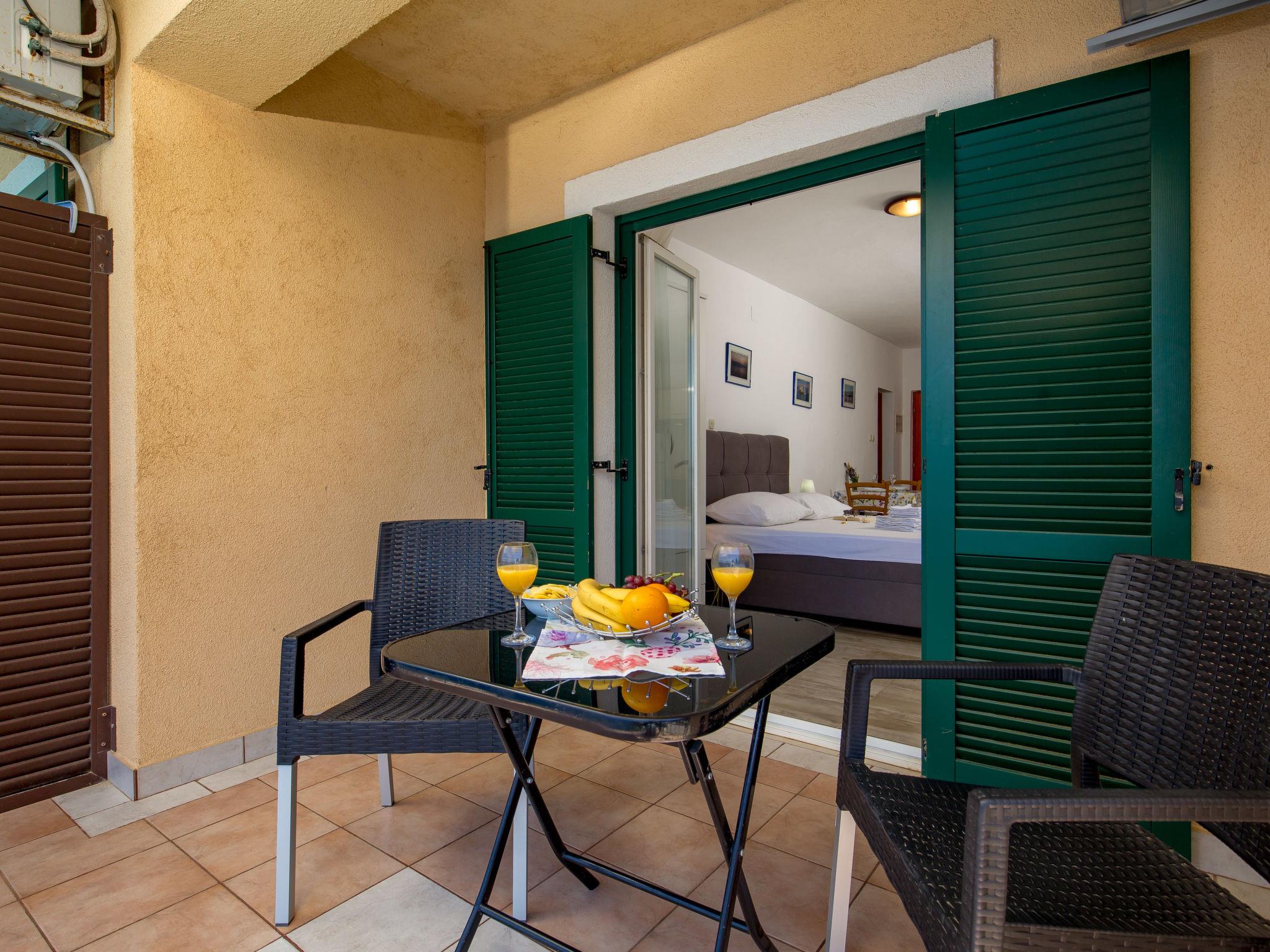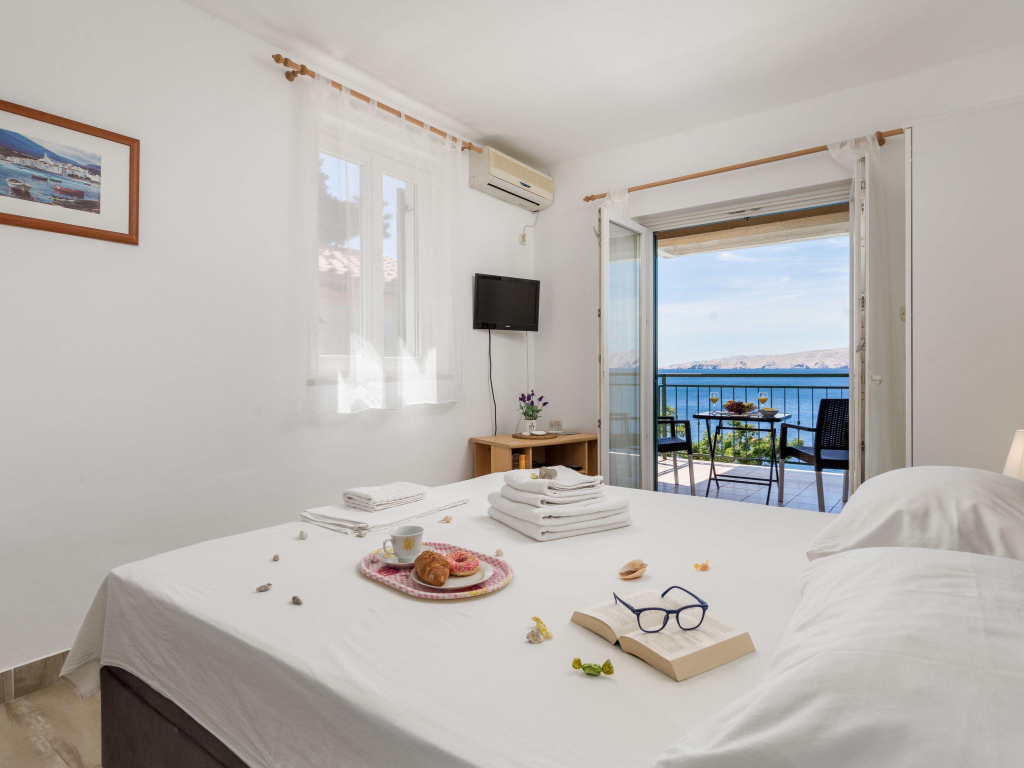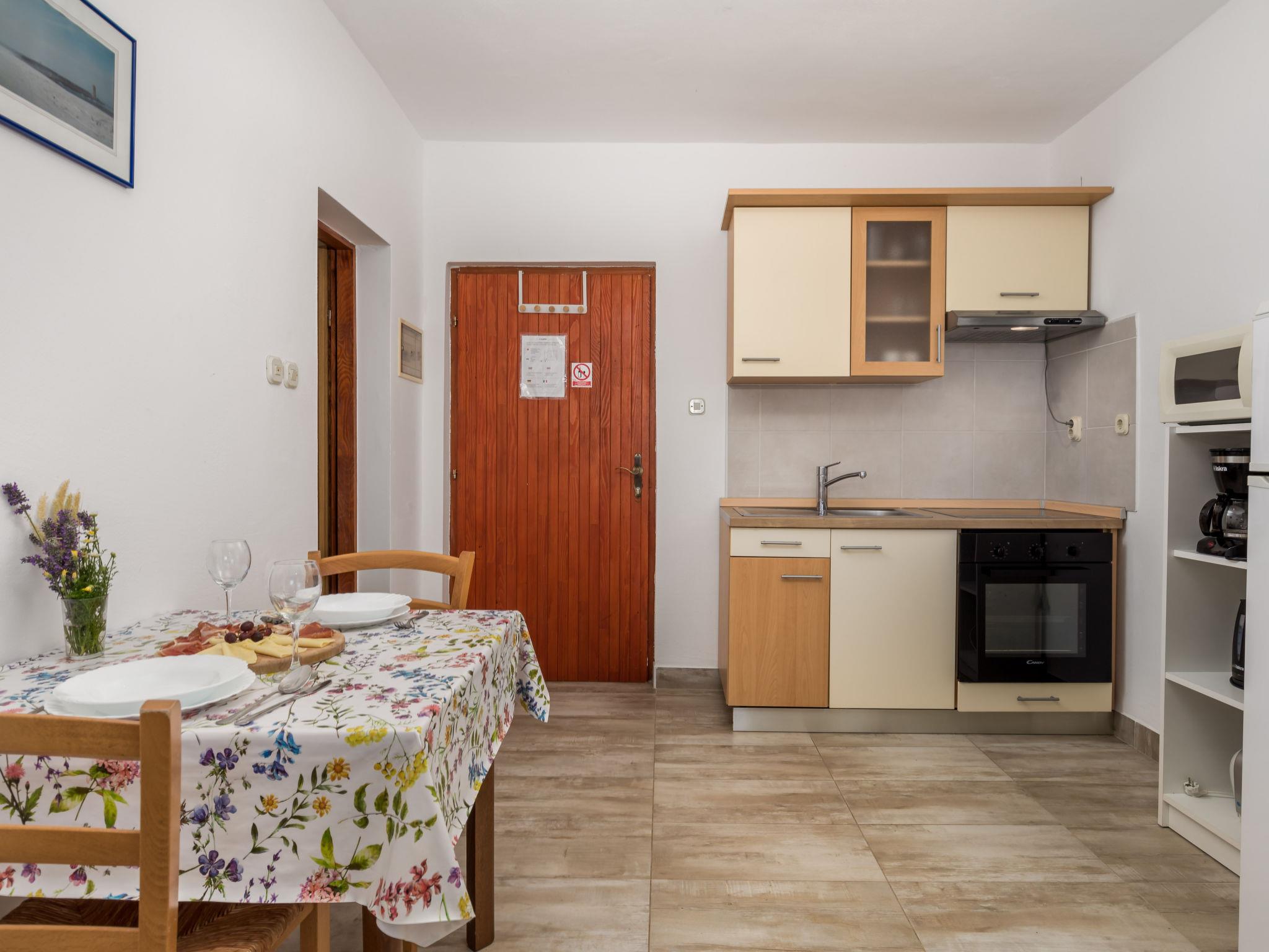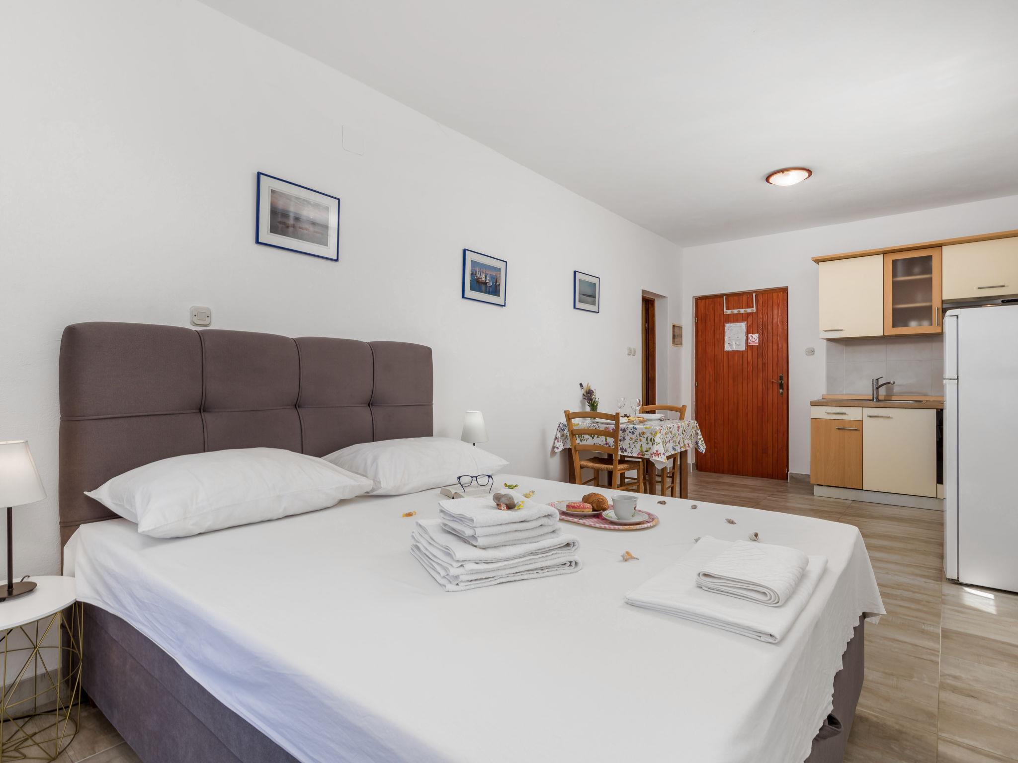 "Marina", 1-room apartment 25 m2, on the ground floor. Renovated in 2019: Studio with 1 french bed (160 cm, length 200 cm), satellite TV and air conditioning. Exit to the balcony. Open kitchen (oven, 4 induction hot plates, toaster, microwave, freezer, electric coffee machine) with dining table. Shower/WC. No heating option. Balcony. Balcony furniture. View of the sea. Facilities: Internet (WiFi, free). Please note: non-smoking house. Maximum 1 pet/ dog allowed.