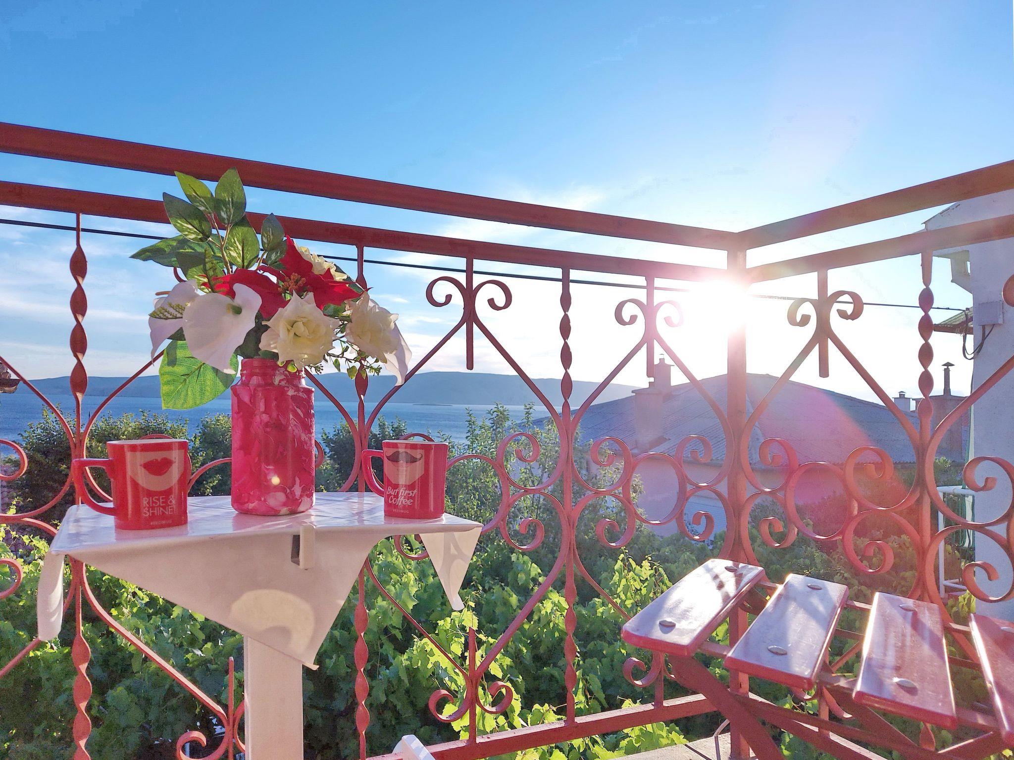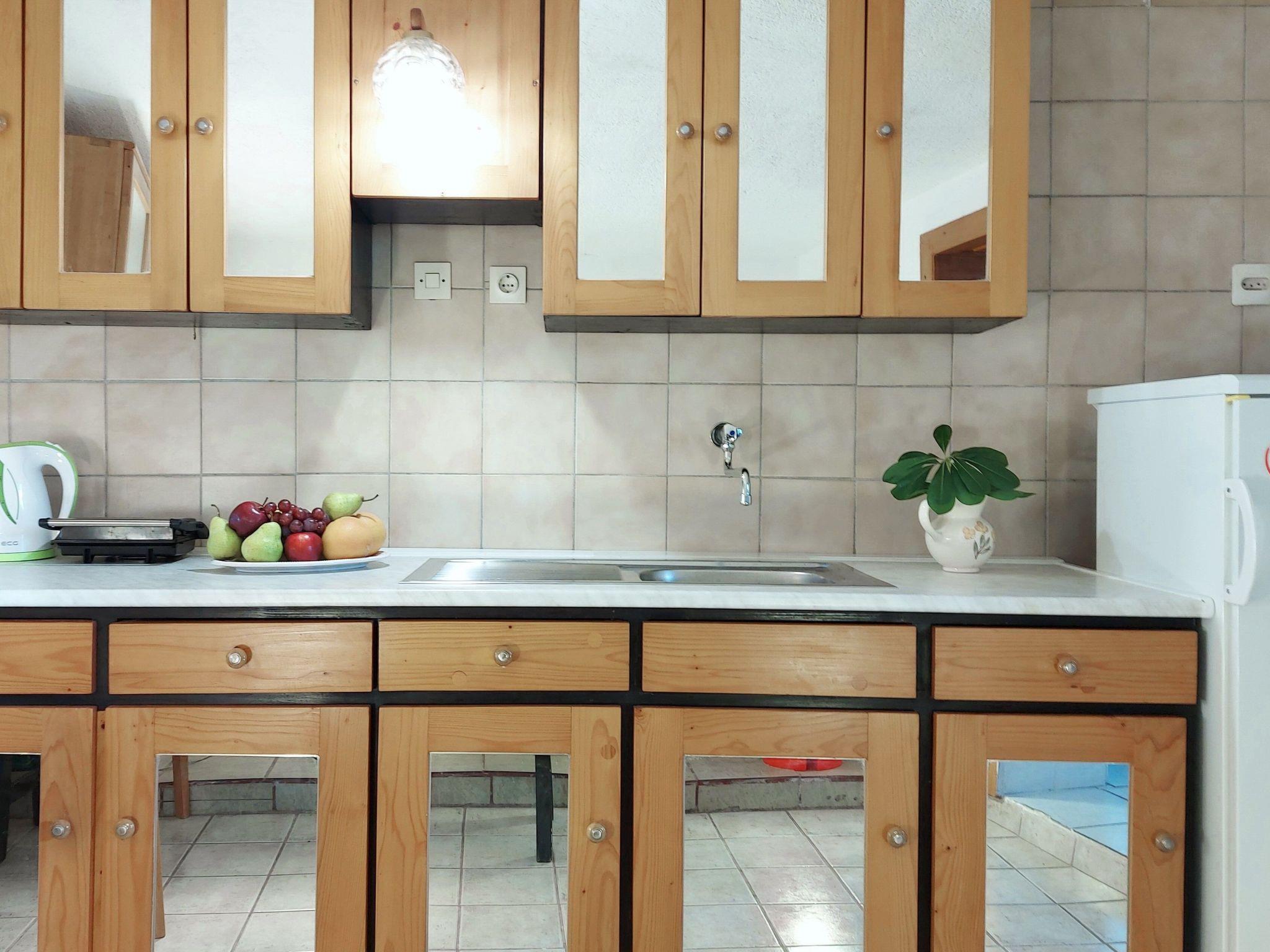 The holiday home has a ground floor and an upper floor. On the ground floor there are two bedrooms, a bathroom and a kitchenette. On the first floor there is a living room and dining room with air conditioning and 2 large sofa beds, a fully equipped kitchen and another bedroom with air conditioning and a bathroom. From the living area you can access the furnished balcony, which offers a view of the sea and the sunset. It is furnished with two folding chairs and a small table.