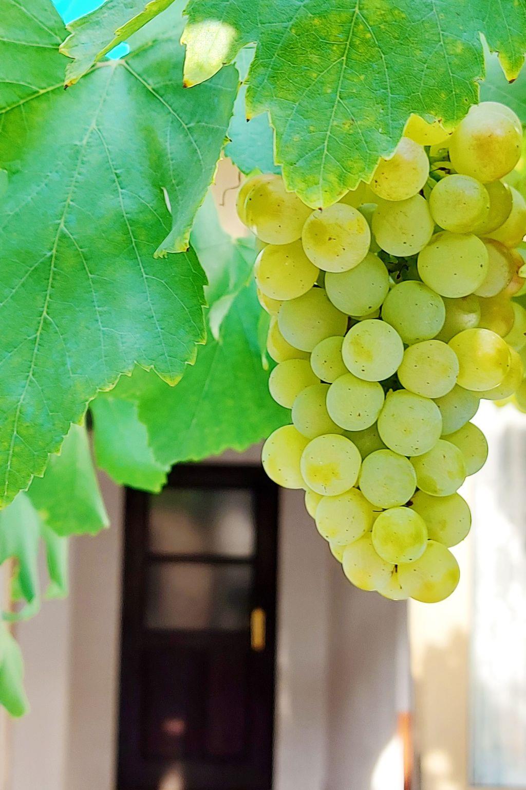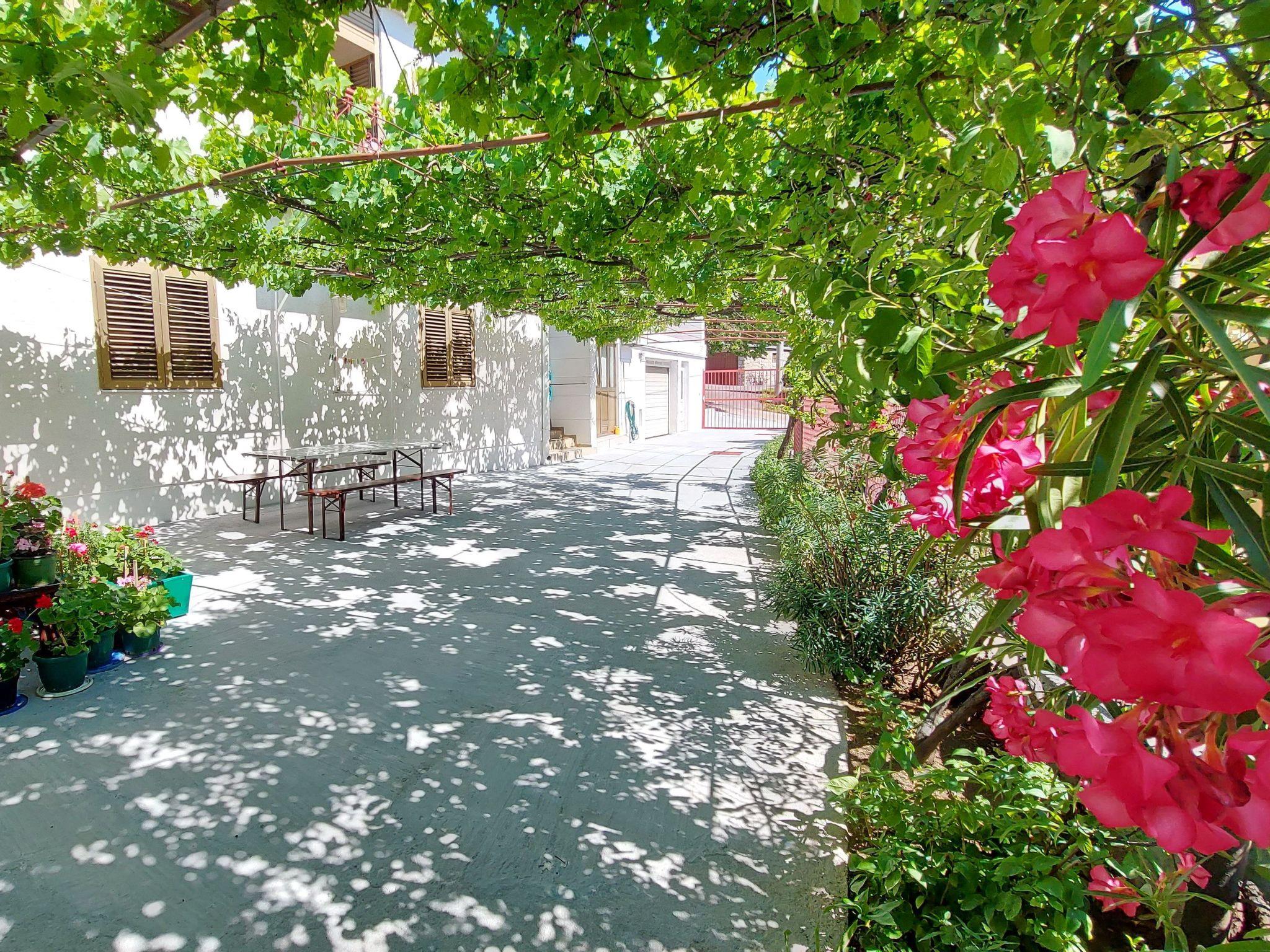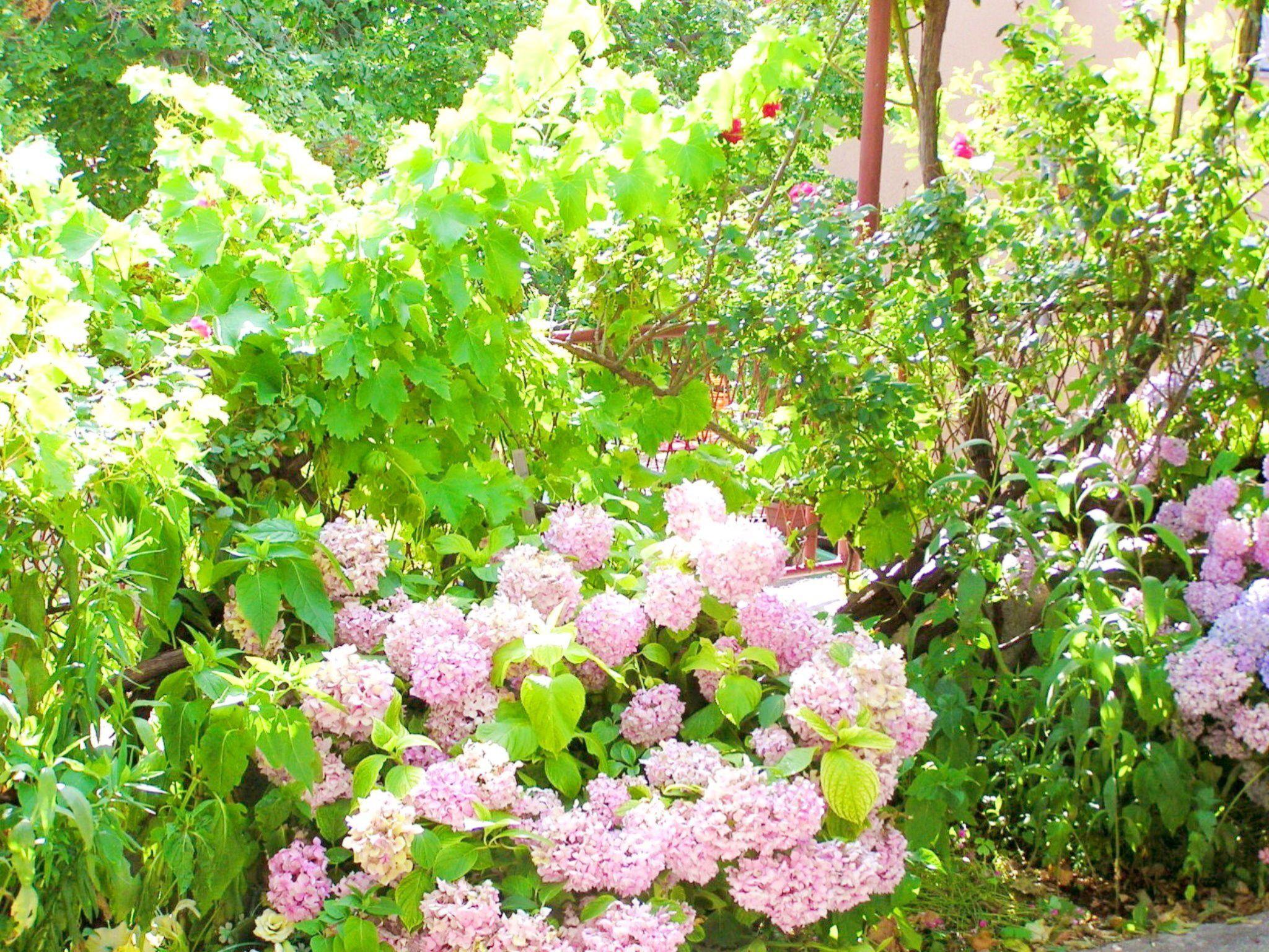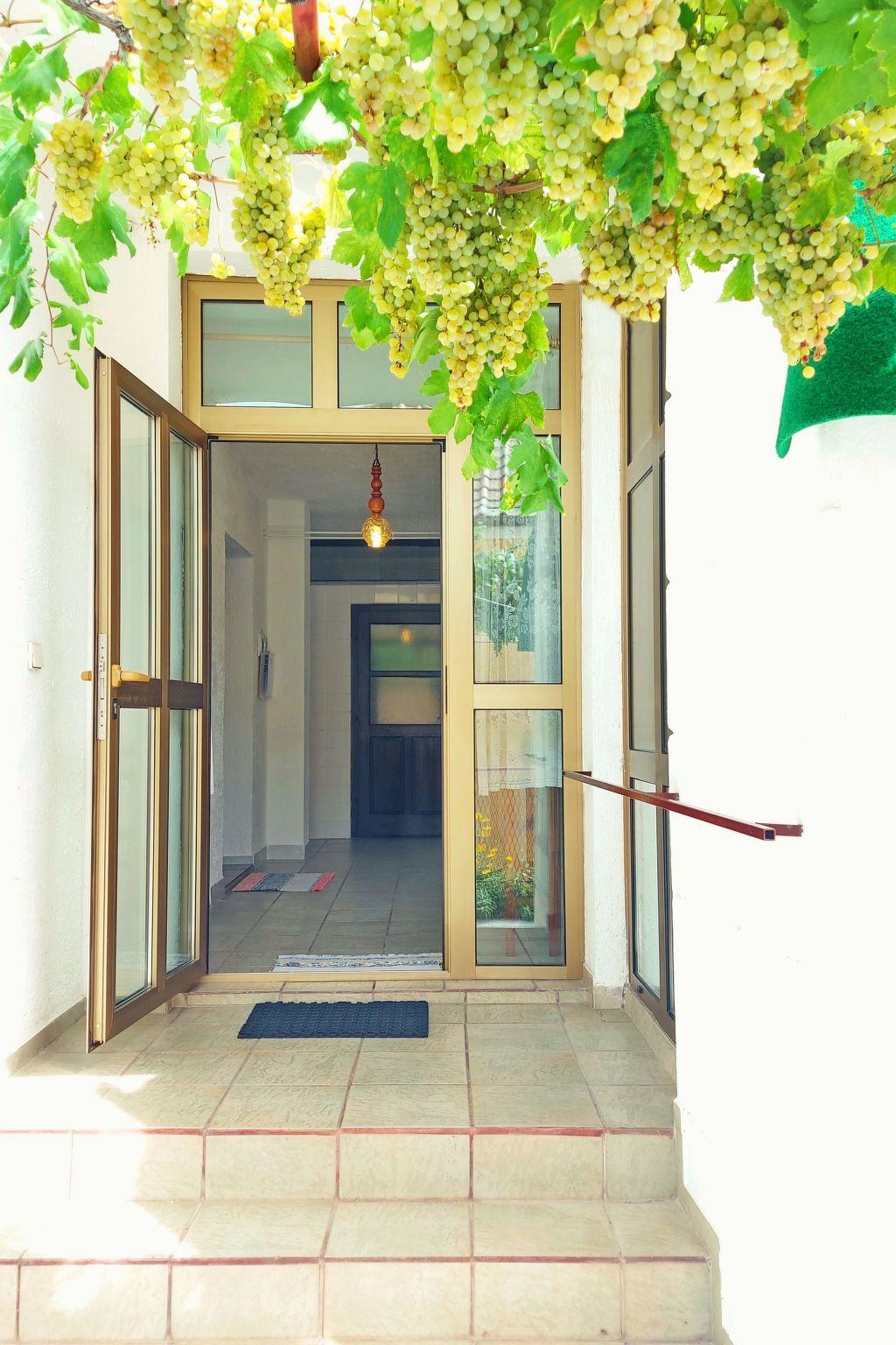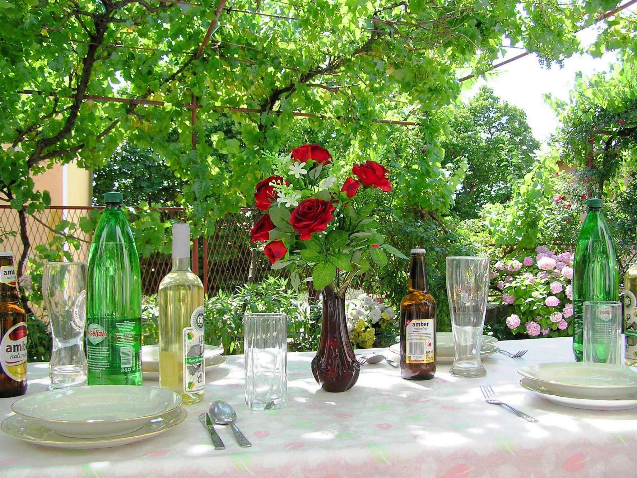 The fully fenced garden area for communal use is adorned with greenery and plants. You can enjoy a cosy barbecue evening on the shady terrace with a vine roof. There is a table with two benches, 4 chairs and a charcoal barbecue for you to use.