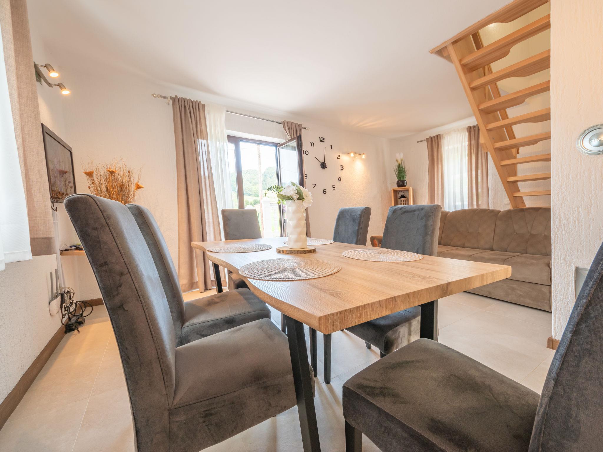 3-room house 80 m2 on 2 levels, south facing position. Living/dining room 35 m2 with satellite TV (flat screen), wood-burning stove and air conditioning. Exit to the terrace. Open kitchen (4 hot plates, oven, dishwasher, freezer, electric coffee machine). Shower/WC. Top floor: (steep stair), 1 room with sloping ceilings, ceiling height 140 - 255 cm with 1 bed (90 cm, length 190 cm), 1 french bed (160 cm, length 190 cm). Exit to the balcony. 1 room with sloping ceilings, ceiling height 140 - 255 cm with 2 beds (90 cm, length 190 cm). Exit to the balcony. Wood heating, forced-air heating. 2 balconies 6 m2, terrace 10 m2, terrace 20 m2. Terrace furniture. View of the countryside. Facilities: logs (free). Internet (WiFi, free).