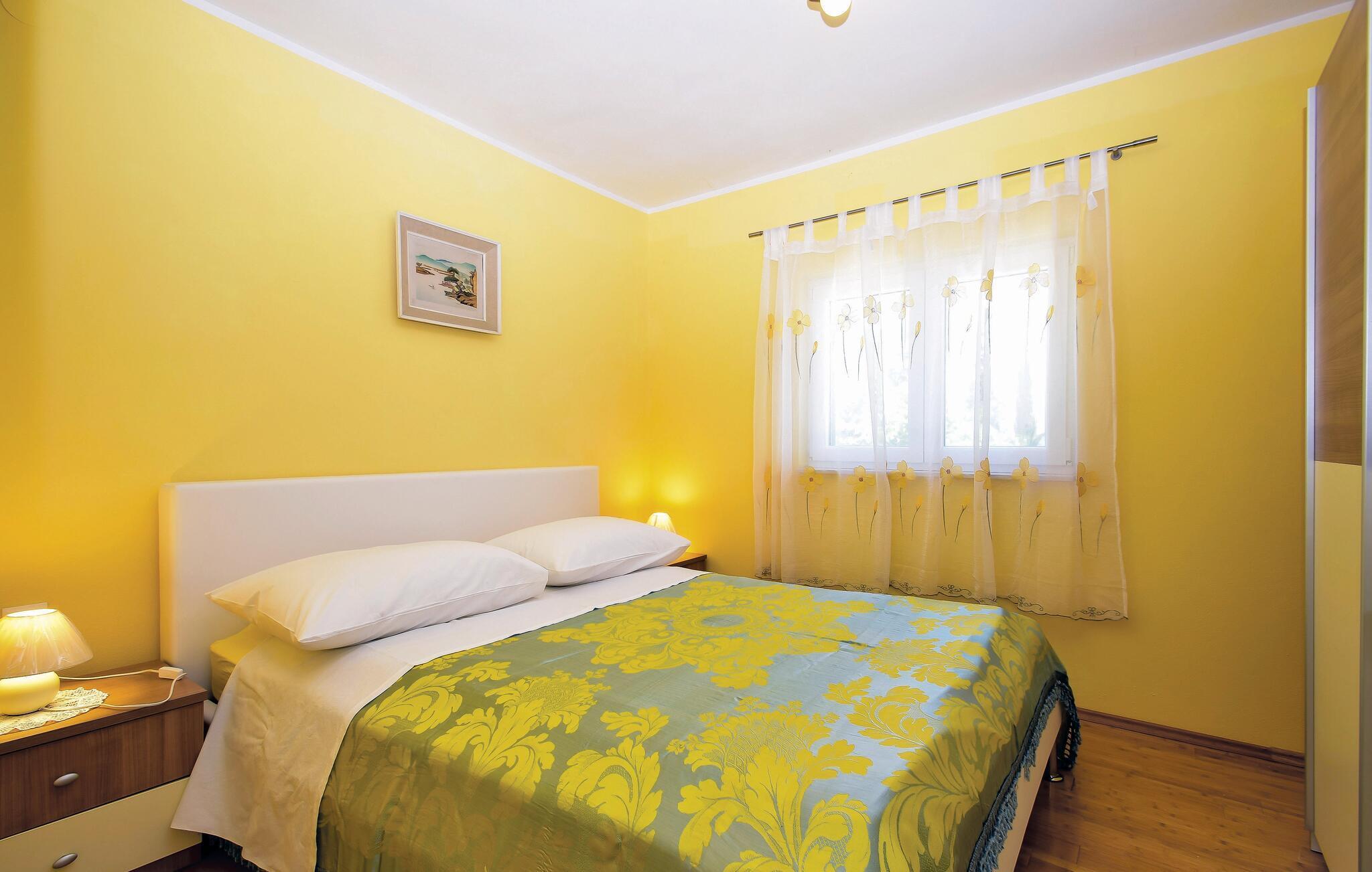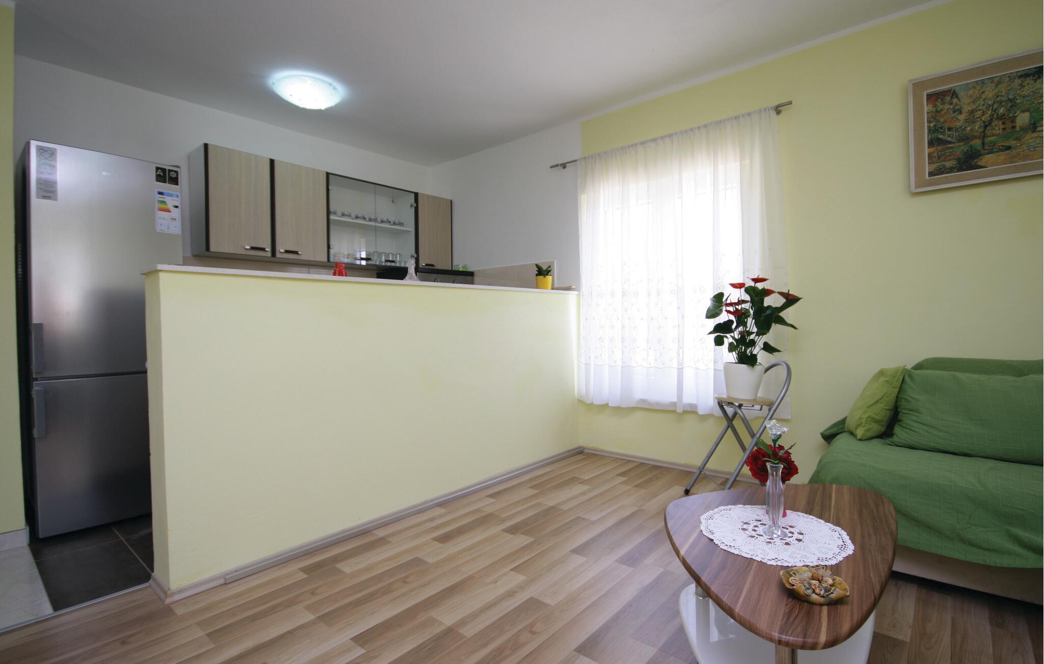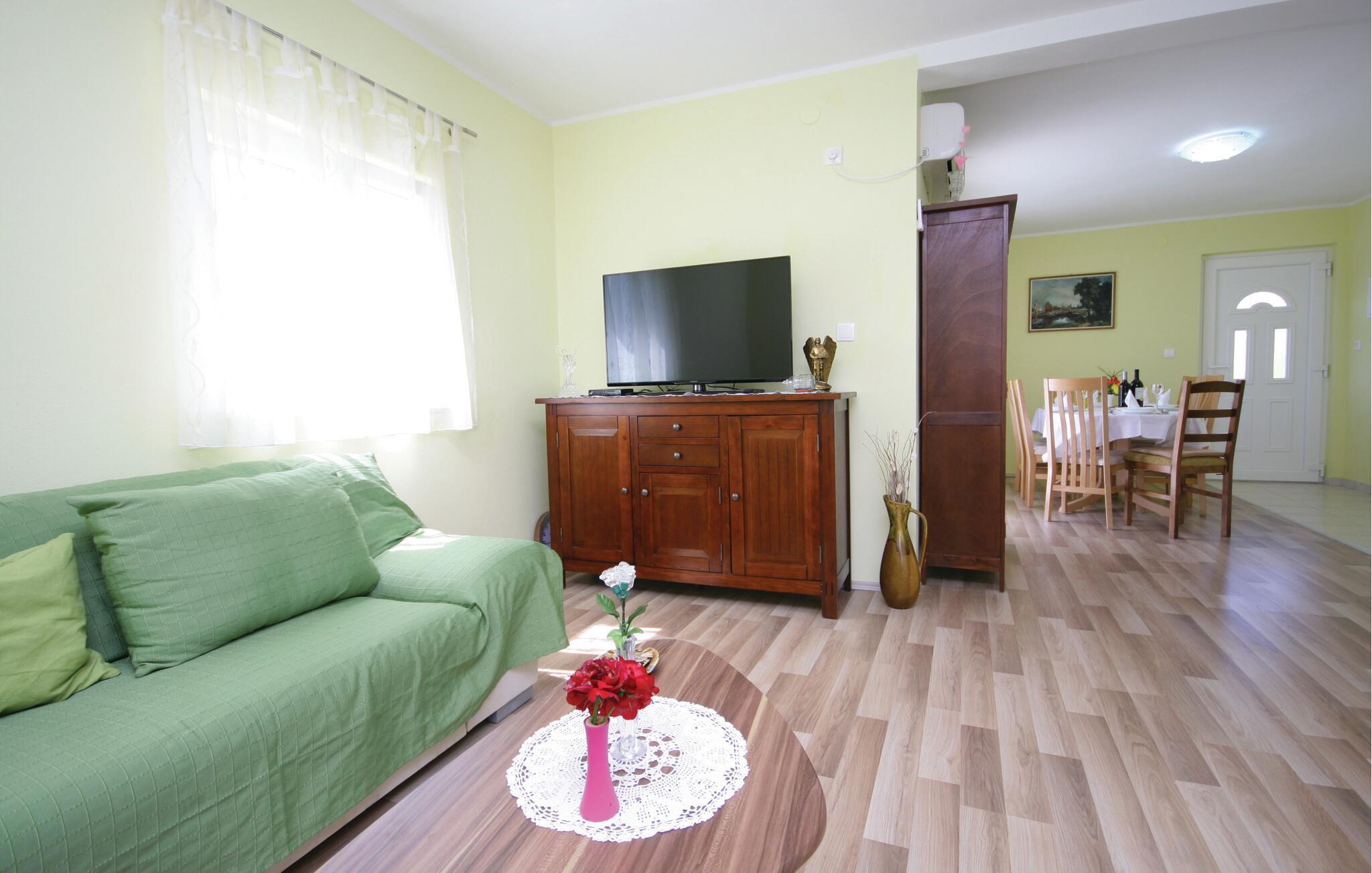 Ikke langt fra idylliske bademuligheder inviterer denne velholdte ferielejlighed til afslappende dage ved kysten. Tilbered middelhavsretter i det åbne køkken og tag plads ved det komfortable spisebord. Find jer godt til rette i sofaen, stream en spændende serie eller nyd tiden sammen med en hyggelig spilleaften.