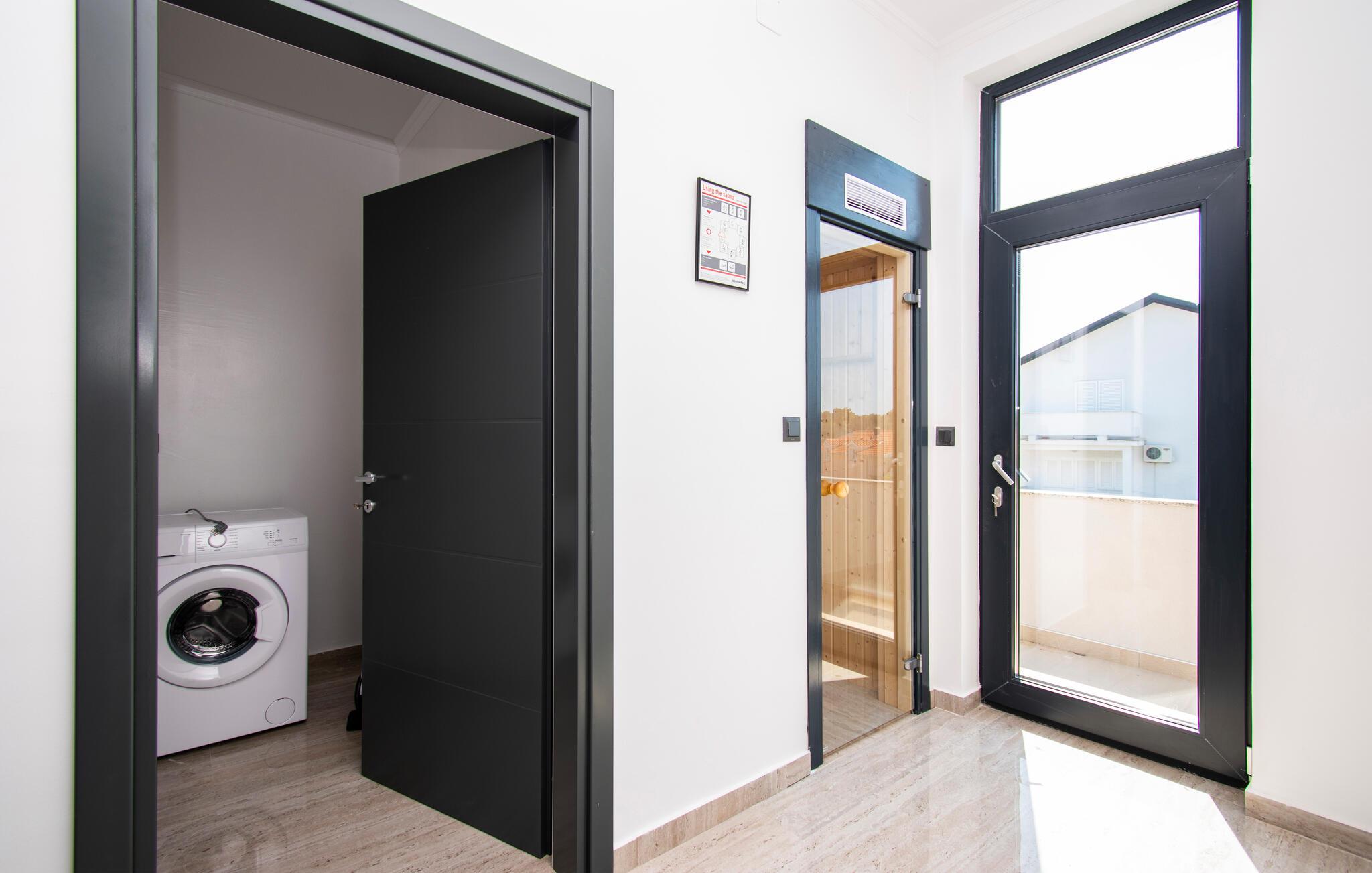 Den private sauna og fællespoolen fuldender den luksuriøse oplevelse og tilbyder jer masser af komfort og velvære.