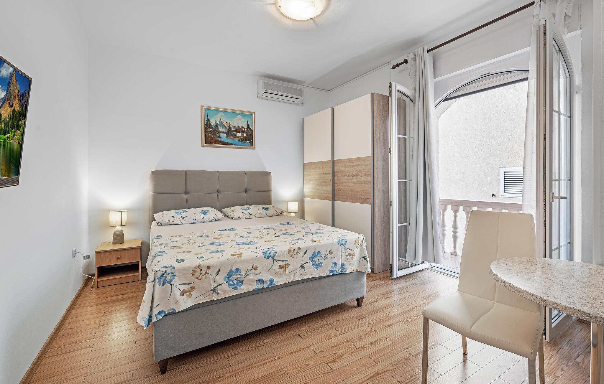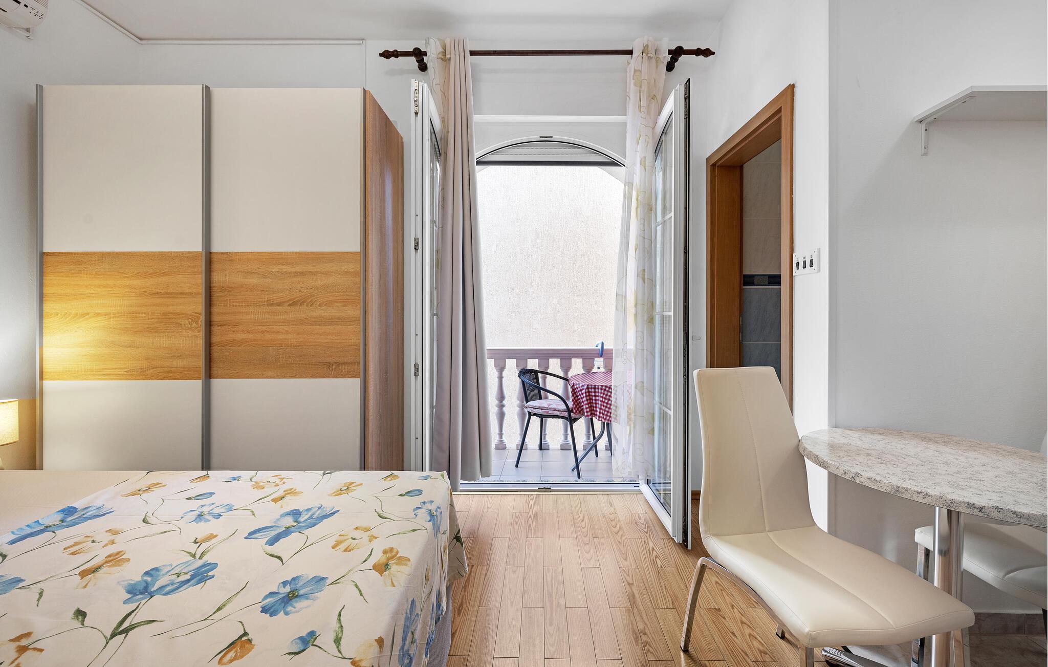 Kom og find jer godt til rette. Denne smagfulde etværelseslejlighed giver jer alt, hvad I skal bruge til et afslappende ophold. Den hyggelige atmosfære og det fine design lægger op til at nyde livet og have det rart. Nyd morgenkaffen på balkonen med panoramaudsigt over havet - en perfekt start på dagen. Lejligheden er optimal til to, men der er også andre ferielejligheder i huset, hvis I vil rejse med venner eller familie.