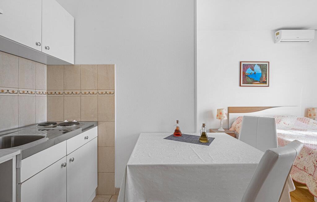Kom og find jer godt til rette. Denne smagfulde etværelseslejlighed giver jer alt, hvad I skal bruge til et afslappende ophold. Den hyggelige atmosfære og det fine design lægger op til at nyde livet og have det rart. Nyd morgenkaffen på balkonen med panoramaudsigt over havet - en perfekt start på dagen. Lejligheden er optimal til to, men der er også andre ferielejligheder i huset, hvis I vil rejse med venner eller familie.