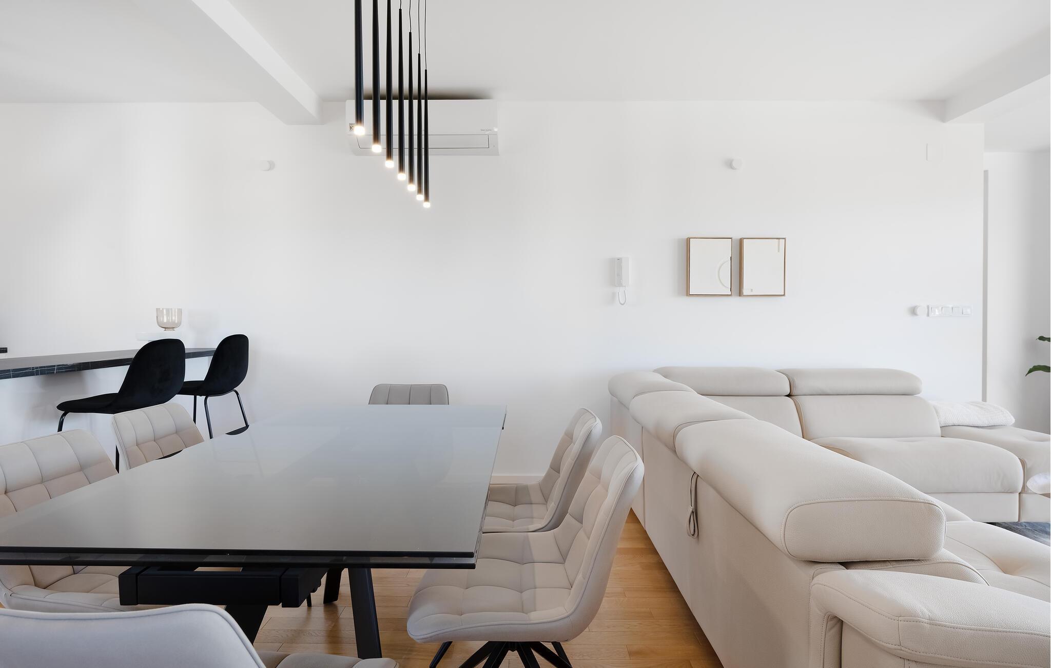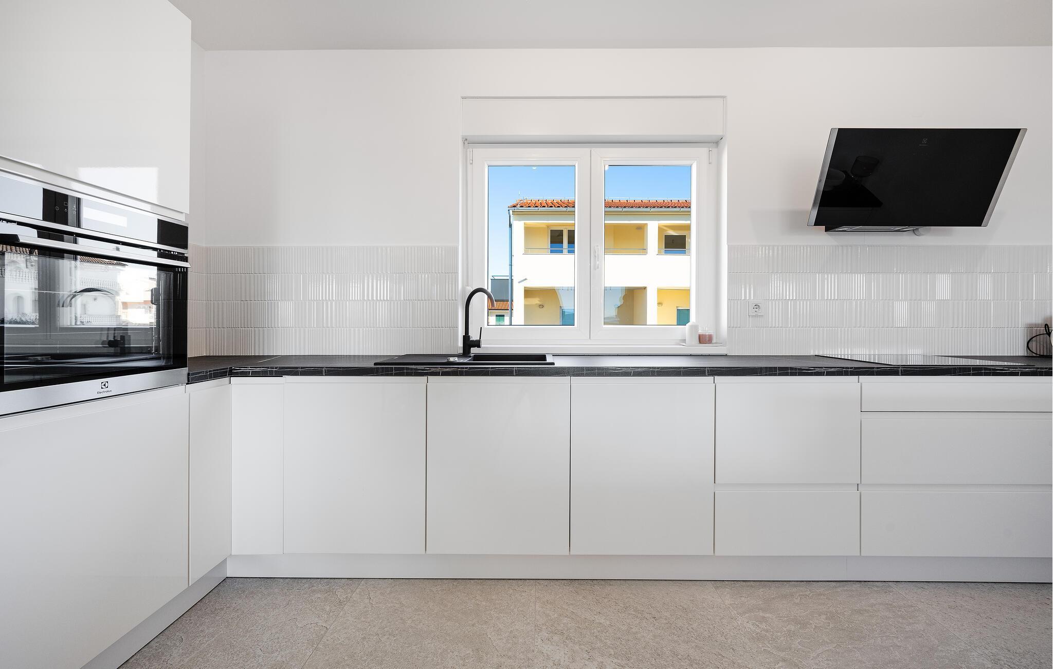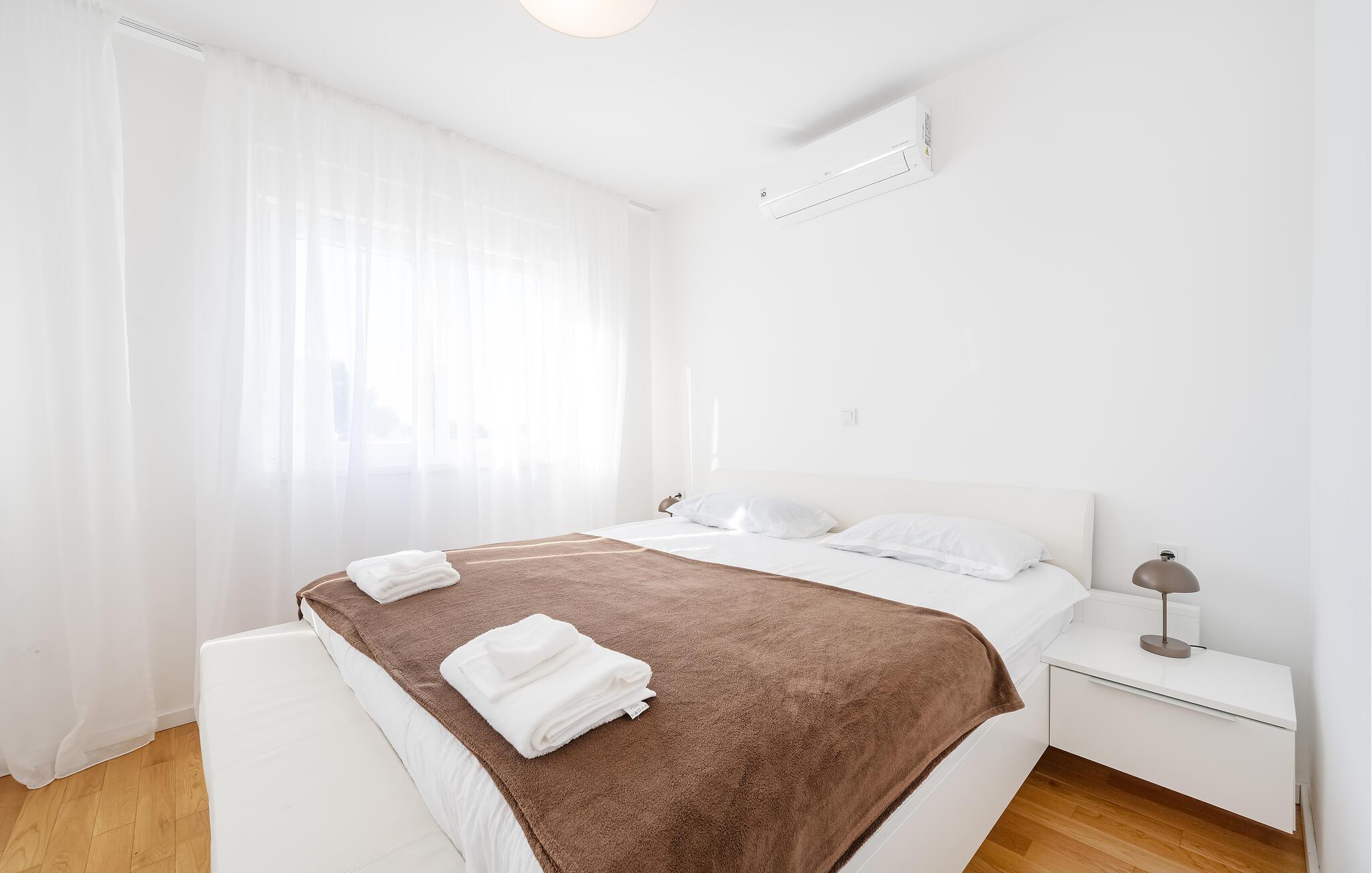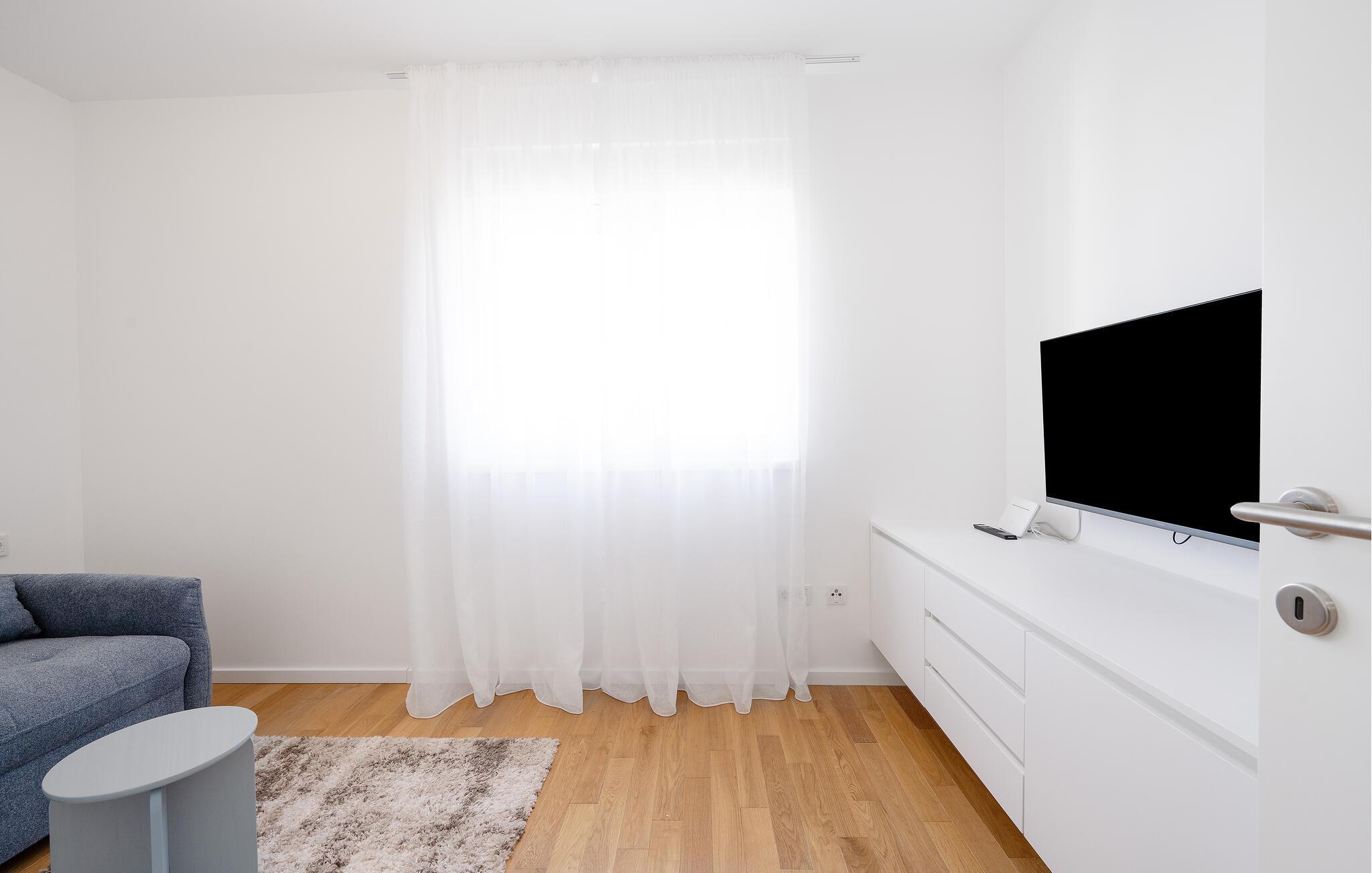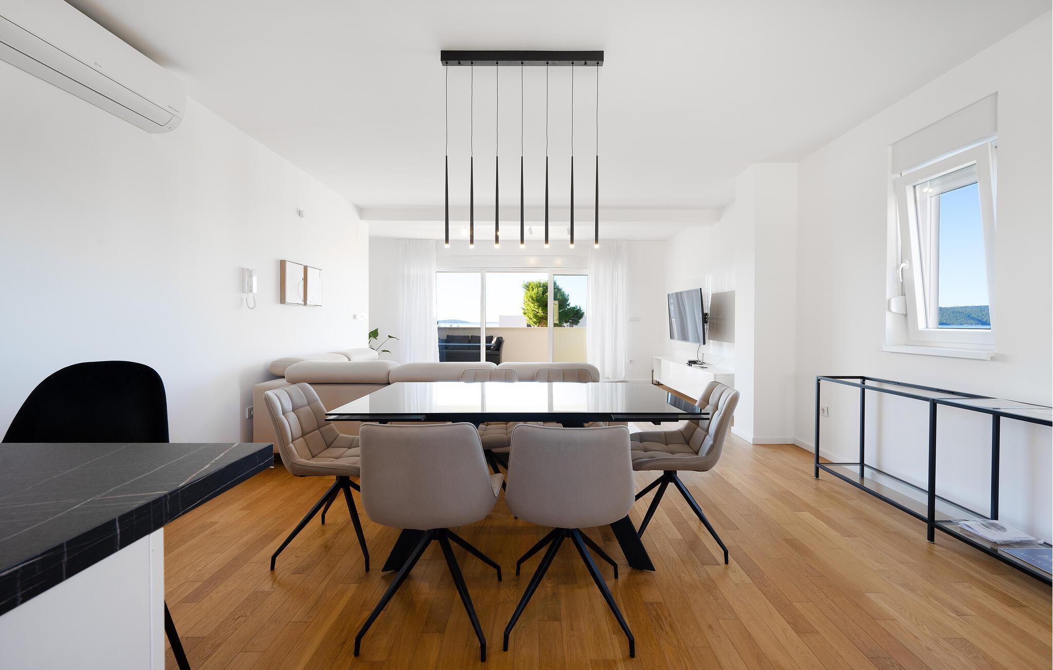 Nyd komfort, elegance og muligheden for spontant at gå til havet for en svømmetur, mens I tilbringer en afslappende ferie i denne lyse, moderne ferielejlighed. Tilbered kroatiske specialiteter eller romantiske middage i det åbne designerkøkken. Find jer godt til rette i den store, indbydende sofa, stream en spændende serie eller organiser hyggelige spilleaftener.