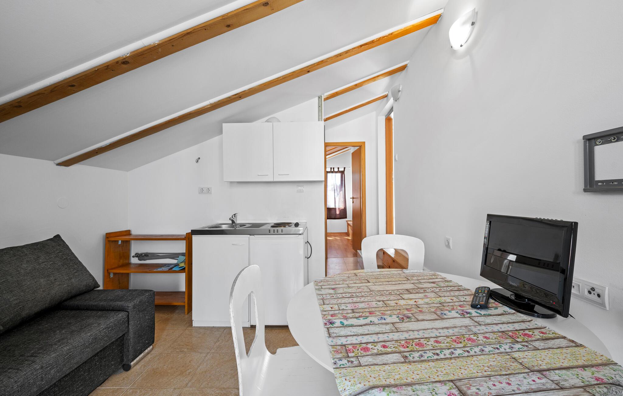 Denne smukke penthouselejlighed byder jer velkommen i første række ved havet og tilbyder et hyggeligt hjem, mens I udforsker denne charmerende region. Brug det funktionelle køkken til at tilberede små måltider, forsyninger til jeres udflugter eller en picnic til stranden. Planlæg jeres aktiviteter ved spisebordet og synk ned i den komfortable sofa med en god bog eller en film efter en lang dag.