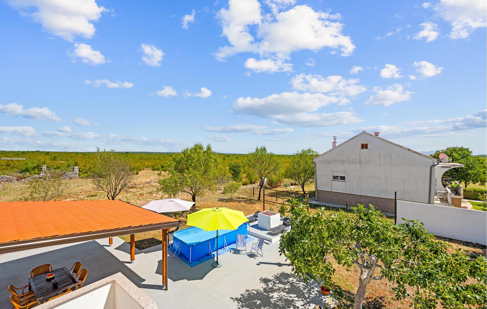 Om morgenen inviterer terrassen jer til at nyde en solid morgenmad, mens I kigger ud over det blidt bølgende landskab. Tag en forfriskende dukkert i poolen eller nyd et sjovt spil vandpolo. Om aftenen kan I grille en saftig bøf og afslutte dagen på en afslappet måde.