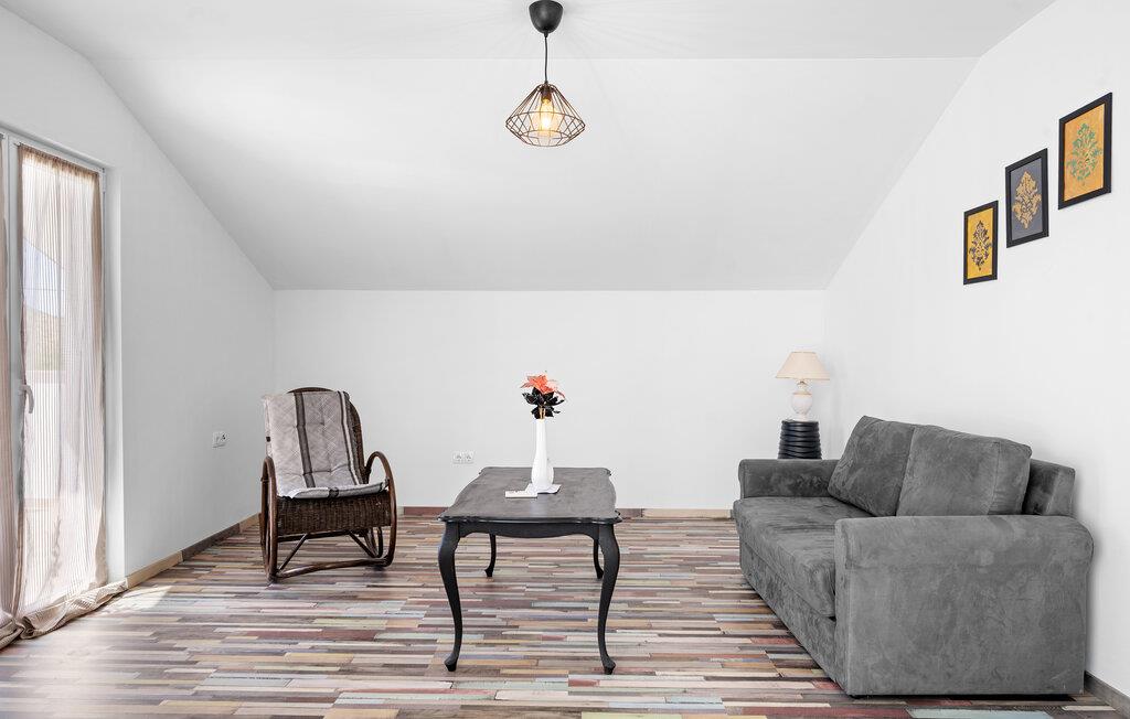 Denne lejlighed er møbleret med enkel elegance og tilbyder alt, hvad I behøver for en afslappende pause fra hverdagen. Slap af i den komfortable sofa med en kop kaffe, stream en god serie eller tryl et lækkert måltid frem til jer og familien i det moderne køkken.