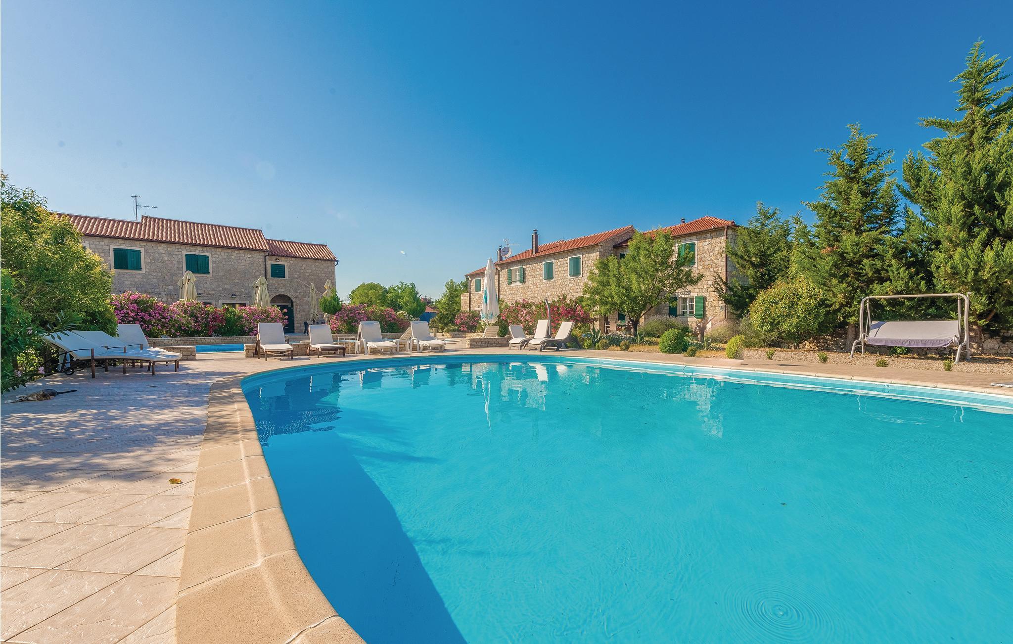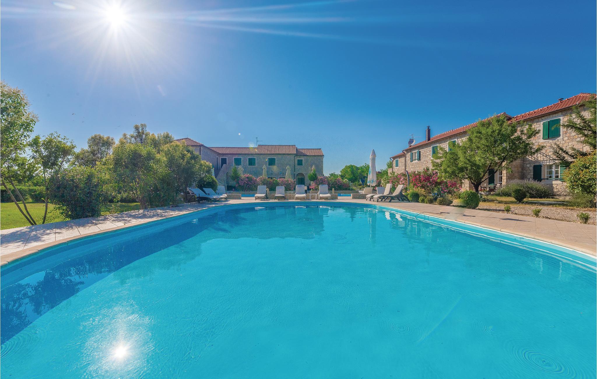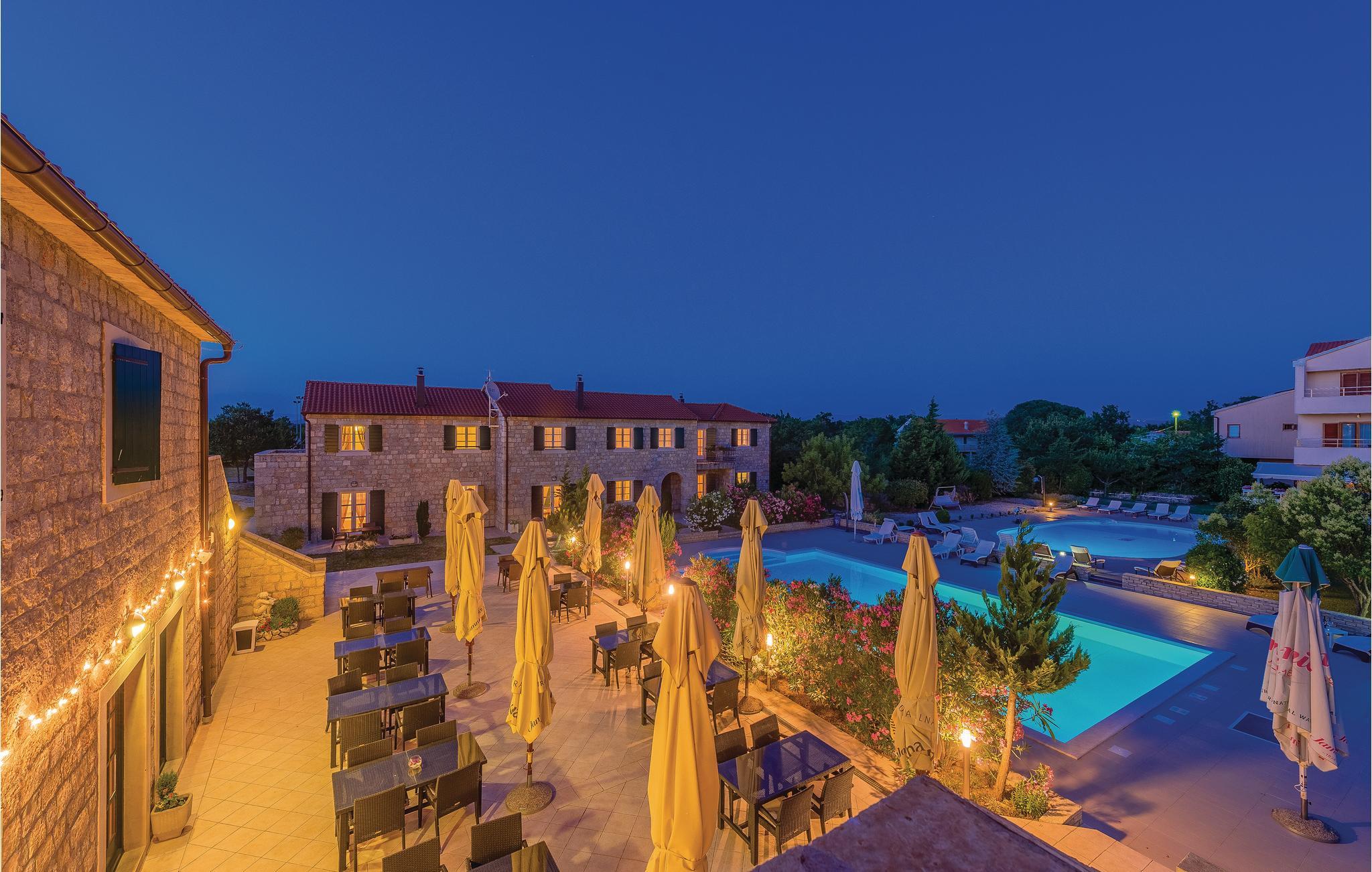 På denne 50.000 m² store, indhegnede grund bliver I budt velkommen med en lille drink. Boligenhederne strækker sig over to etager og er forbundet med hinanden af en udendørs trappe. Når I har lyst til en forfriskende dukkert, har I to store swimmingpools til rådighed, som er til fri fælles afbenyttelse med andre gæster (ca. 40 personer har adgang til de to pools). Derudover har I en tennisbane, basketball- og minifodboldbane til rådighed. Mod betaling er der mulighed for en bådtur til nationalparken Krka, paintball og cykeludlejning. Der er også mulighed for en guidet tur gennem vinbjergene med indlagte prøvesmagninger. A la carte-restauranten er et must at besøge!