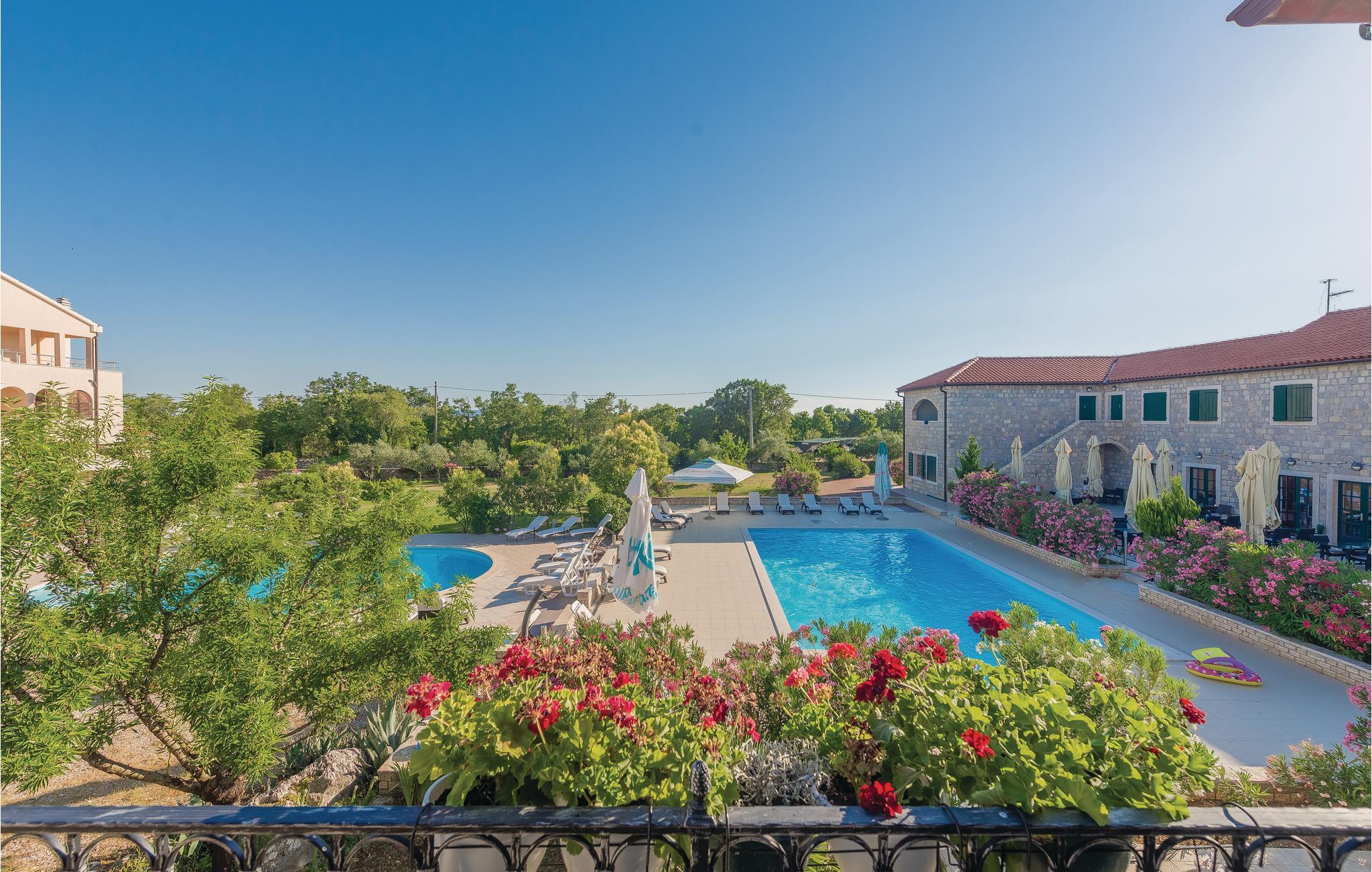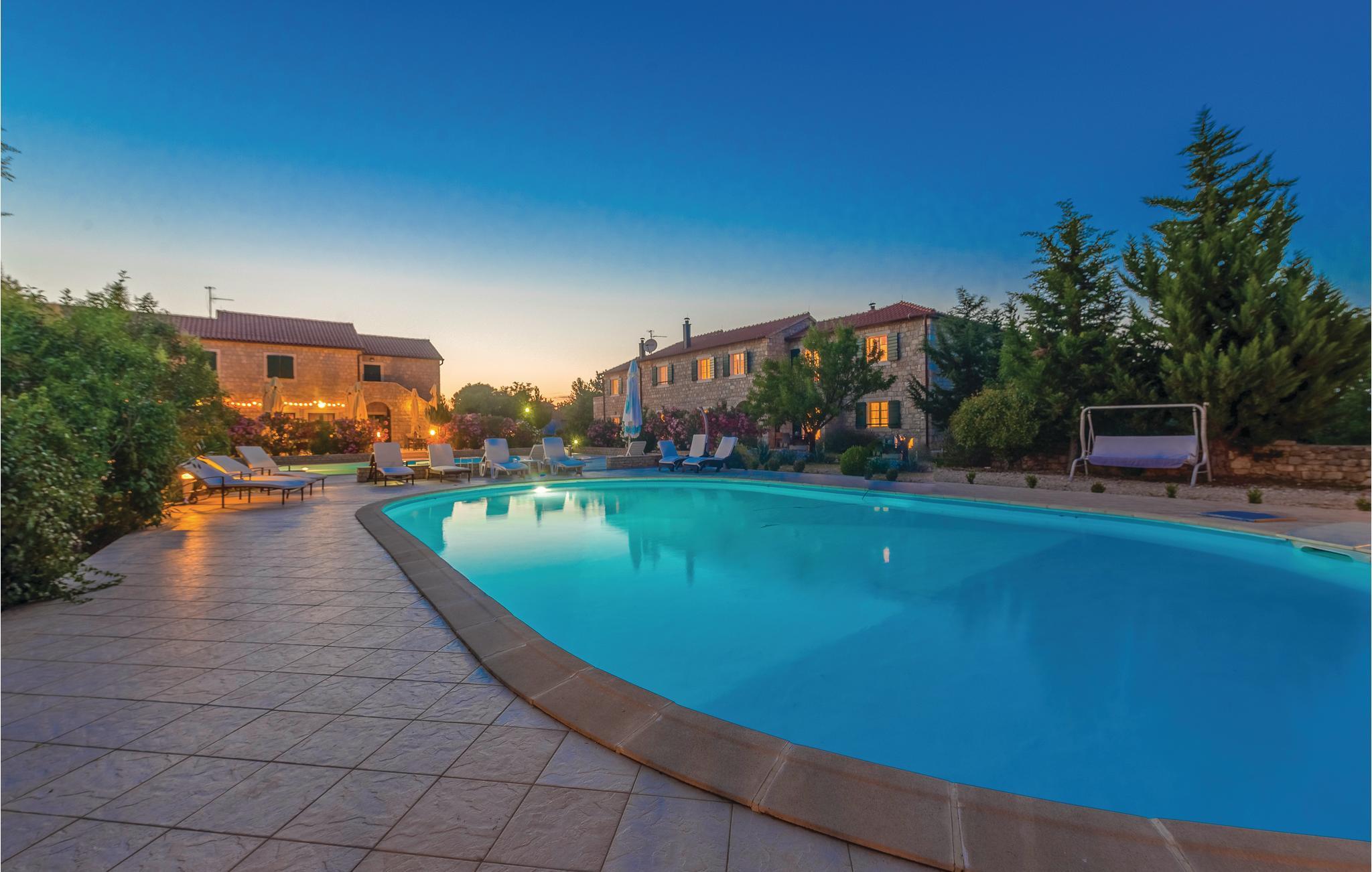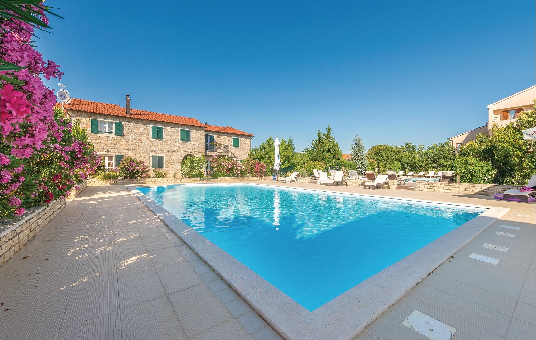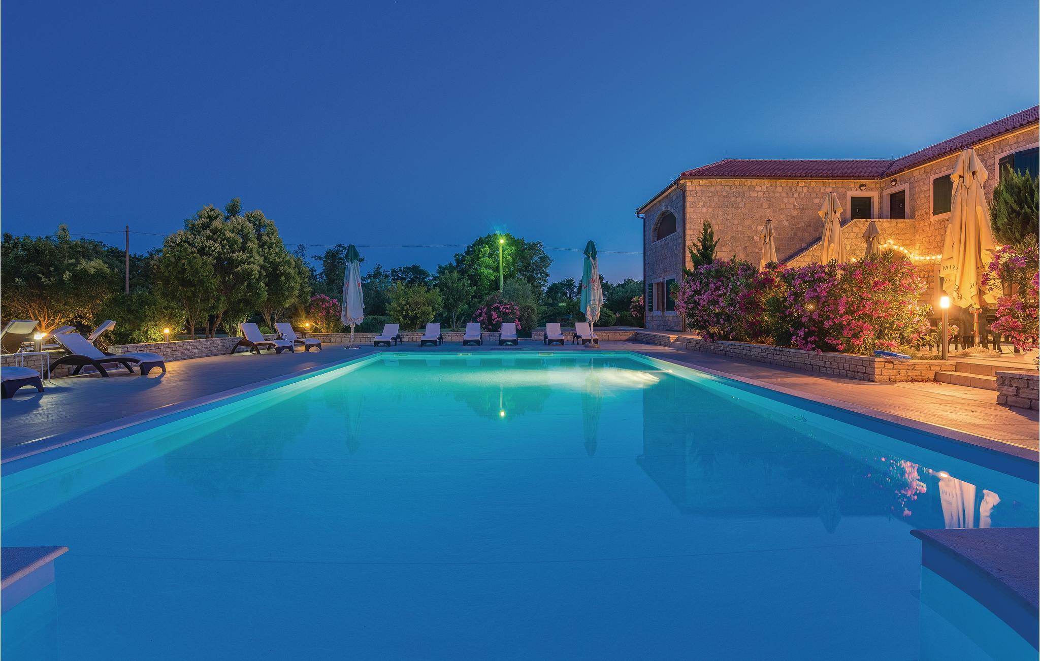 På denne 50.000 m² store, indhegnede grund bliver I budt velkommen med en lille drink. Boligenhederne strækker sig over to etager og er forbundet med hinanden af en udendørs trappe. Når I har lyst til en forfriskende dukkert, har I to store swimmingpools til rådighed, som er til fri fælles afbenyttelse med andre gæster (ca. 40 personer har adgang til de to pools). Derudover har I en tennisbane, basketball- og minifodboldbane til rådighed. Mod betaling er der mulighed for en bådtur til nationalparken Krka, paintball og cykeludlejning. Der er også mulighed for en guidet tur gennem vinbjergene med indlagte prøvesmagninger. A la carte-restauranten er et must at besøge!