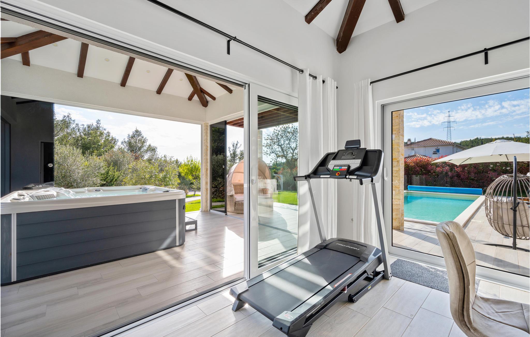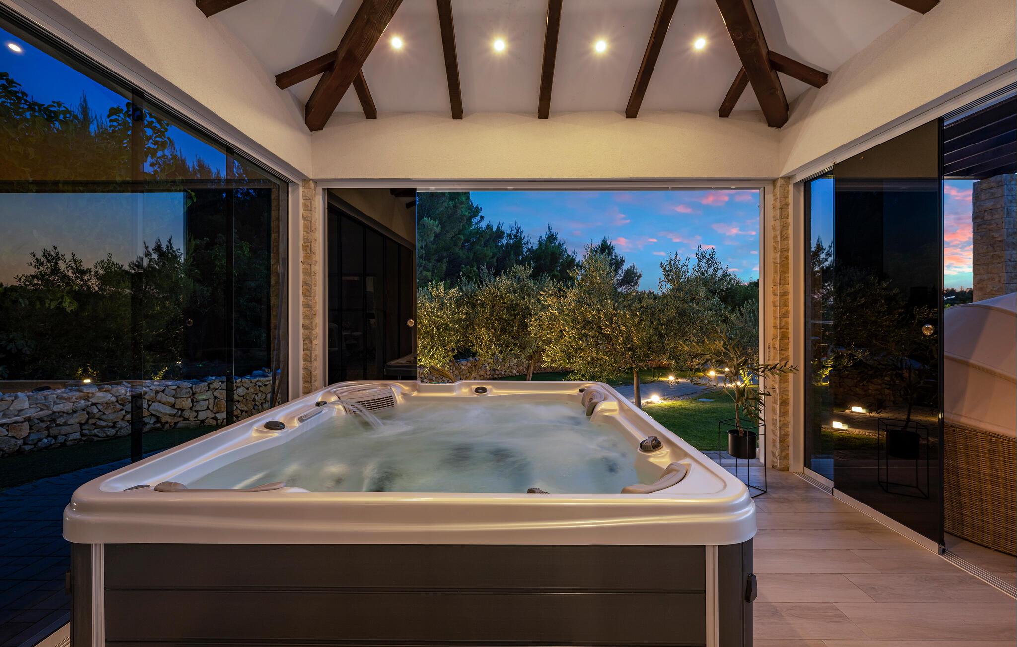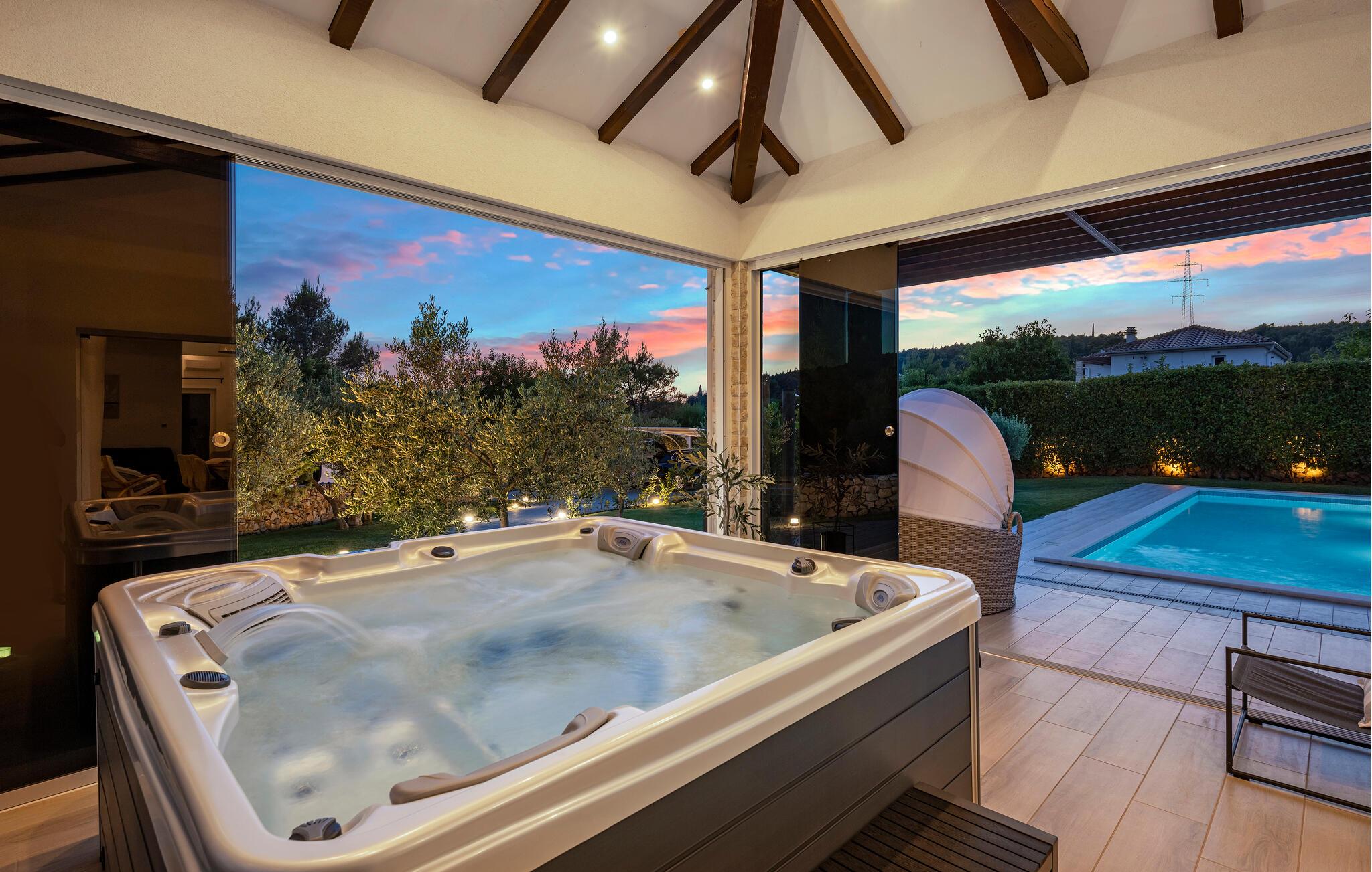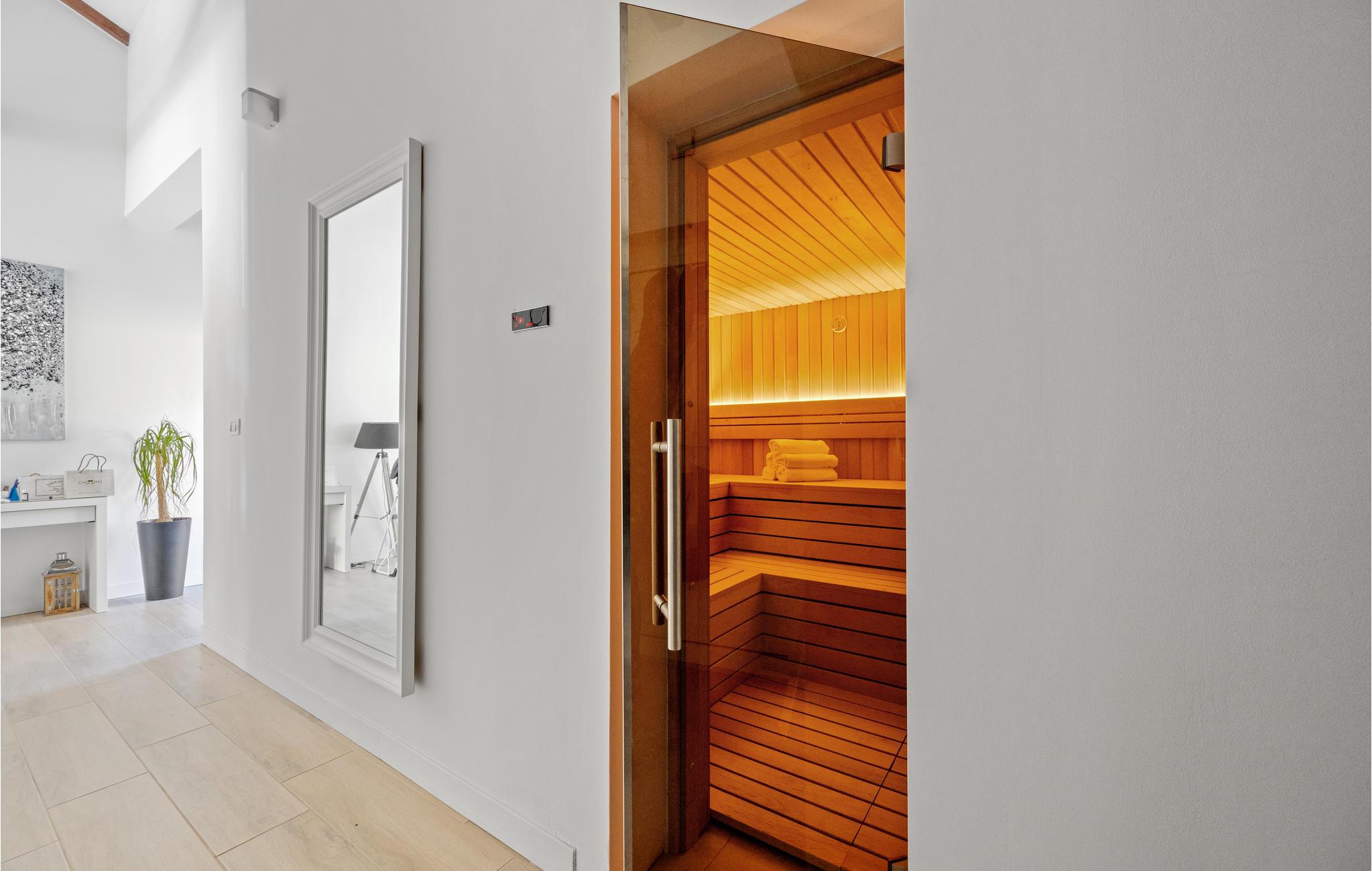 Den private pool er opvarmet og kan benyttes hele året rundt, og der er desuden sauna og jacuzzi.