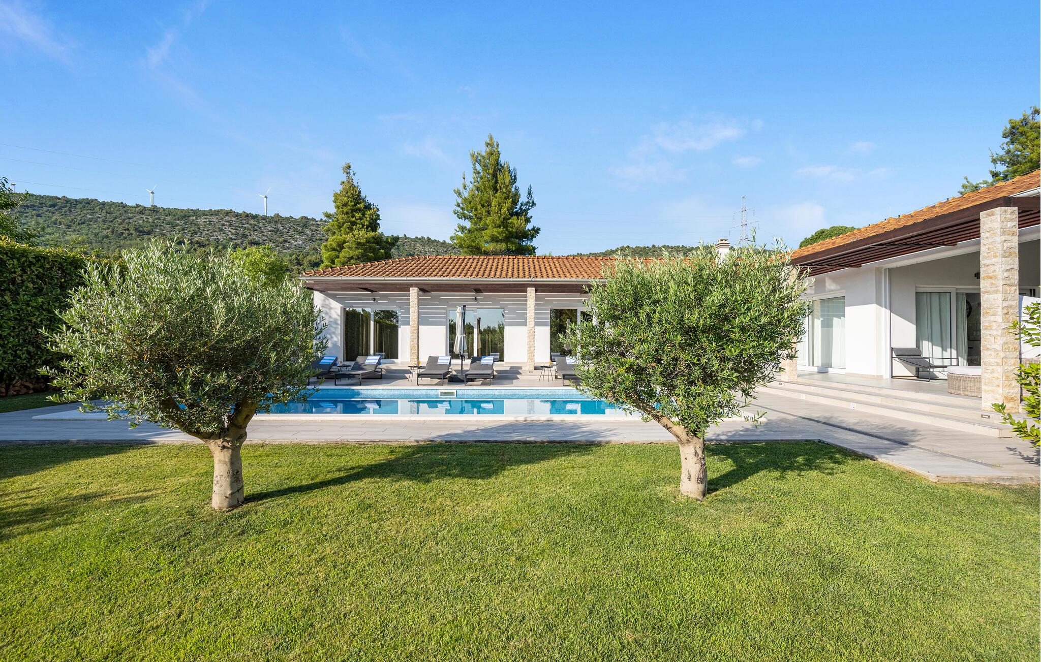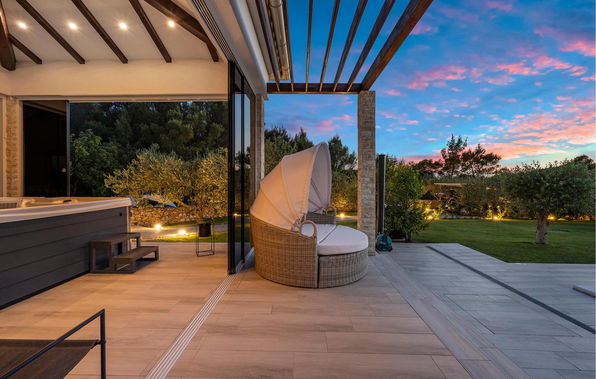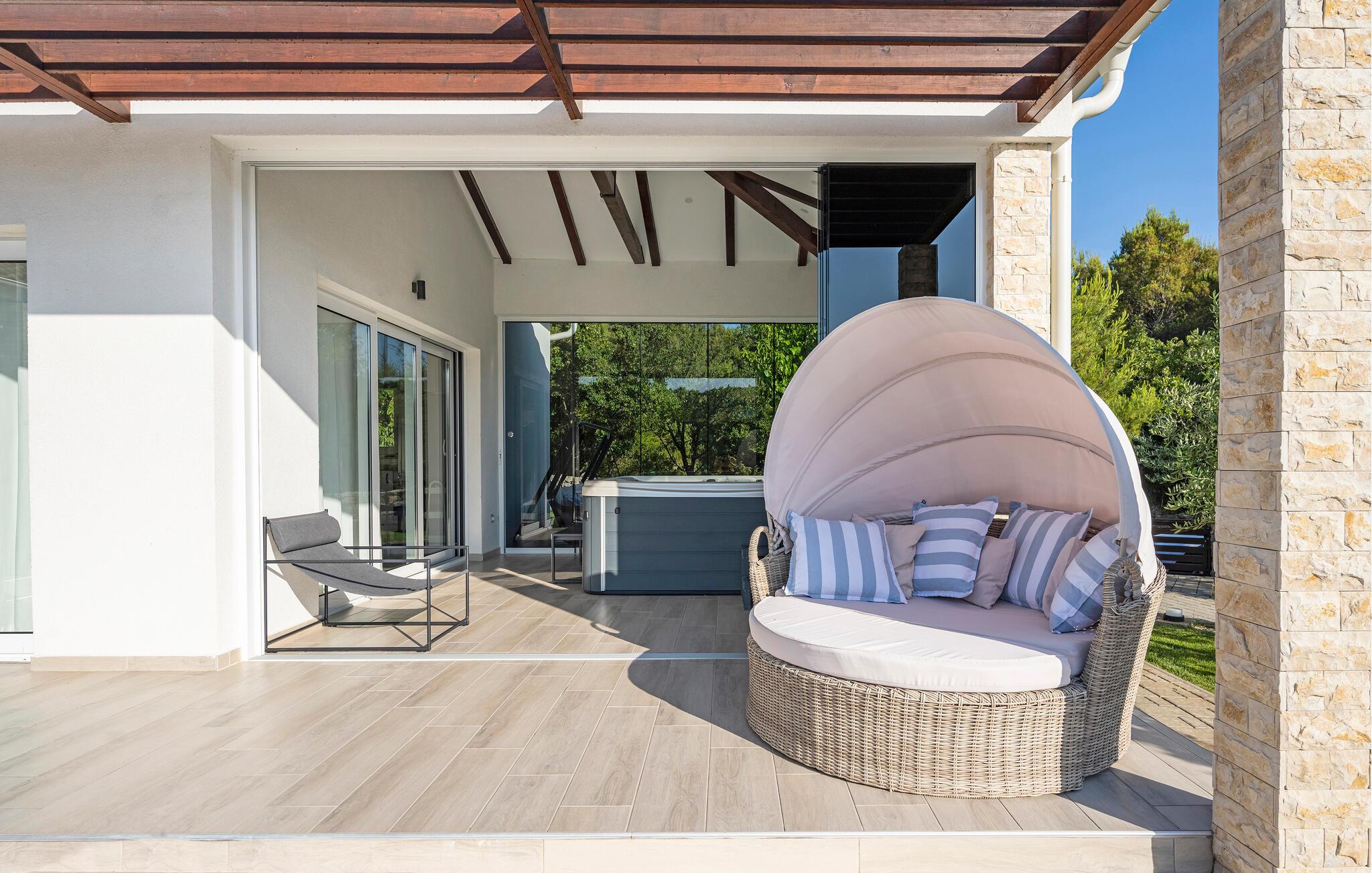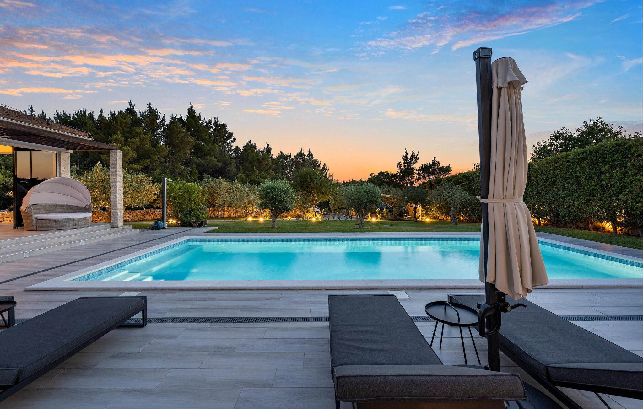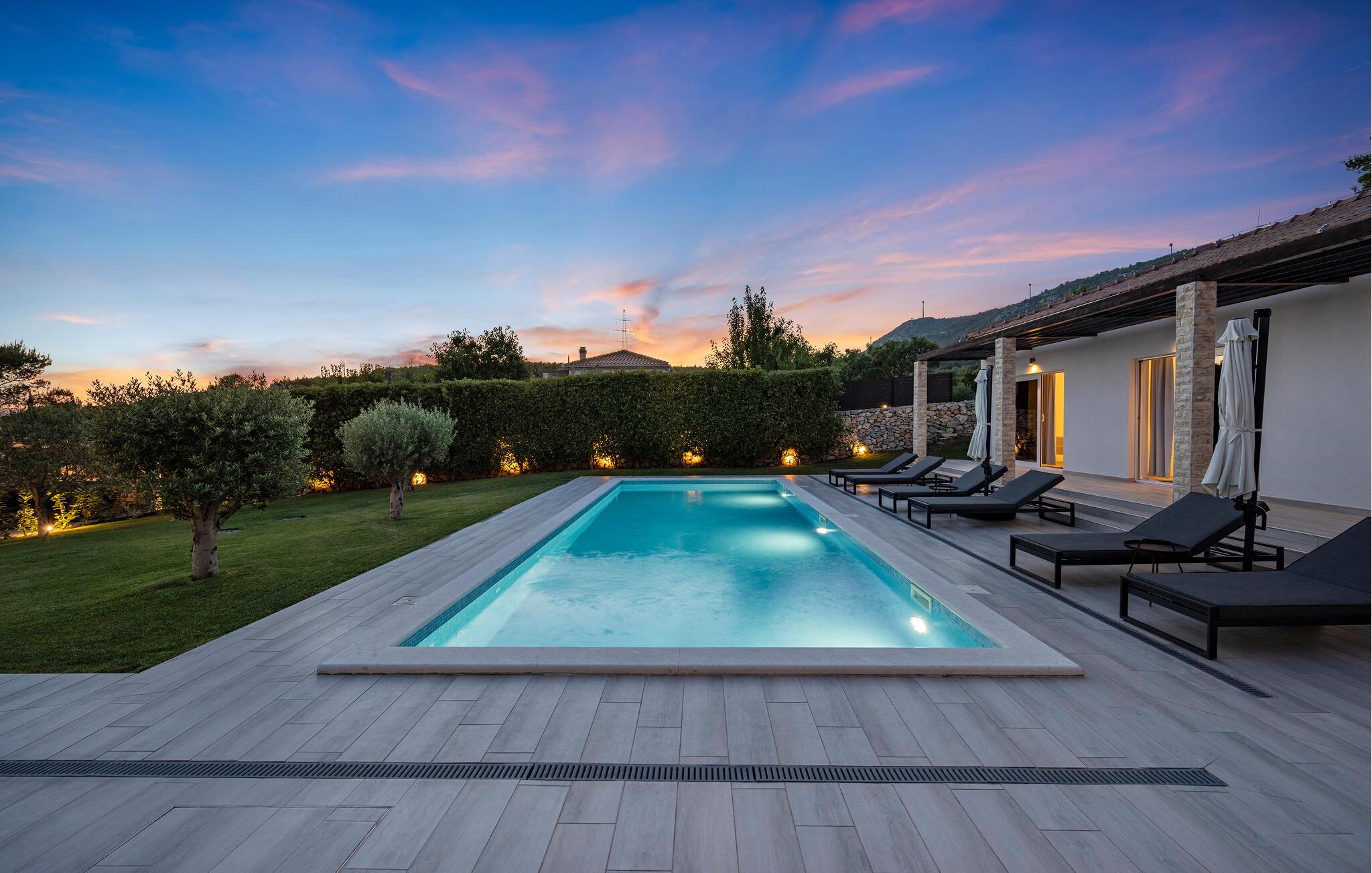 Den private pool er opvarmet og kan benyttes hele året rundt, og der er desuden sauna og jacuzzi.