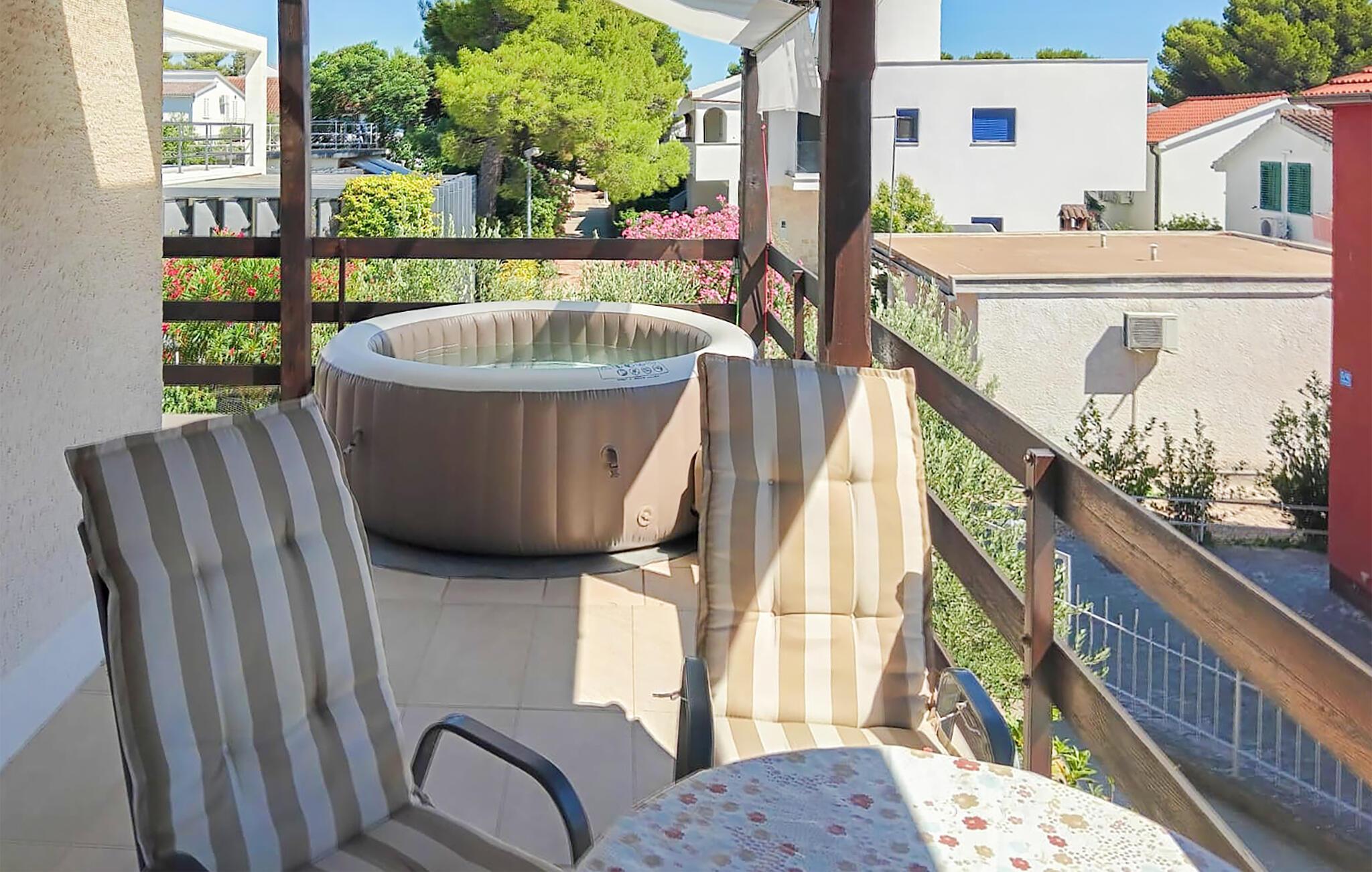 Disse enkelt indrettede ferielejligheder med havudsigt ligger i samme private ejendom og er oplagte at leje sammen hvis I er mange. Genial beliggenhed, da den skønne kiesstrand og det klare hav, kan nå på få minutters gang. Ejendommen har en skøn forhave med smukke og velduftende mediterrane vækster, til fælles brug for husets gæster. Jadrija er en fredelig lille by med skønne strande. Fra havnen er der en betagende udsigt du over kanalen i Šibenik og fæstningen Sv. Nikola. Fra denne populære badeby anbefaler vi bådsudflugter til Šibenik eller cykelture til Vodice.