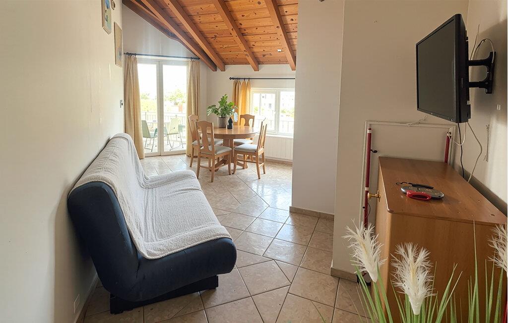 Lejligheden på anden sal er ideel til et par eller en lille familie. Nyd den åbne stue og spisestue med sofa, spisebord og store vinduer. Det rustikke træloft giver rummet et varmt præg. Tilbered enkle måltider og nyd at tilbringe tid sammen ved spisebordet med udsigt over det grønne. Læn jer tilbage i sofaen efter en dag på stranden eller tilbring rolige aftener med at se en god film.