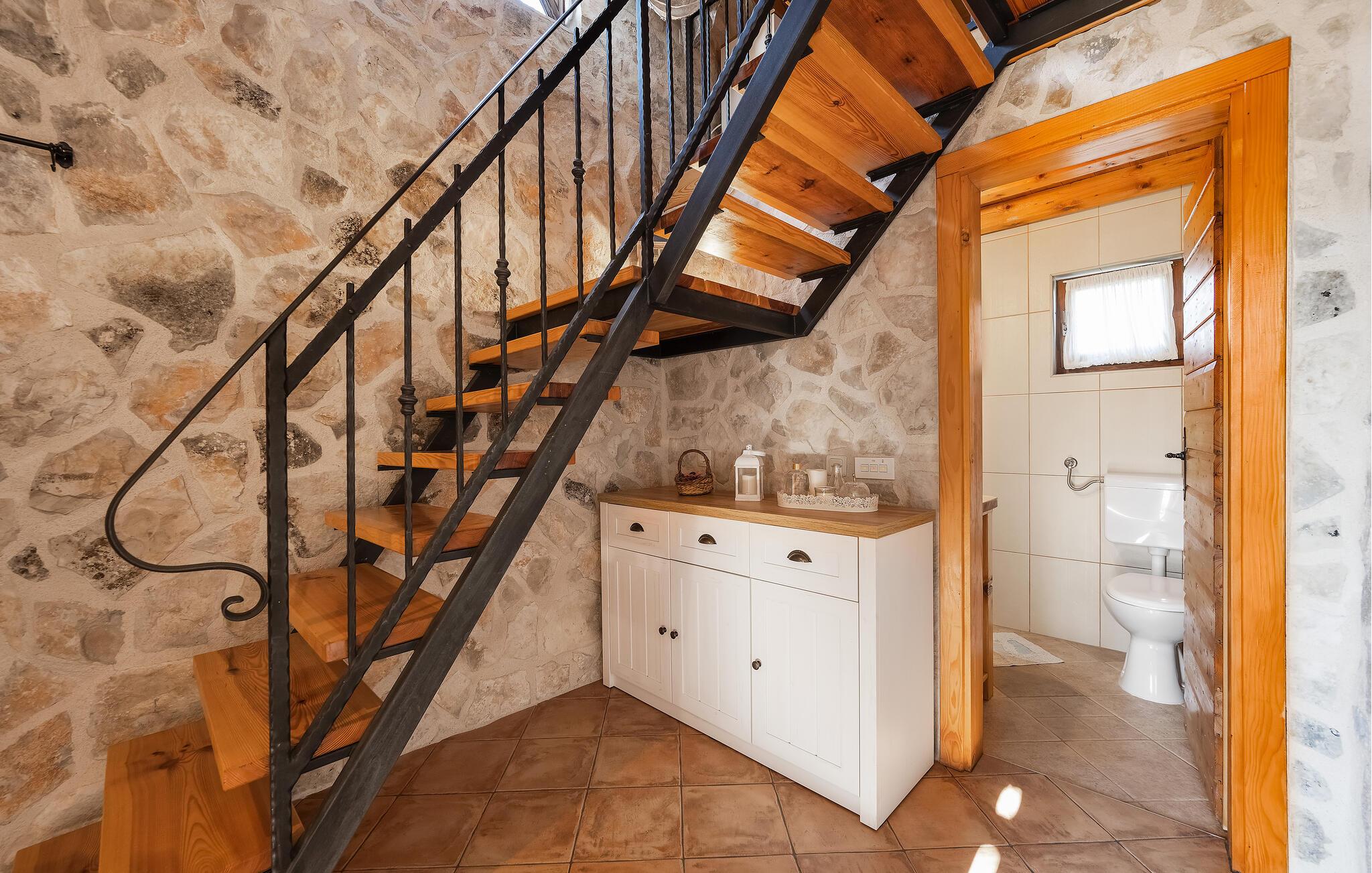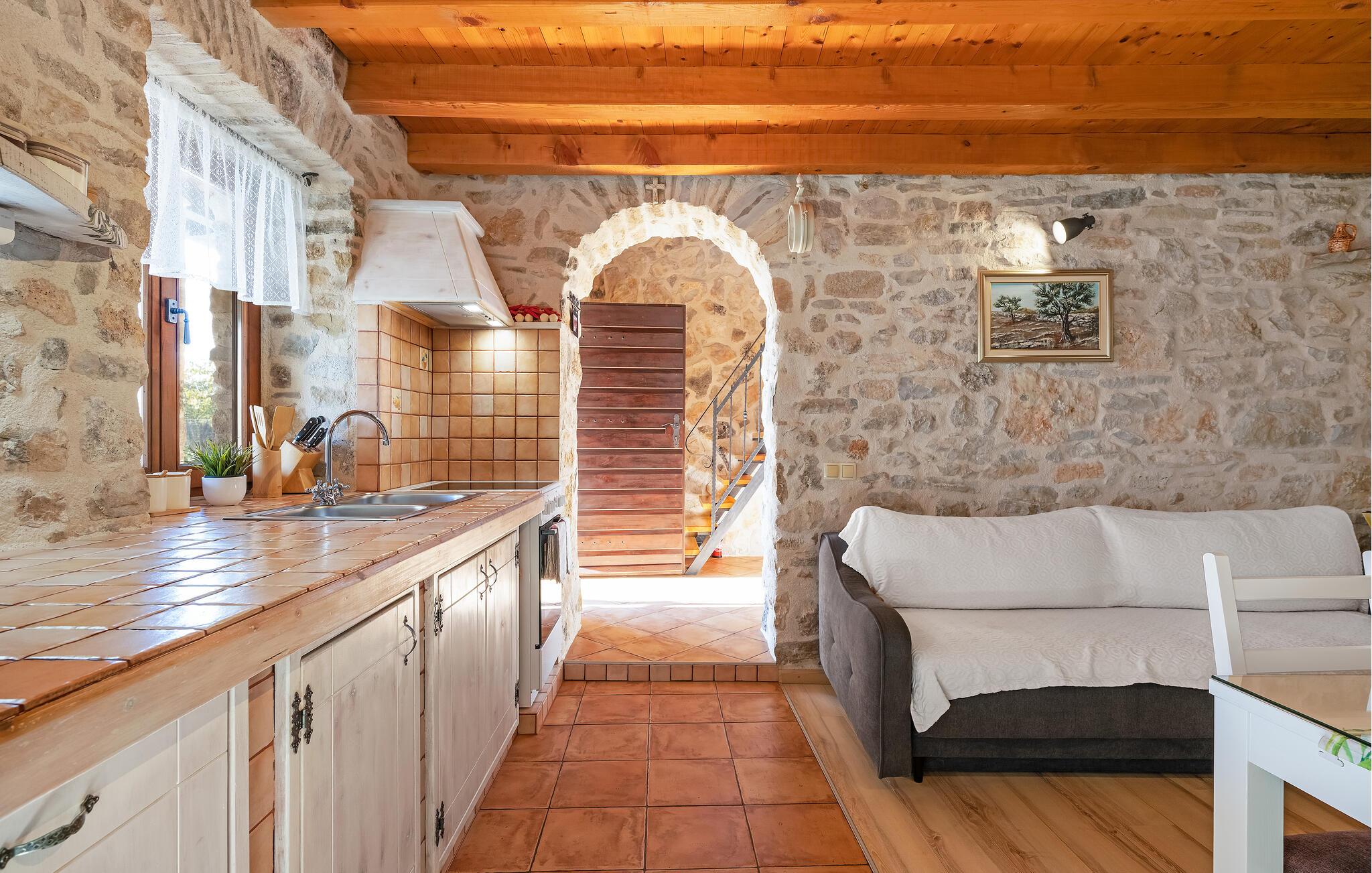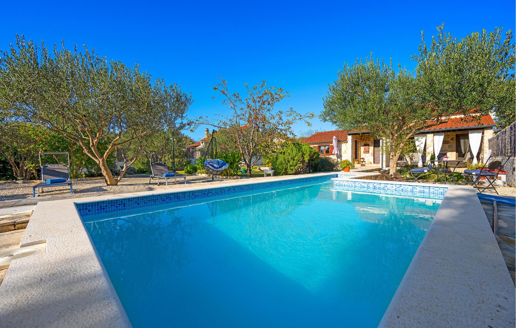 Dette charmerende feriehus af natursten, ligger i en lille, rolig landsby ikke langt fra den større by Šibenik, i Krk nationalparken. Hemsen i huset har adgang ad en stejl trappe og soveværelset med badeværelse har selvstændig indgang udefra, via den overdækkede terrasse. I kan tilbringe skønne timer i solen ved poolen, jeres børn kan glæde sig til forskellige former for legeredskaber i haven. I bor i gå afstand af den vidunderlige Nationalpark Krka, som er oplagt at opleve i løbet af ferien. Her er der vådområder med glasklart vand hvor I kan se fiskene svømme og smukke vandfald, frodige bakker og historiske ruiner. Besøg også den historiske by Skradin og det antikke Scardona, en smuk by med et bredt udvalg af restauranter. Nærmeste strand og havet: 10 km.