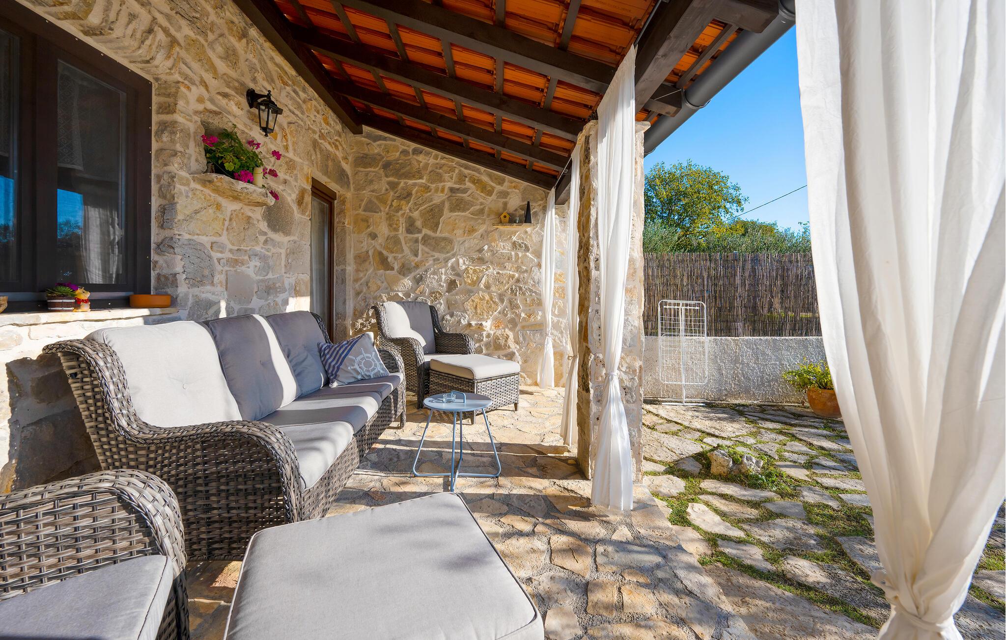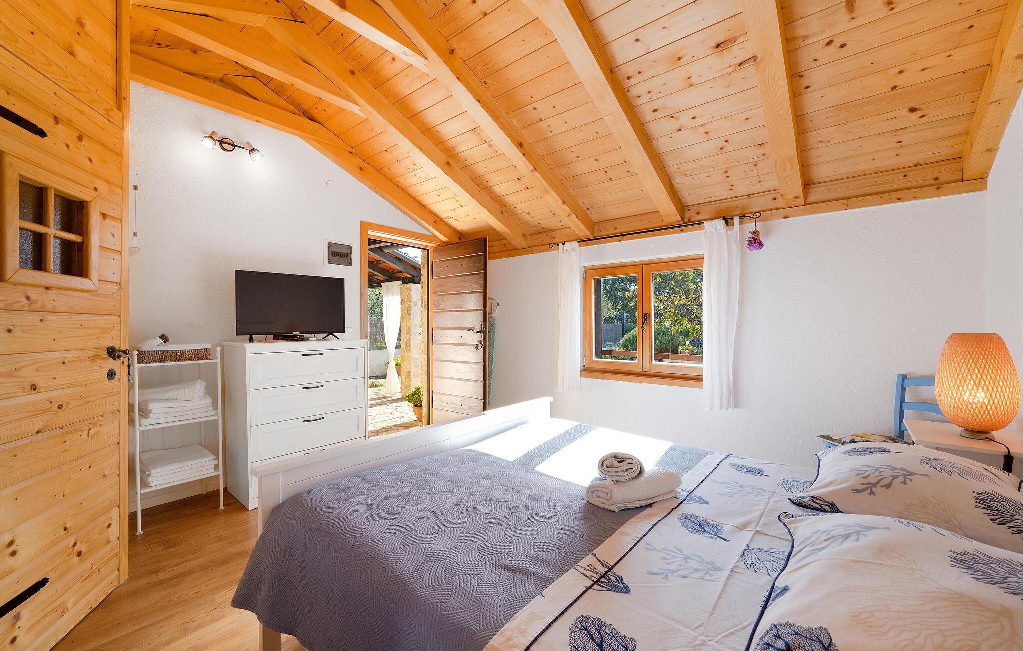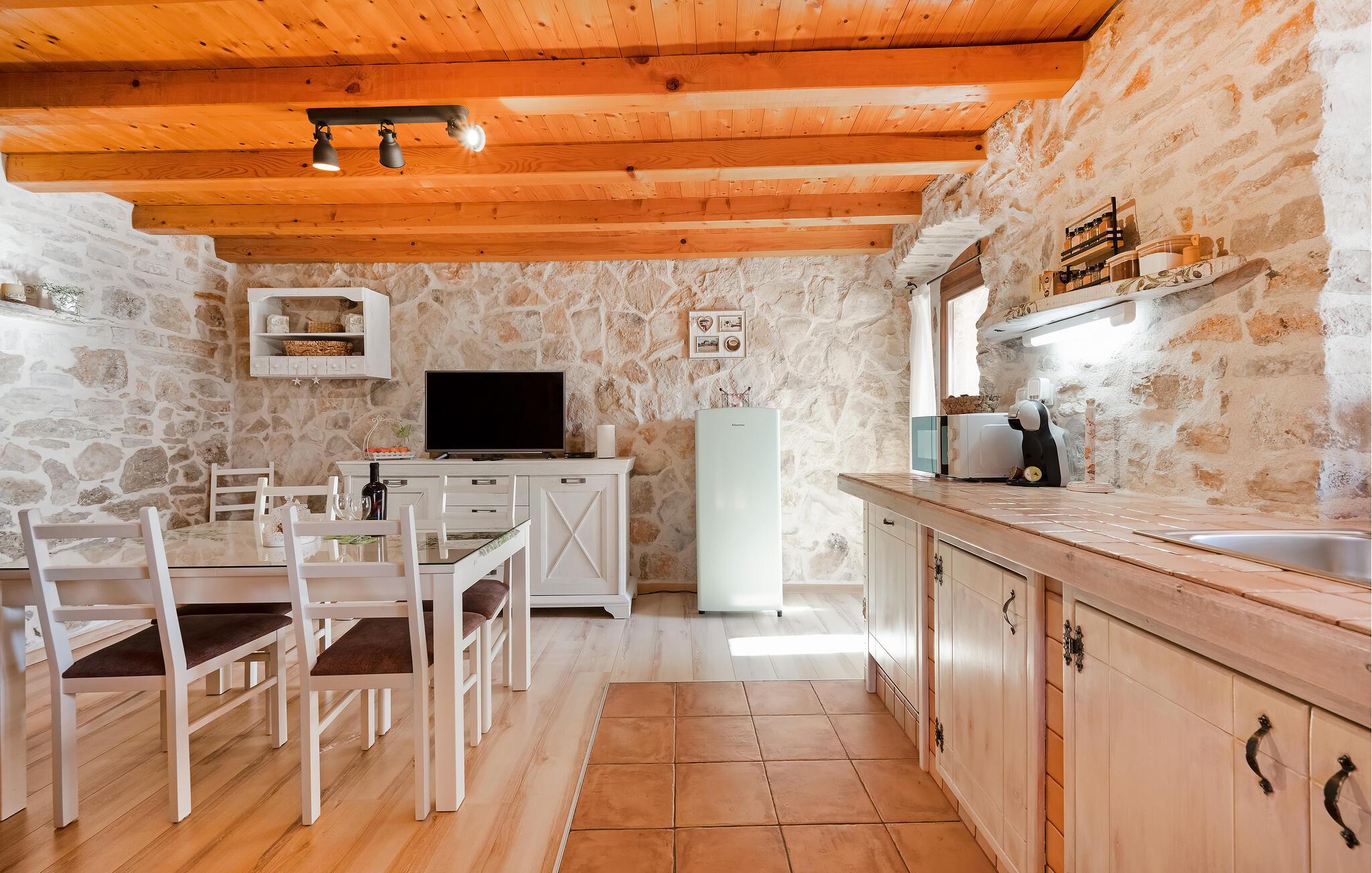 Dette charmerende feriehus af natursten, ligger i en lille, rolig landsby ikke langt fra den større by Šibenik, i Krk nationalparken. Hemsen i huset har adgang ad en stejl trappe og soveværelset med badeværelse har selvstændig indgang udefra, via den overdækkede terrasse. I kan tilbringe skønne timer i solen ved poolen, jeres børn kan glæde sig til forskellige former for legeredskaber i haven. I bor i gå afstand af den vidunderlige Nationalpark Krka, som er oplagt at opleve i løbet af ferien. Her er der vådområder med glasklart vand hvor I kan se fiskene svømme og smukke vandfald, frodige bakker og historiske ruiner. Besøg også den historiske by Skradin og det antikke Scardona, en smuk by med et bredt udvalg af restauranter. Nærmeste strand og havet: 10 km.