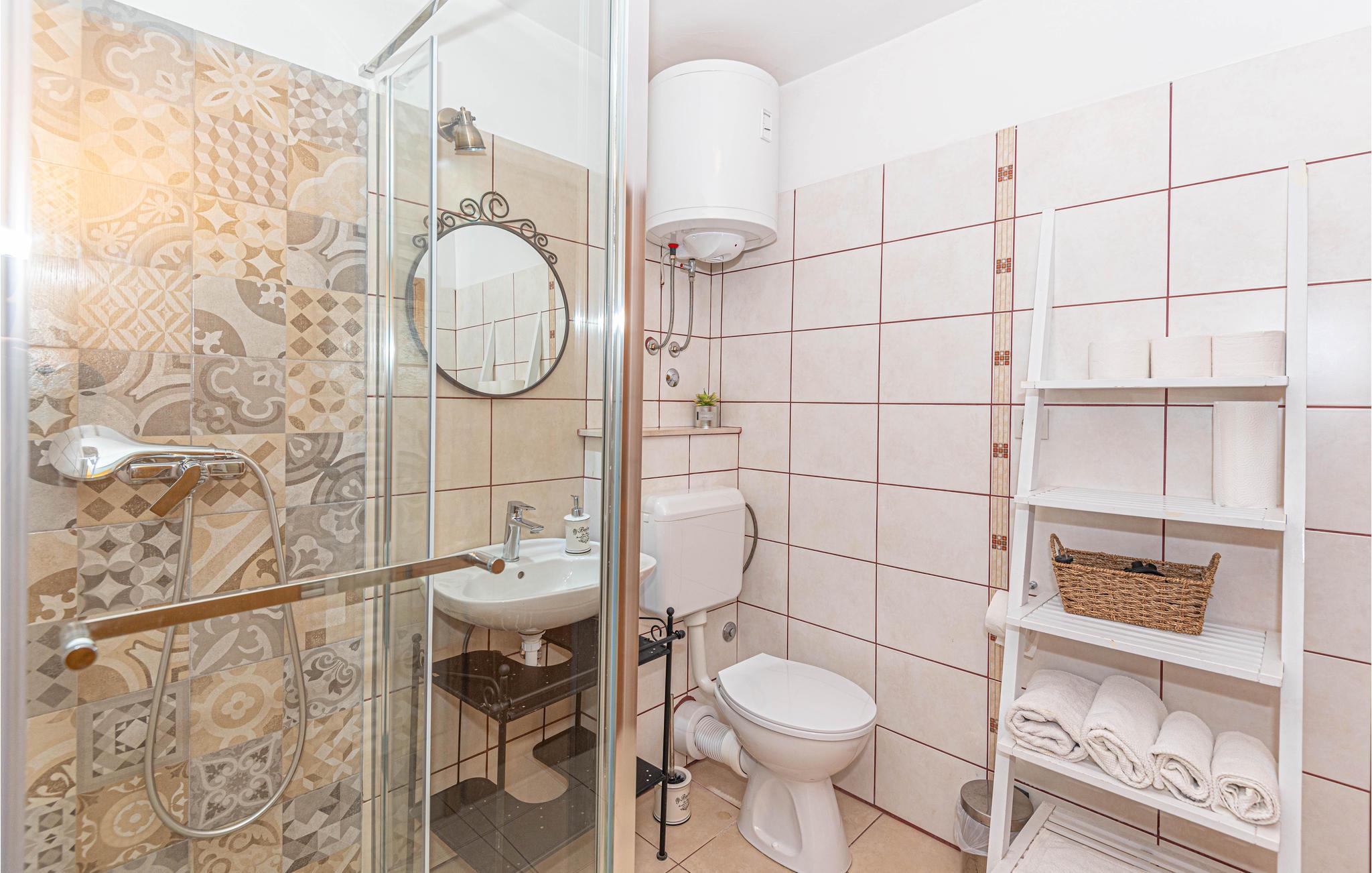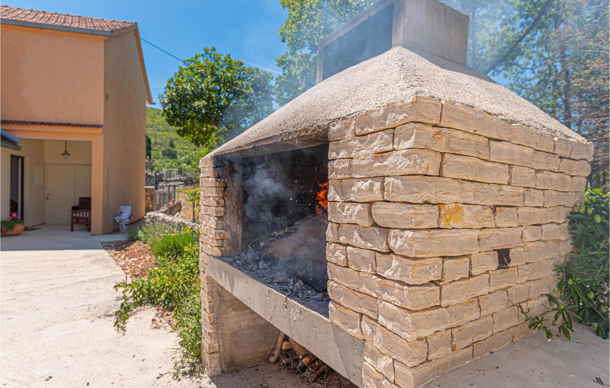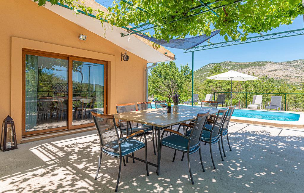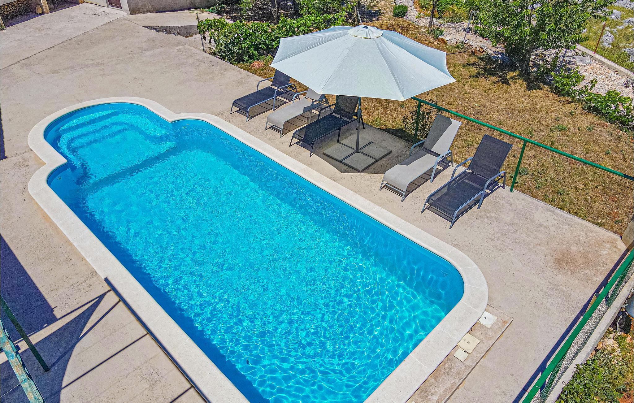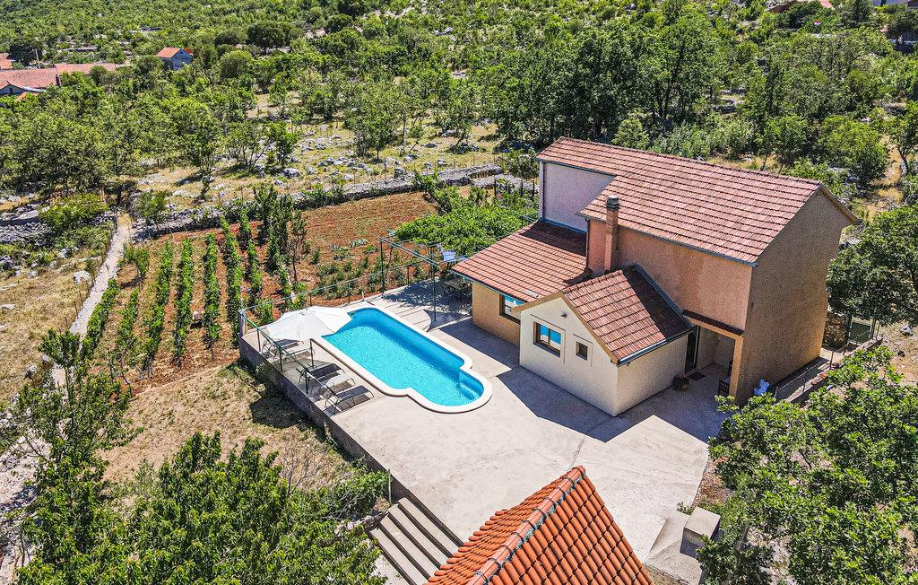 Dette enkle og behagelige feriehus lader jer slappe af i hjertet af naturen med familie eller venner. Her nyder I godt af dette gemte sted langt væk fra larm og masserne. Ovenpå (indertrappe) er der soveområde, i stueetagen er der køkken og stue med adgang til en stor terrasse, og der er en pool til perfekt atmosfære. Hvis I har lyst til en tur i byen kan I tage til kysten, hvor der venter byerne Trogir og Sibenik samt herlige strande. Naturelskere må heller ikke gå glip af et besøg i nationalparkerne Krka og Kornati.