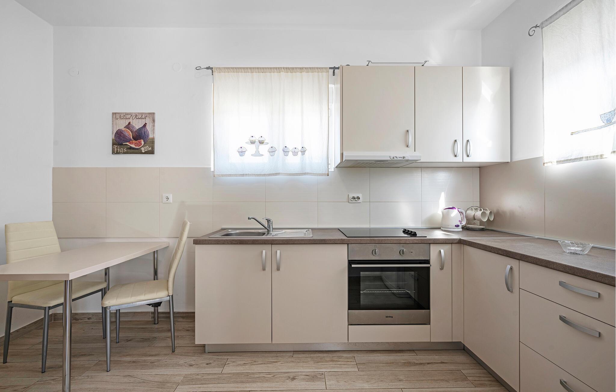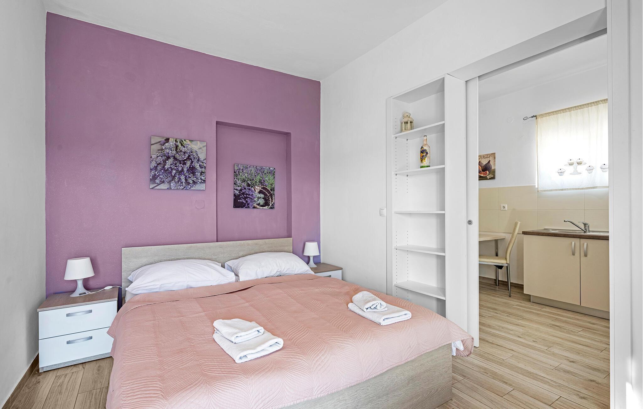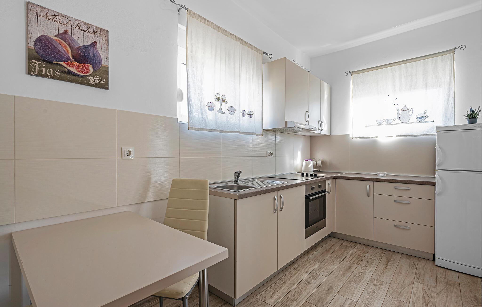 Jeres ferielejlighed er ideel til en ferie for to og et godt udgangspunkt for udflugter i regionen. Nyd en rolig beliggenhed, moderne faciliteter og nærhed til stranden. Kun få meter adskiller jer fra den nærmeste svømmetur i havet. Lejligheden giver jer et funktionelt køkken. Lav mad som I har lyst, og sørg for jer selv på ferien. Spis komfortabelt ved det lille køkkenbord eller nyd morgenmaden på balkonen med udsigt over vandet. Omgivet af oliventræer og middelhavsplanter finder I fred og privatliv her. Den brolagte gårdhave er også velholdt og rummelig.