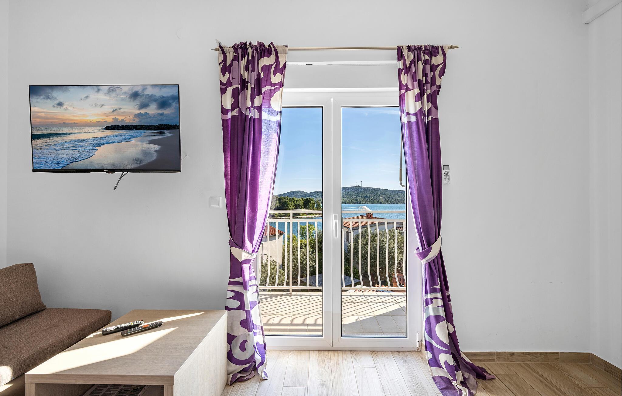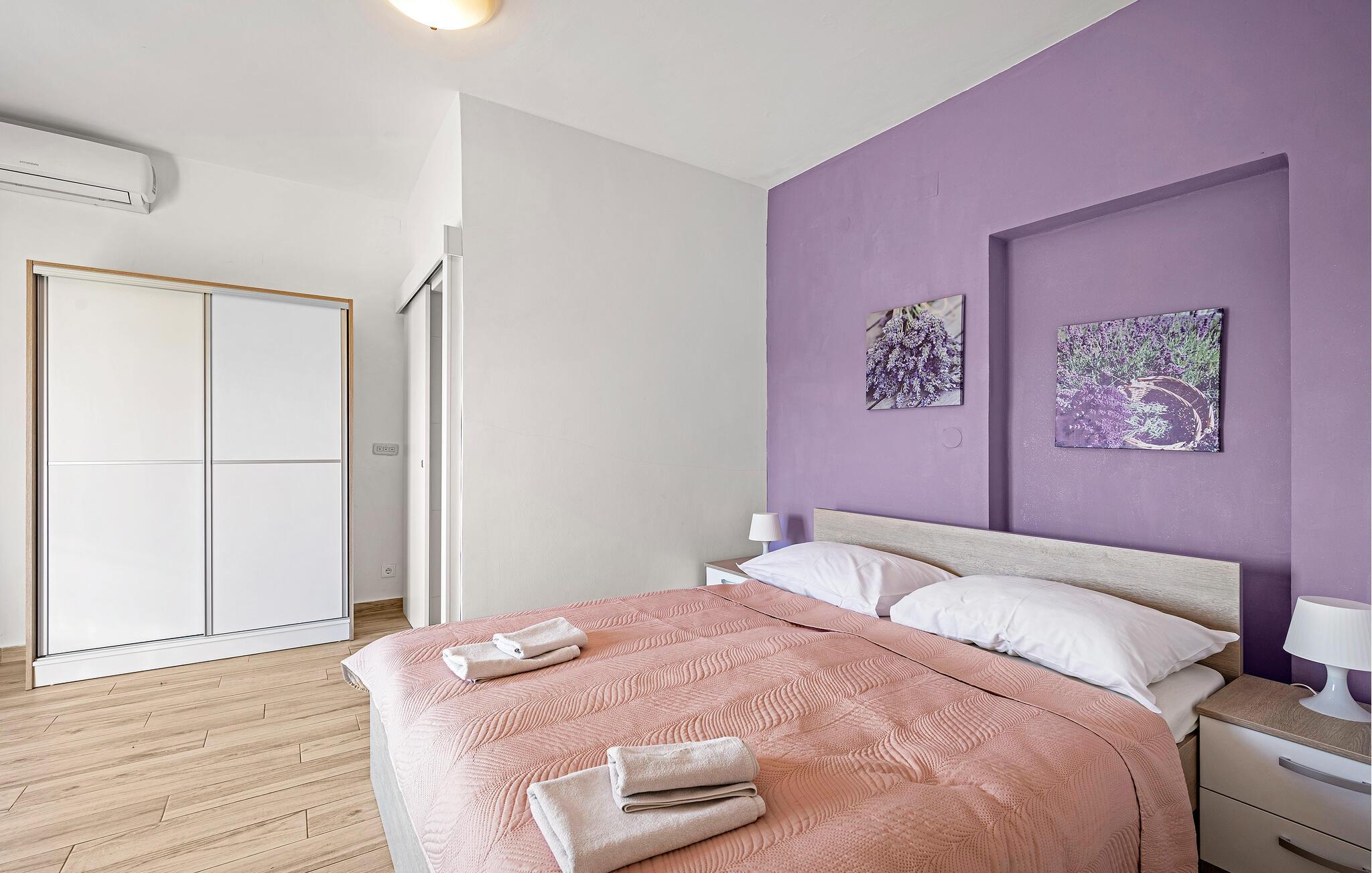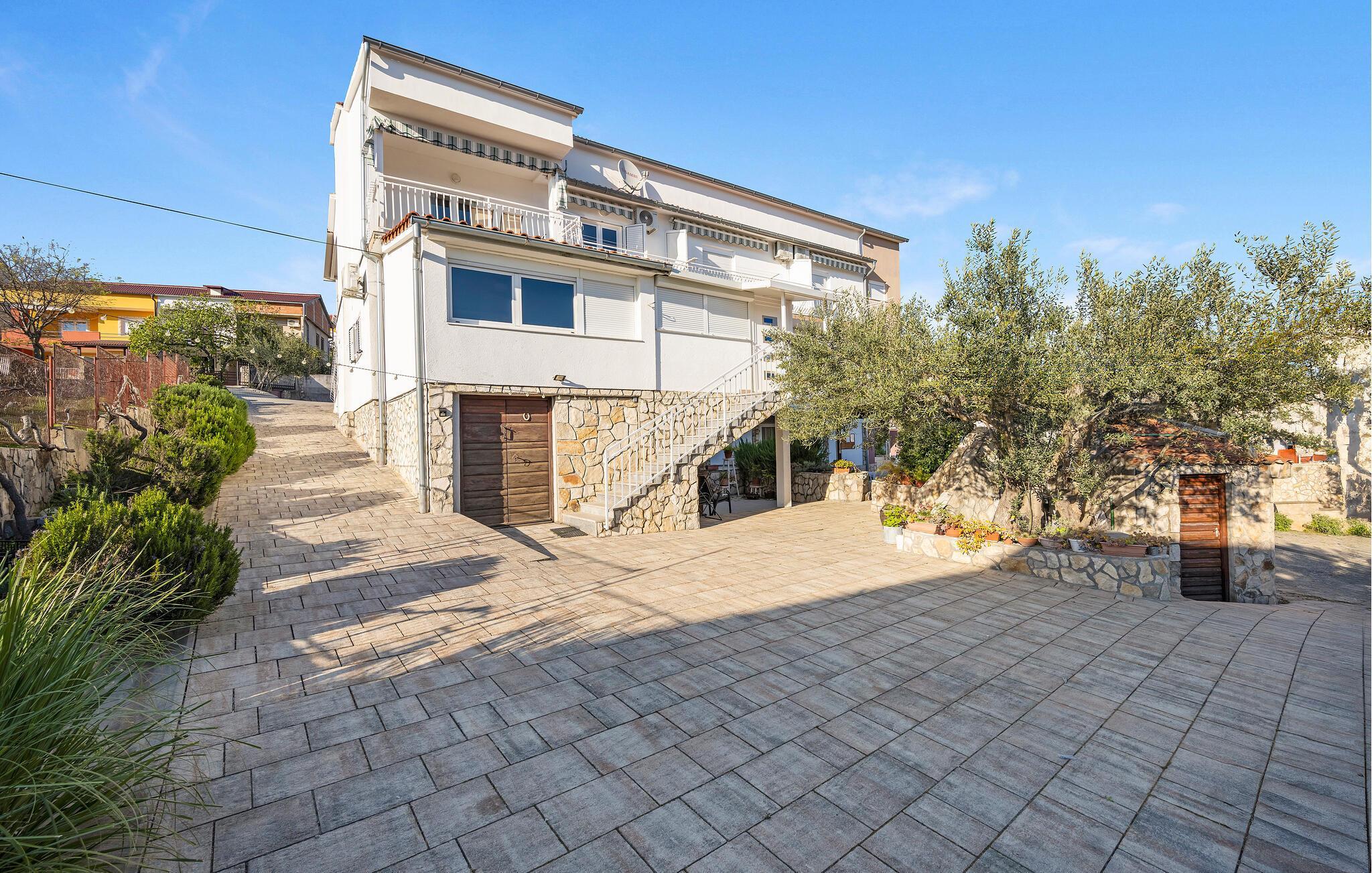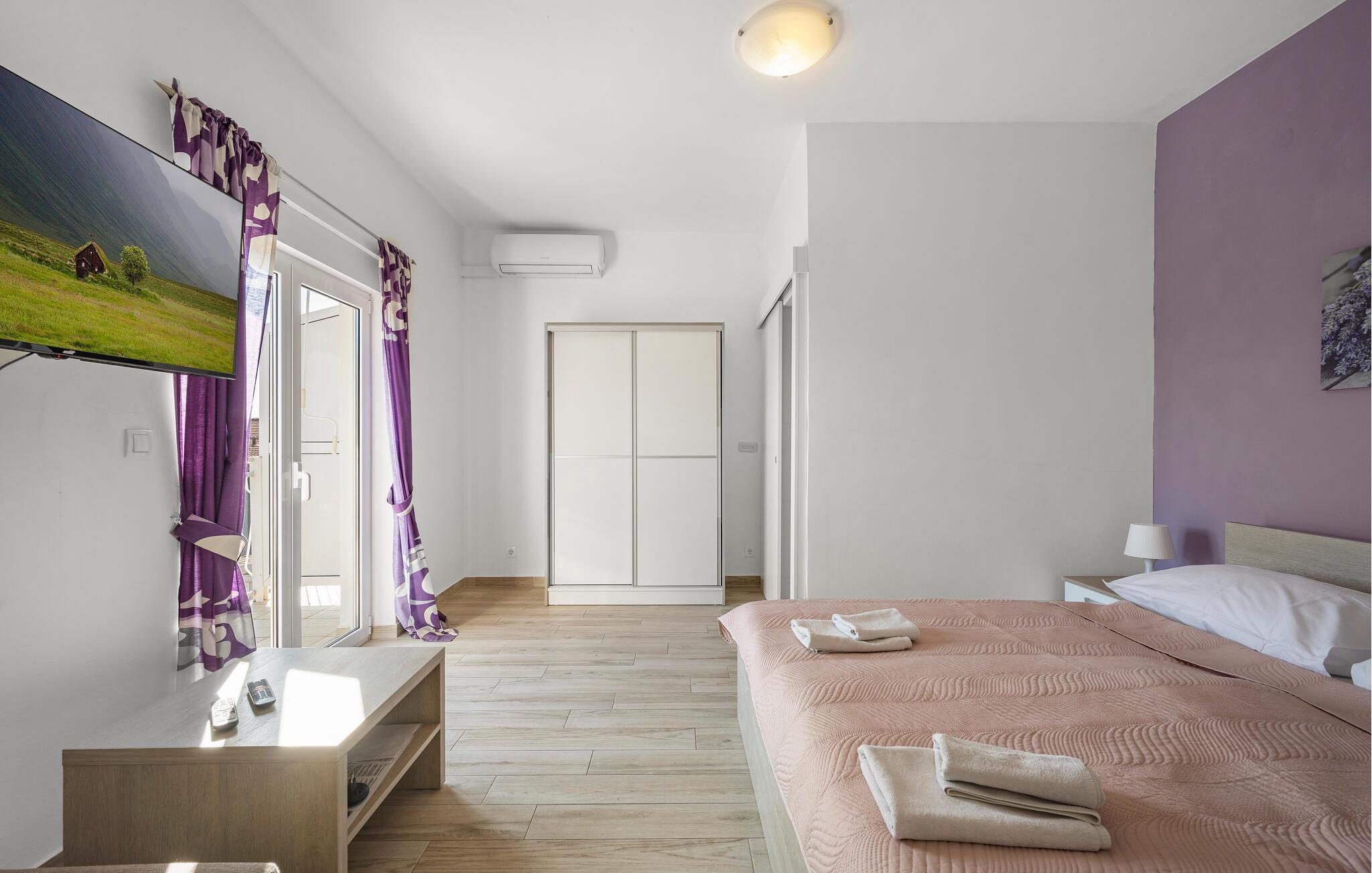 Jeres ferielejlighed er ideel til en ferie for to og et godt udgangspunkt for udflugter i regionen. Nyd en rolig beliggenhed, moderne faciliteter og nærhed til stranden. Kun få meter adskiller jer fra den nærmeste svømmetur i havet. Lejligheden giver jer et funktionelt køkken. Lav mad som I har lyst, og sørg for jer selv på ferien. Spis komfortabelt ved det lille køkkenbord eller nyd morgenmaden på balkonen med udsigt over vandet. Omgivet af oliventræer og middelhavsplanter finder I fred og privatliv her. Den brolagte gårdhave er også velholdt og rummelig.