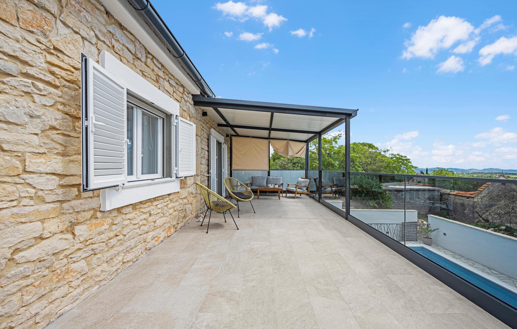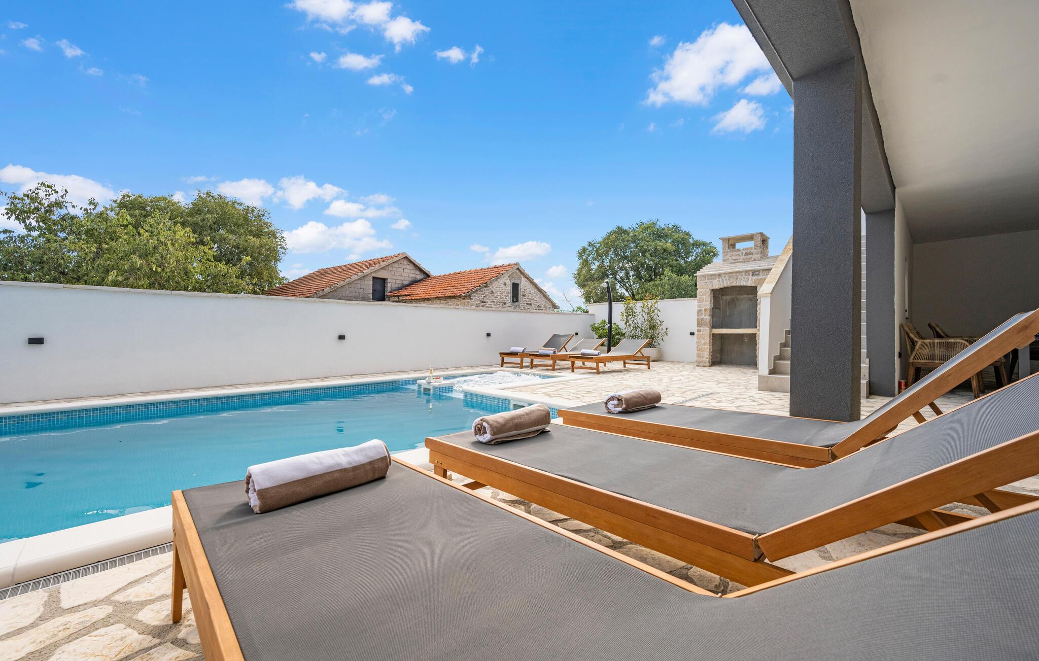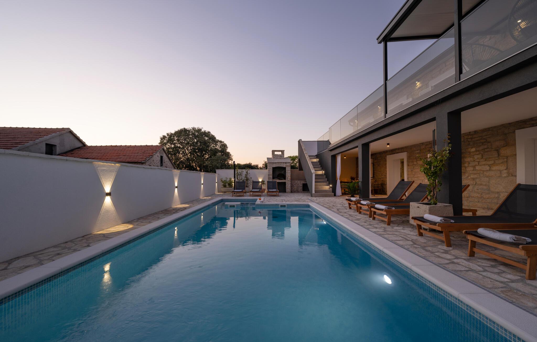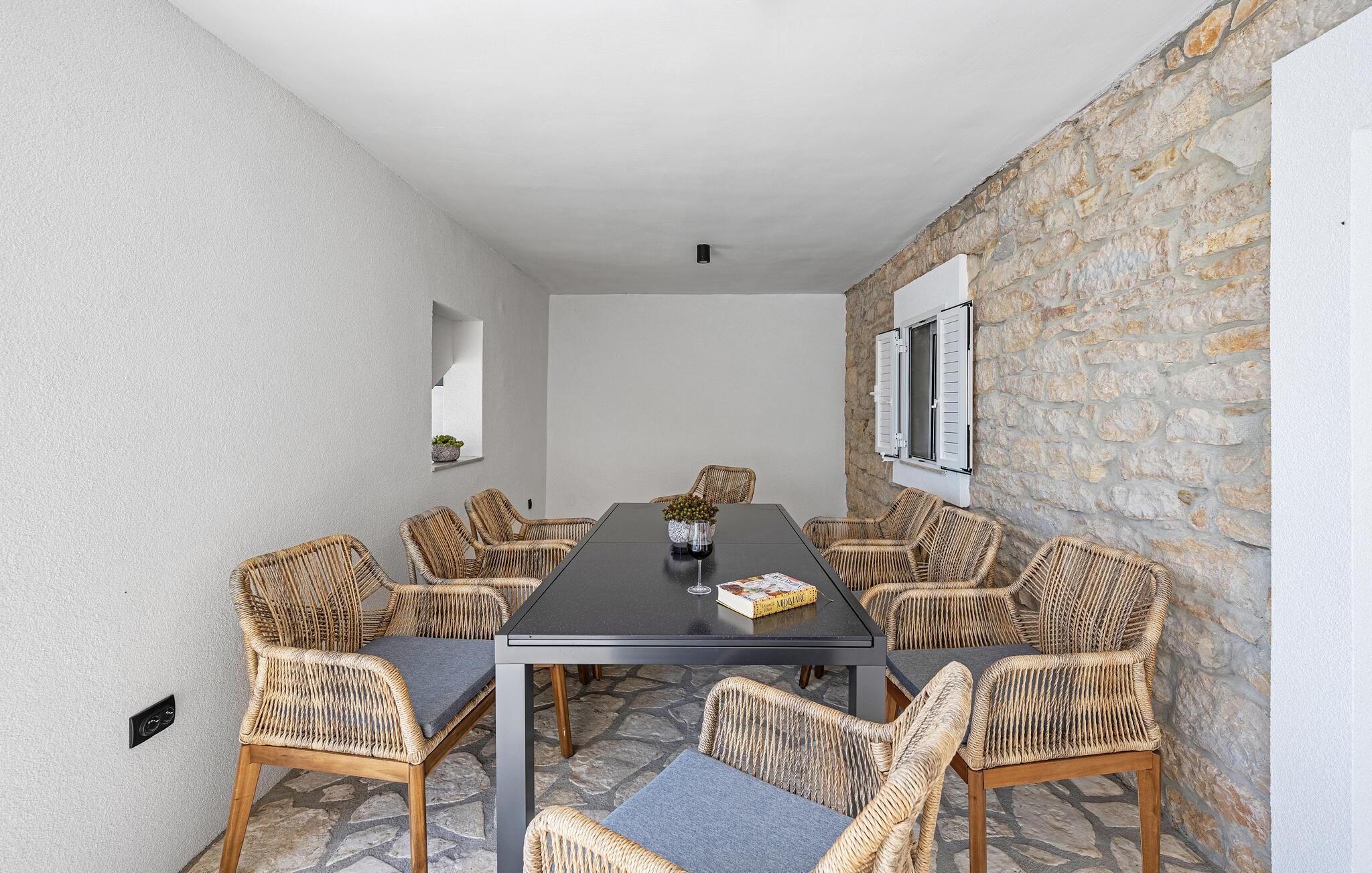 Nyd en afslappende ferie i dette moderne feriehus i Plastovo, en charmerende landsby ikke langt fra Krka Nationalpark. Dette elegante hjem har et strejf af luksus. Slap af på den store terrasse, som er udstyret med en rummelig pool og komfortable liggestole. Begynd jeres dage med et frisk hop i det kølige vand og nyd de fredelige omgivelser. Husets stilfulde interiør lægger op til at nyde livet og have det rart. Find jer godt til rette i den komfortable sofa i stuen og nyd den moderne indretning. I det veludstyrede køkken kan I tilberede jeres ferieretter og nyde dem ved spisebordet med familie eller venner.
