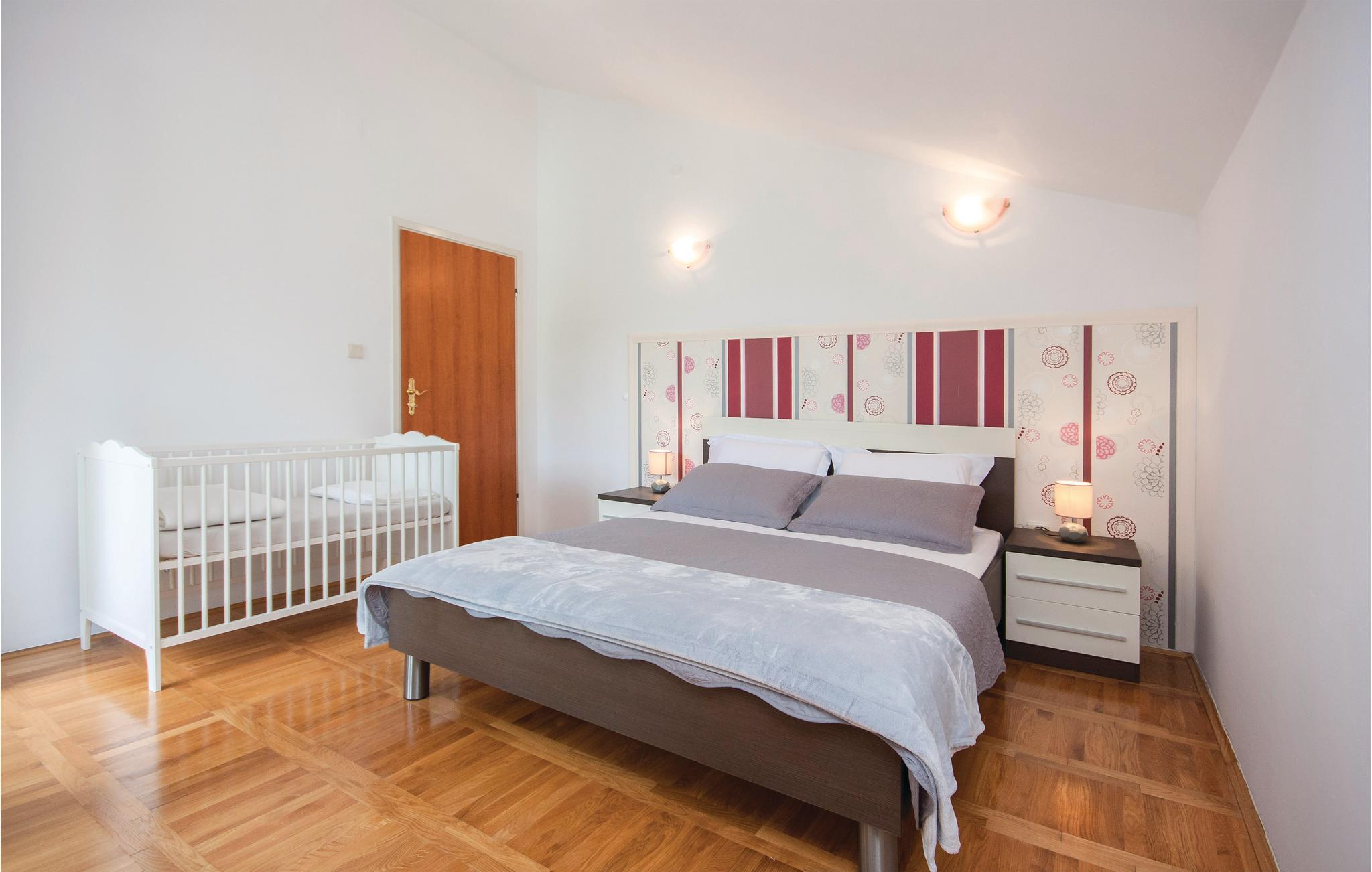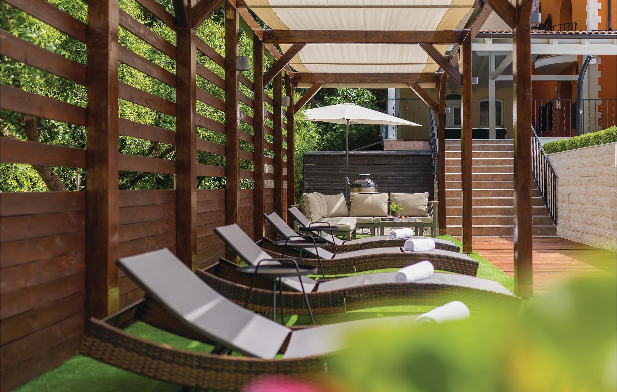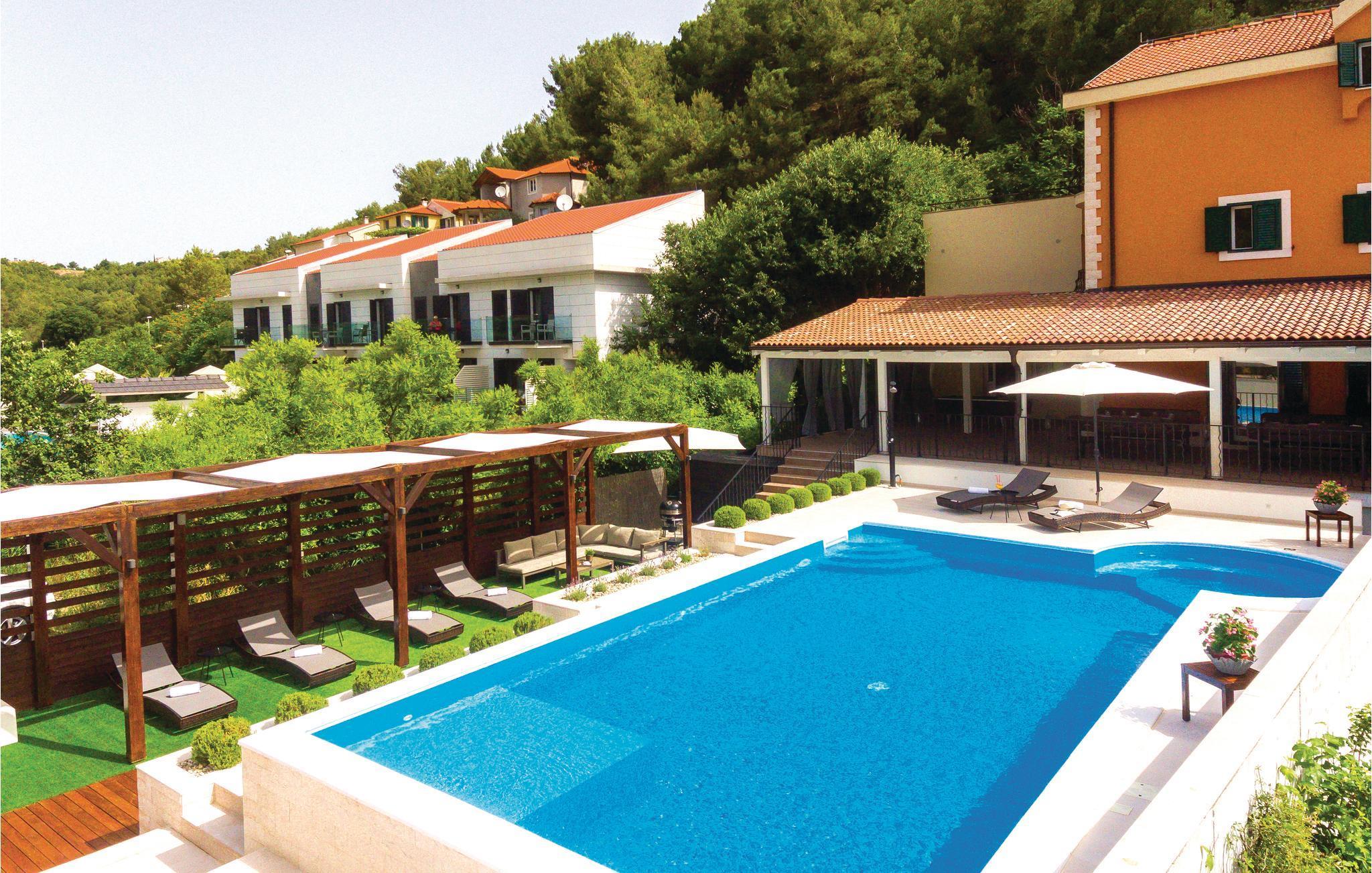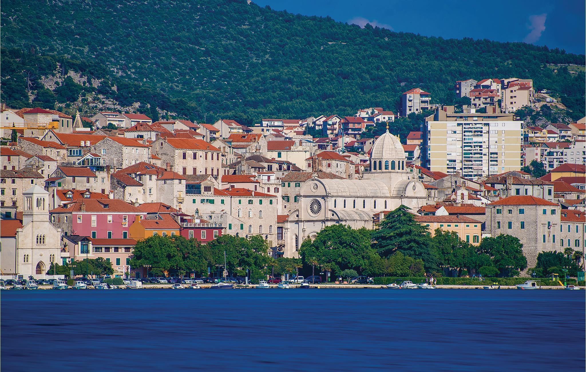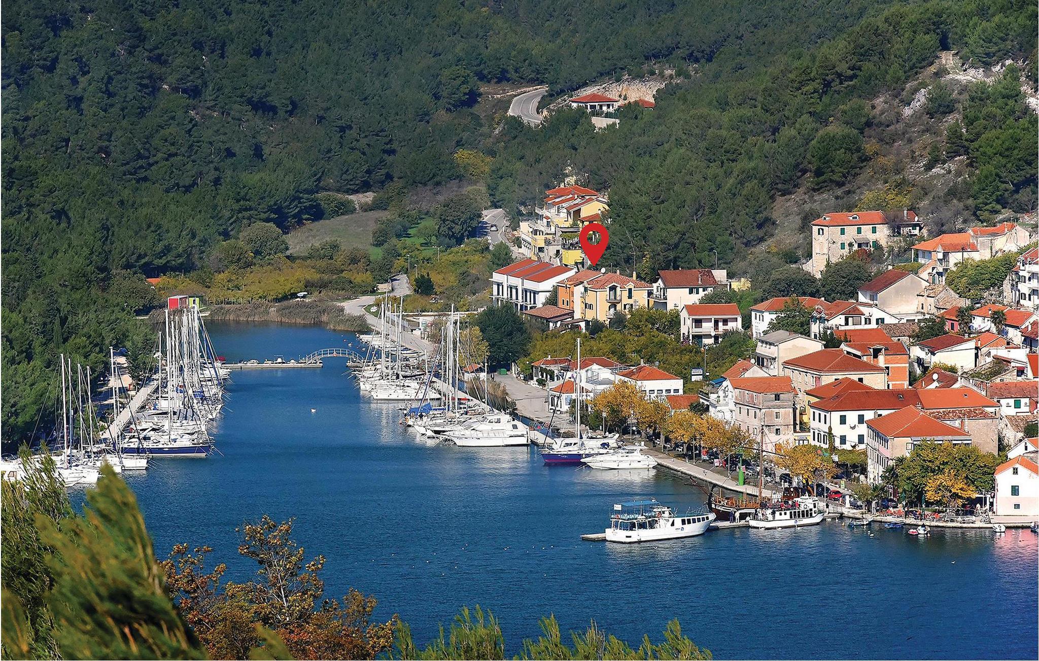 Med en fantastisk beliggenhed ved bredden af Krkafloden og i den historisk interessante by Skradin, ligger dette store og komfortable feriehus. Det er fordelt på tre etager, der er forbundet med en udendørs trappe. I stueetagen er der alt til sjov og afslapning, fx en bar, en sauna, brusebad en overdækket terrasse og den smagfuldt indrettede indre gård med baldakin over de behagelige havemøbler. Nyd den underskønne natur på en dejlig tur i båd til nationalparken Krka. Vi kan også varmt anbefale byen Šibenik med de mange historiske seværdigheder, muligheder for at dyrke sport og et ualmindeligt lækkert køkken.