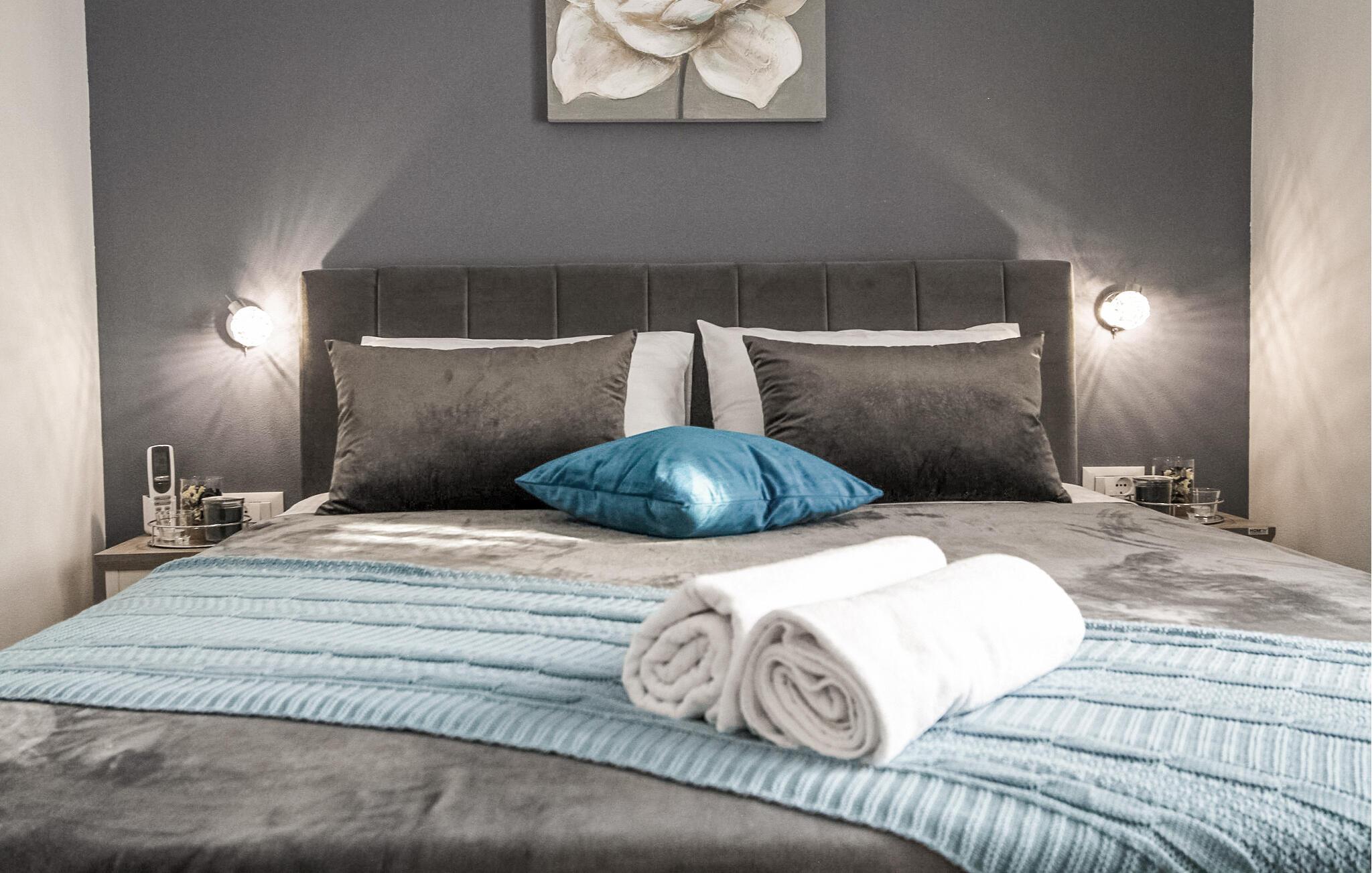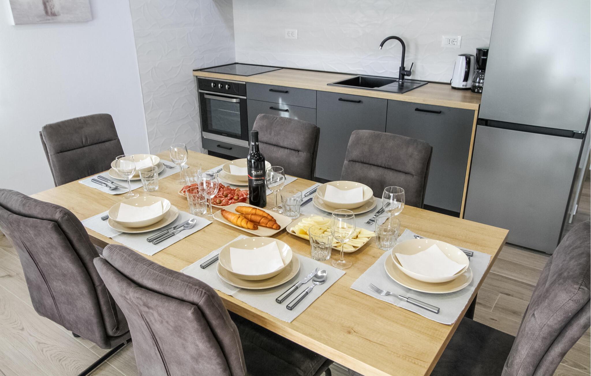 Det moderne og rummelige interiør med elegante linjer og traditionel charme er det optimale valg for familier eller vennegrupper. Bløde farver og tilføjelsen af ??træ forstærker den afslappede atmosfære. Den luftige stue, der er forbundet med det elegante køkken, giver et behageligt miljø til socialt samvær.