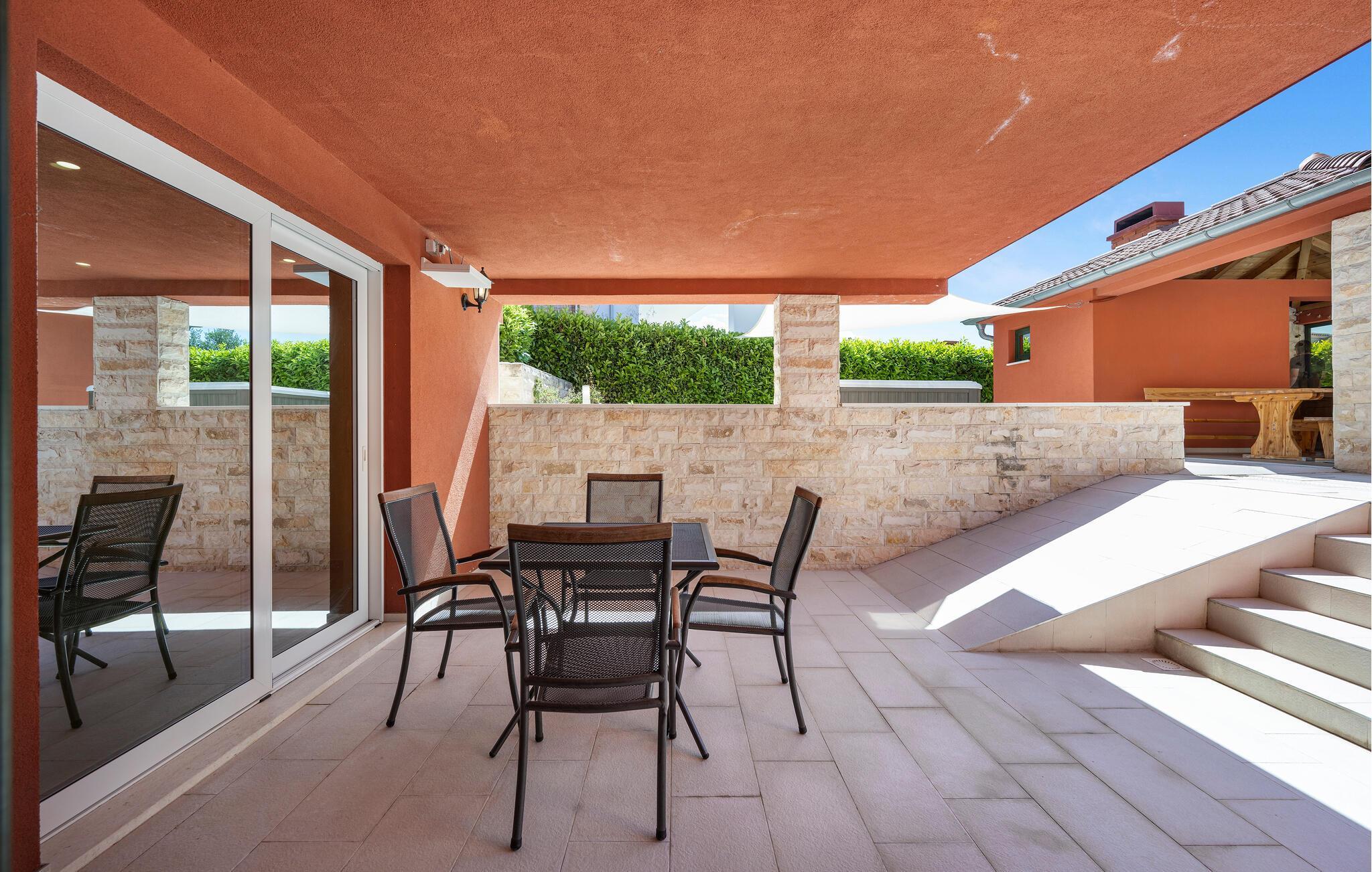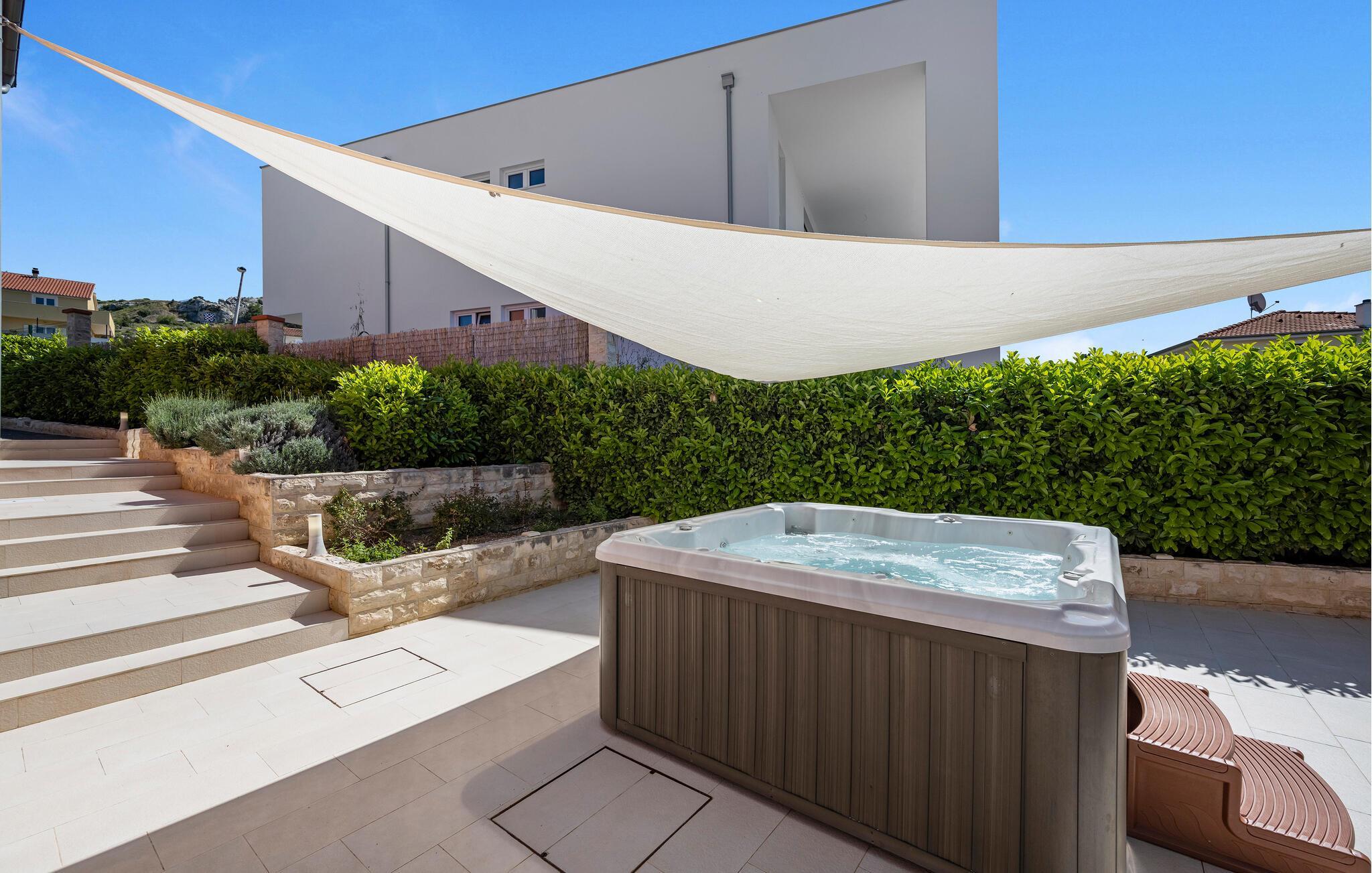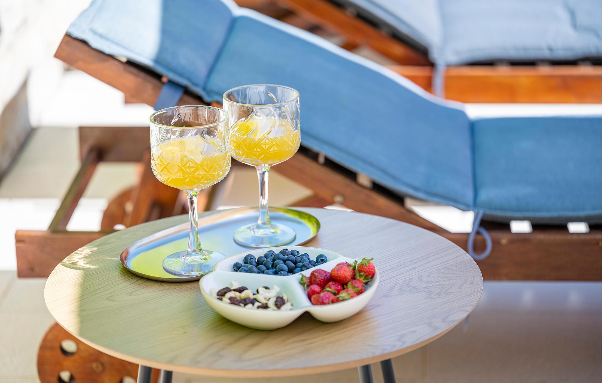 Begynd dagene med en solid morgenmad på den overdækkede terrasse og snup en frisk dukkert i den skønne pool til hjertens lyst. Slap af på liggestolen eller i spabadet, forkæl jer selv med en kølig drink i den komfortable lounge og glæd jer til atmosfæriske grillaftener på varme sommernætter.