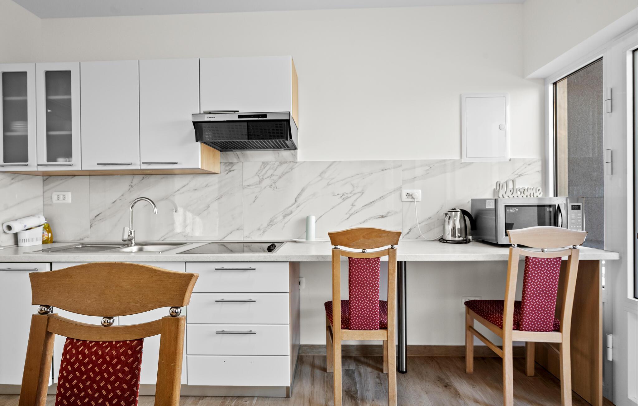 To fælles terrasser er tilgængelige til morgenmad og udendørs samtaler. Den øverste terrasse tilbyder en smuk udsigt over det nærliggende hav. Afslut dagen her med et glas vin.