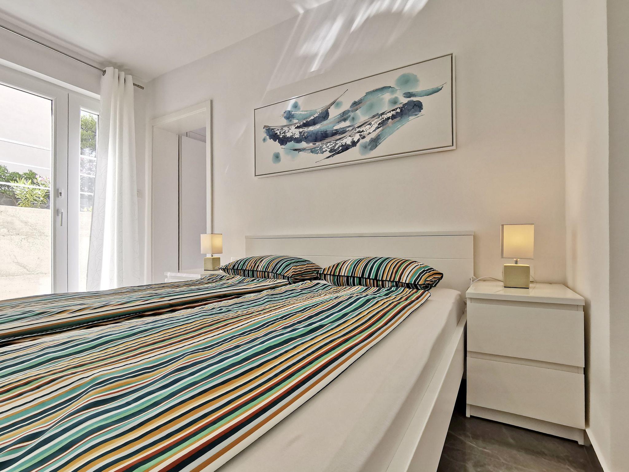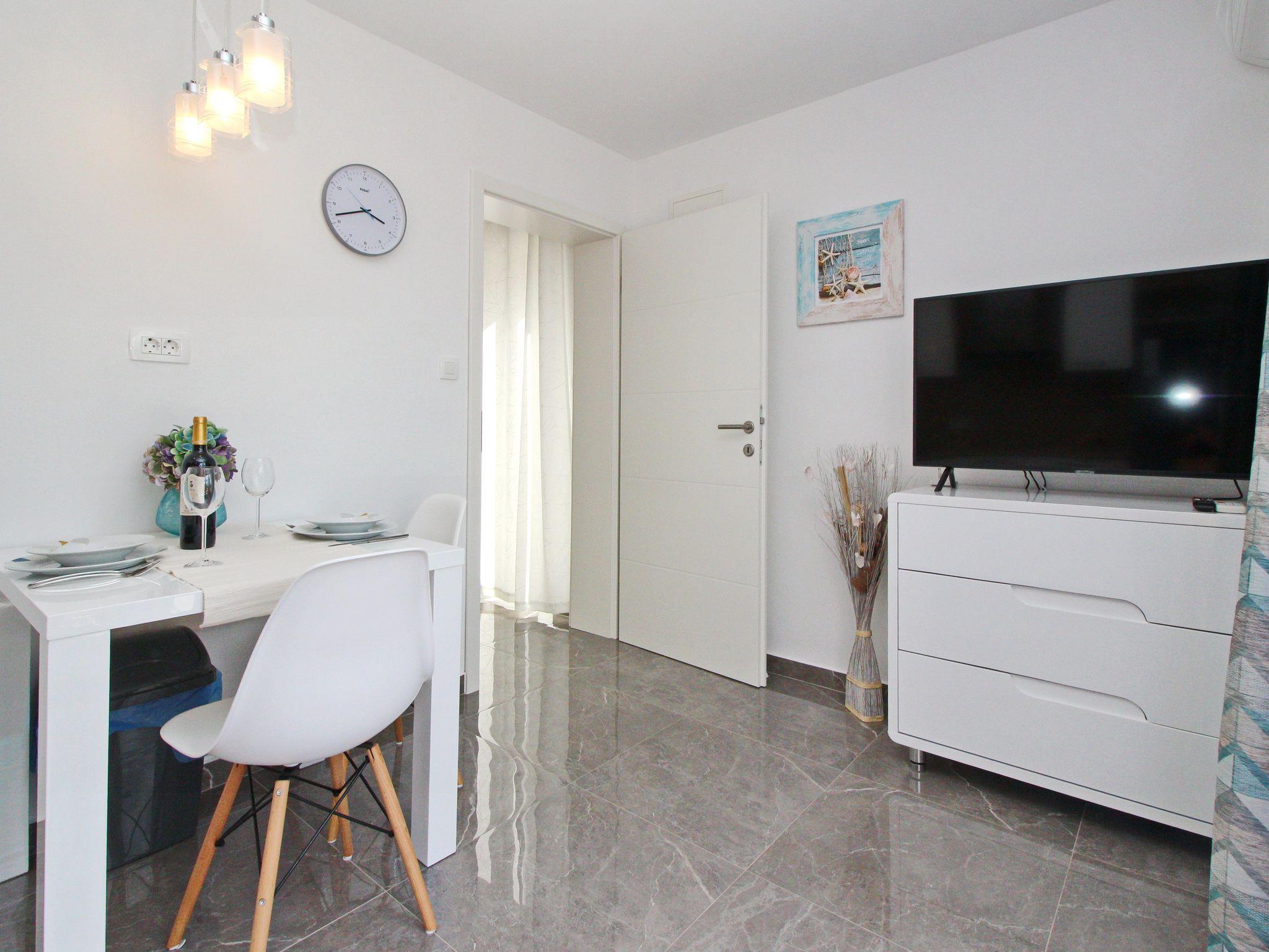 Studio bietet Platz für 2 Gäste. Die Betten sind in Schlafzimmern, die es 1 gibt, innerhalb einer Gesamtfläche von 24m2, angeordnet. Die Gäste haben eine eigene Terrasse zur Verfügung, auf der sie in warmen Sommernächten genießen können. Das Studio-Apartment bietet Meerblick. Es ist erlaubt, Speisen auf dem Gemeinschafts-Grill vorzubereiten. IM PREIS INBEGRIFFEN: Kurtaxe, Endreinigung, Klimatisierung, Parkplatz, Internet, Wäschewaschen, Bügeleisen, Bügelbrett, Föhn. Die Verfügbarkeit zusätzlicher Dienstleistungen in Ihrem reservierten Termin und die Preise derselben (falls nicht aufgeführt) müssen im Voraus überprüft werden. Zusätzliche Dienstleistungen die in der Zahlungsaufforderung nicht aufgeführt sind werden direkt beim Vermieter bezahlt, angenommen der Gast nutzt auch diese.