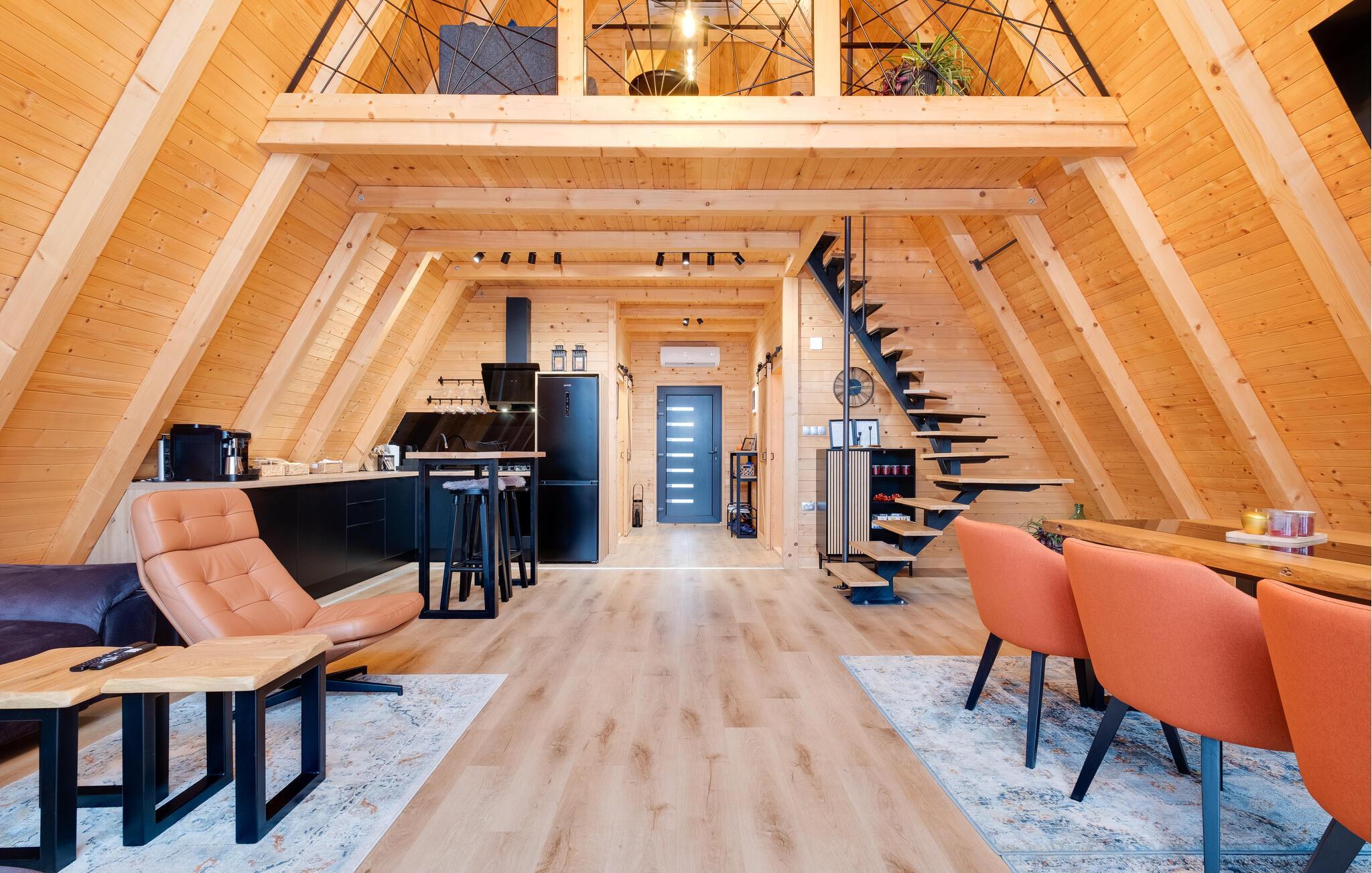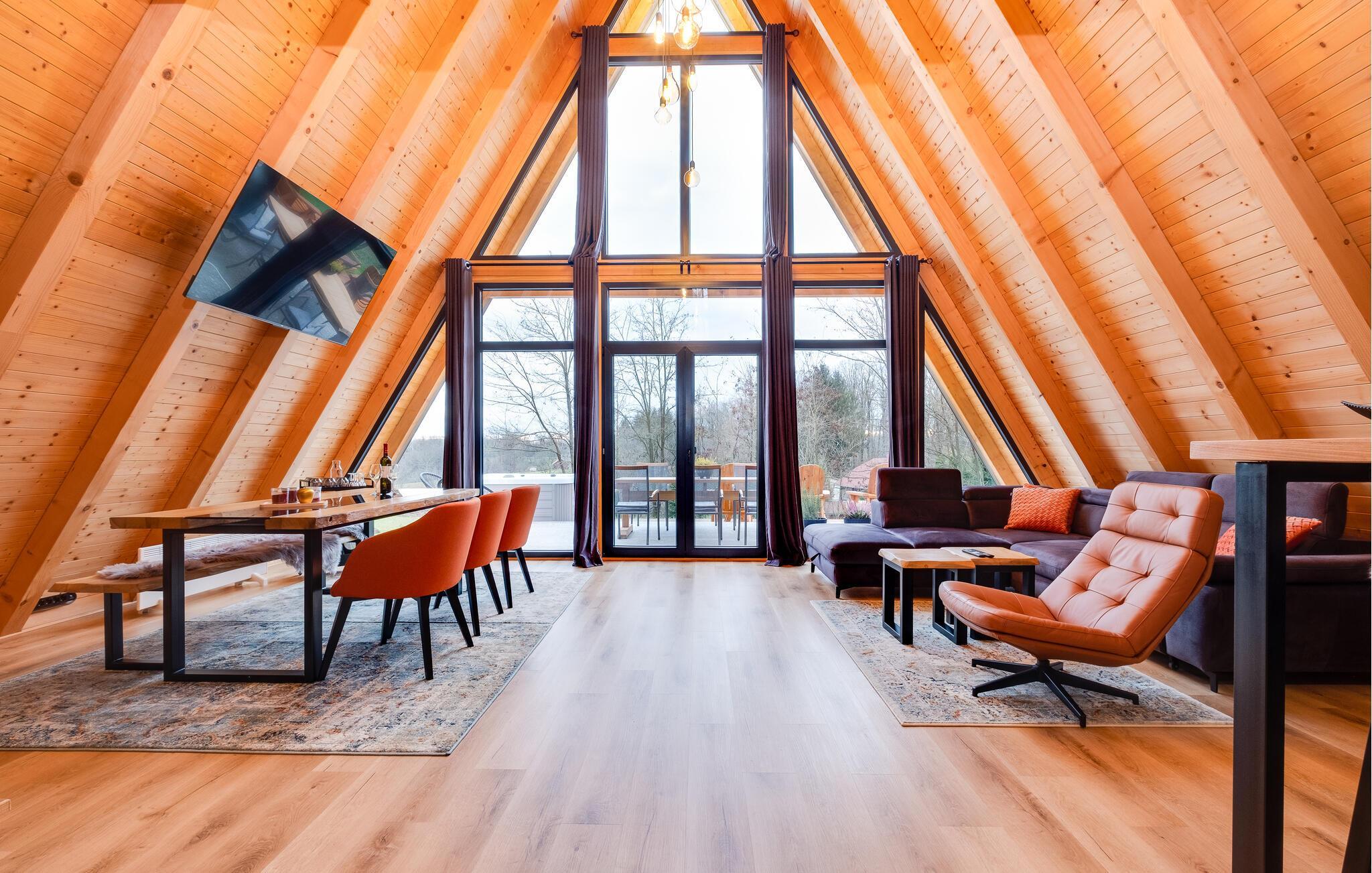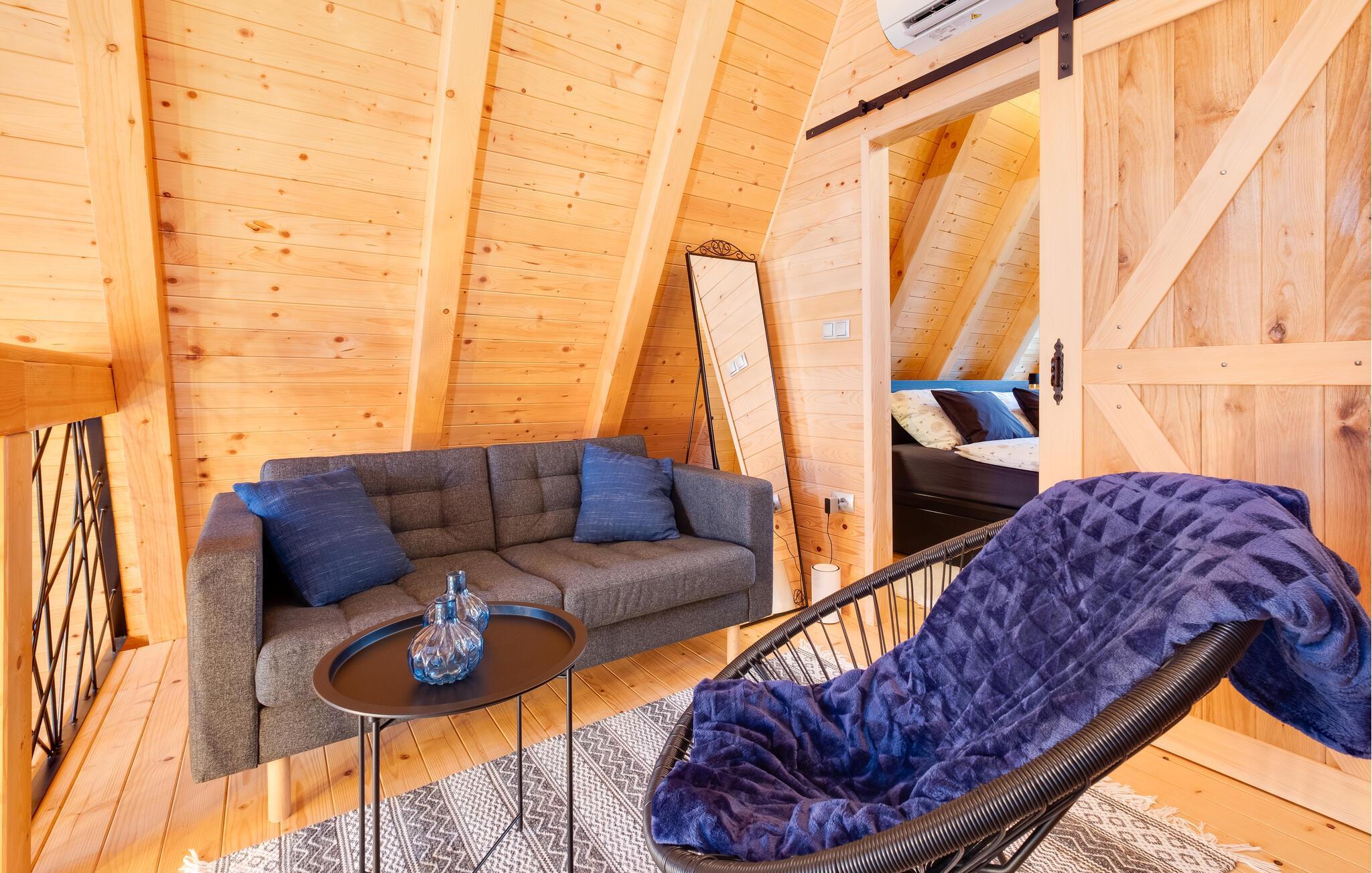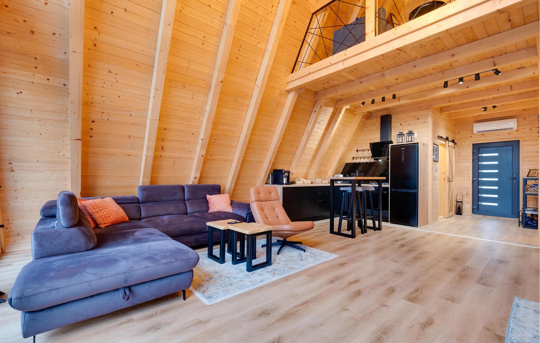 Velkommen til dette behagelige feriedomicil, hvor det varme træinteriør og den smagfulde indretning skaber en afslappende atmosfære. Her finder I alt, hvad I behøver for en ferie i harmoni med naturen. Slap af og nyd hverdagsfri stunder i den hyggelige opholdsstue.