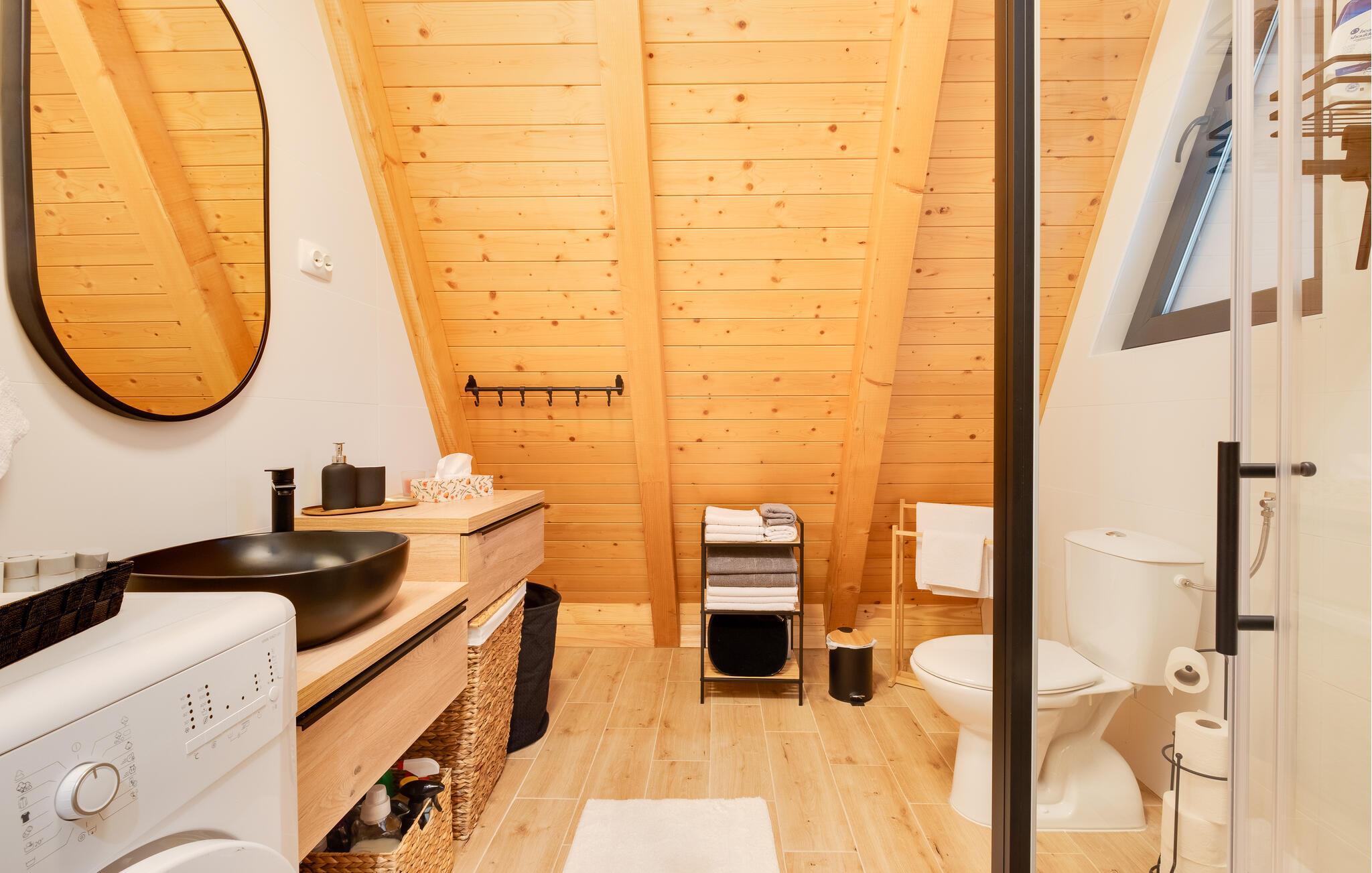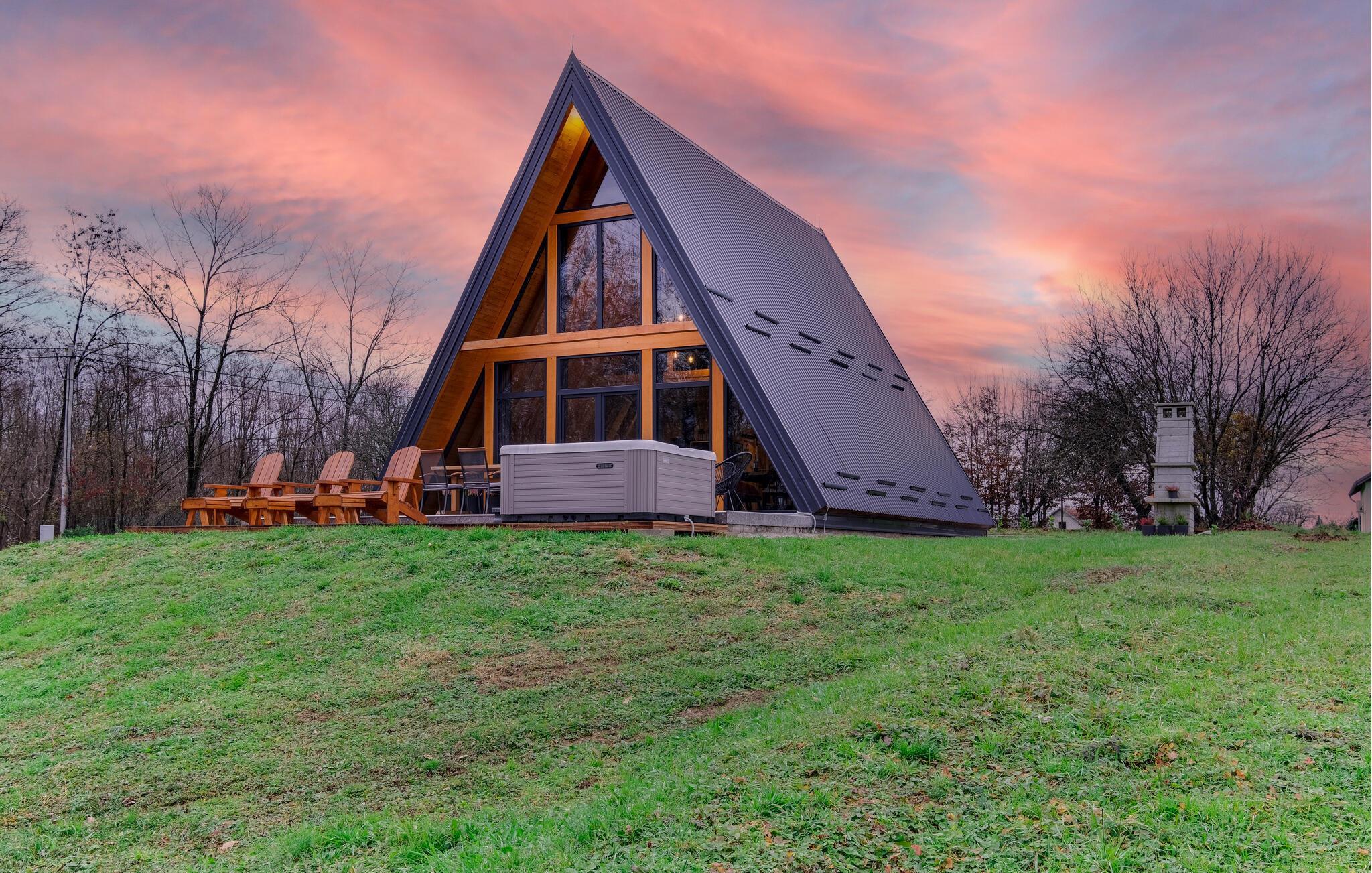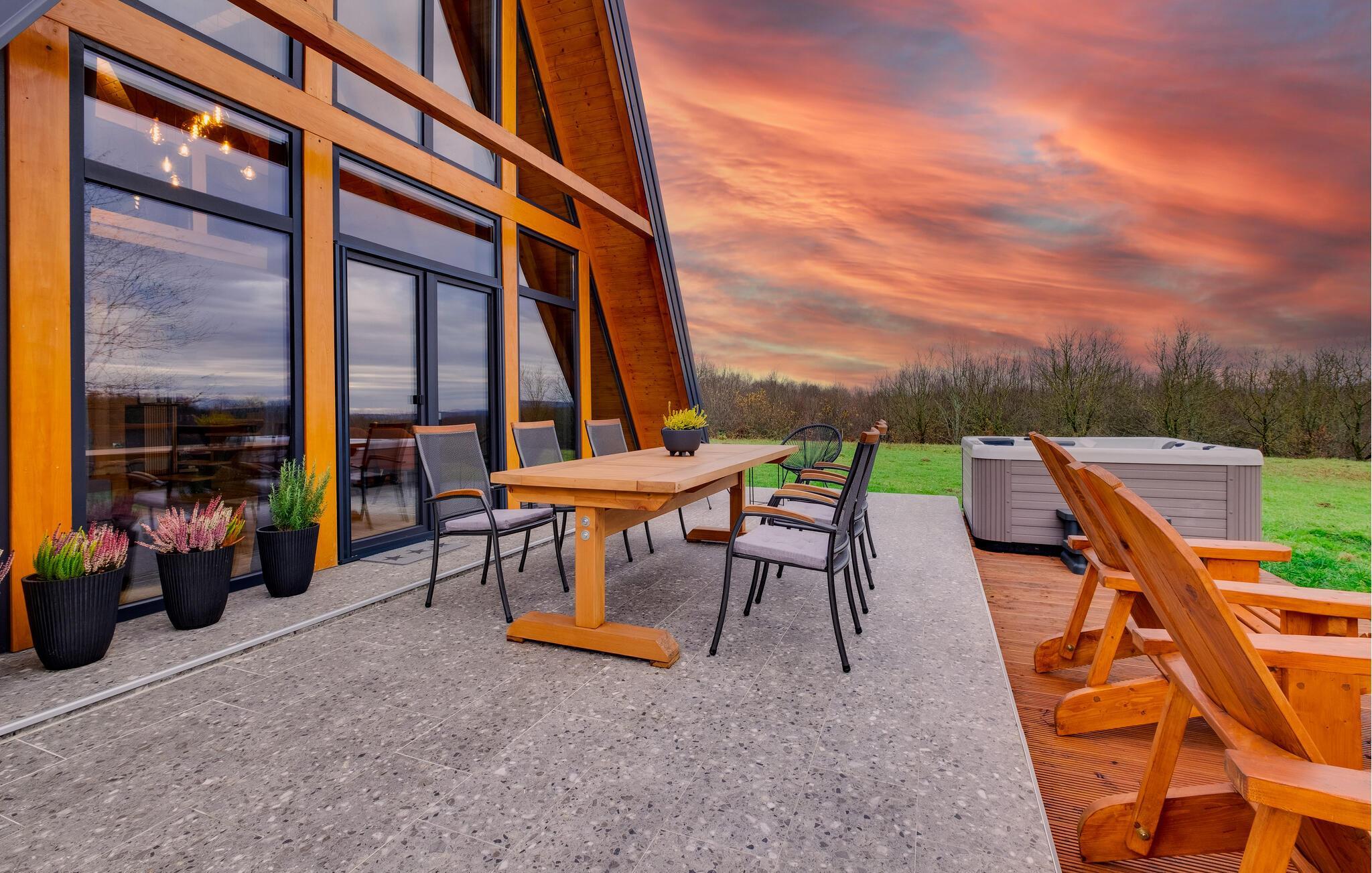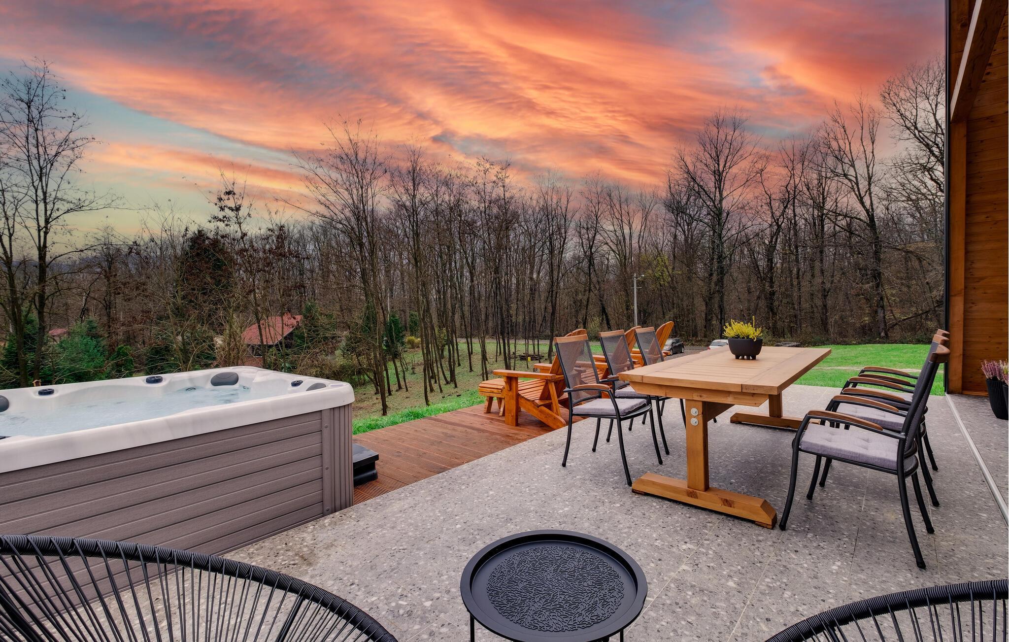 I jeres udendørsområde kan I forkæle jer selv i den indbydende jacuzzi og nyde morgenmaden på den rummelige terrasse omgivet af uberørt natur. Læn jer tilbage i de komfortable liggestole og lad blikket vandre ud over det idylliske landskab. Om aftenen skaber de stemningsfulde lys det perfekte miljø til afslappende timer under stjernerne.
