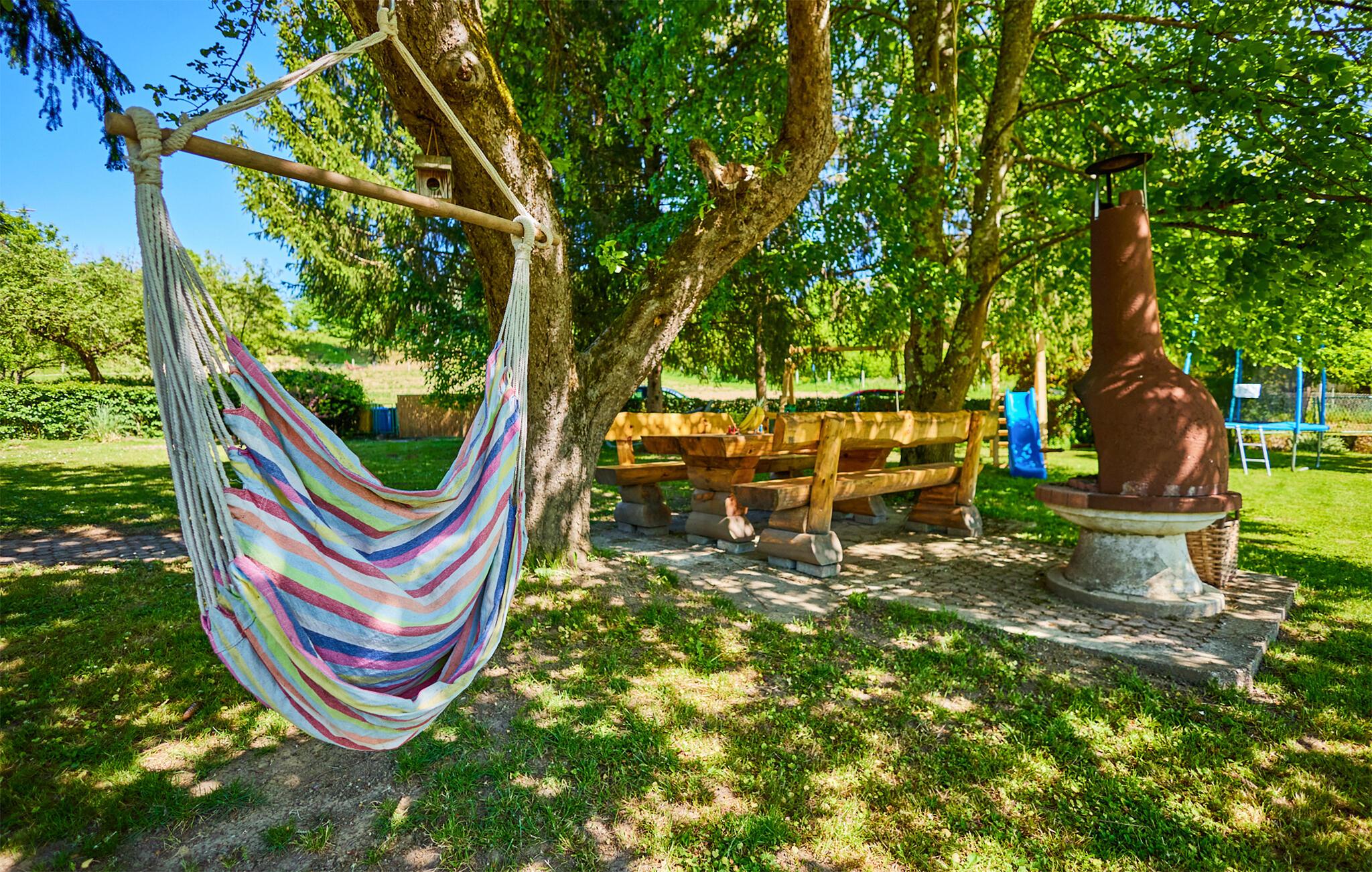 Et absolut højdepunkt er spabadet på terrassen, hvor I kan slappe dejligt af. Se børnene lege på grunden, mens I forbereder alt til en dejlig frokost i det grønne. Om aftenen kan I slappe af i gyngerne og nettene ved træet eller ved den udendørs bålplads, mens I lægger planer for de kommende dage.