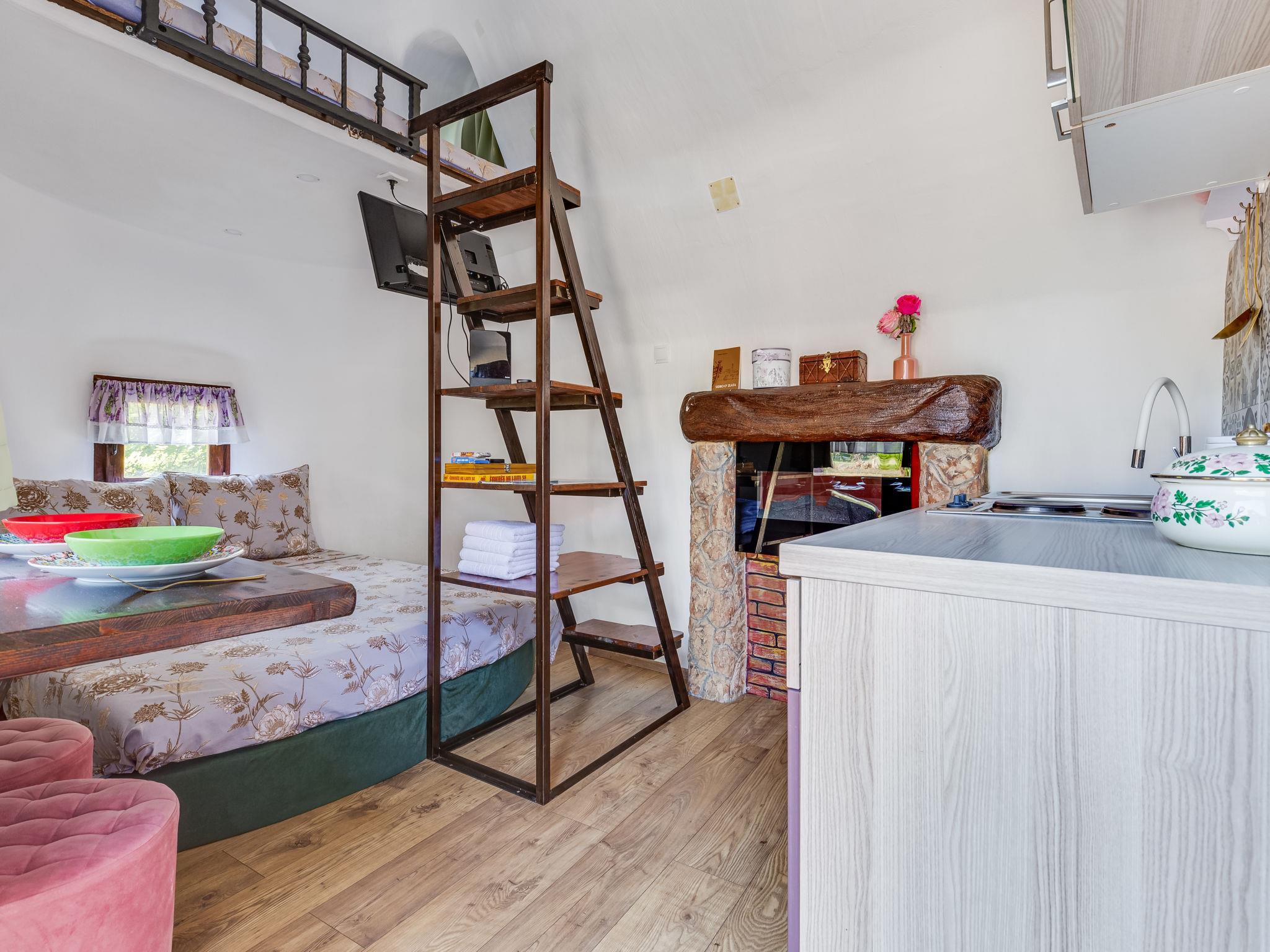 1-room bungalow 15 m2. Living/sleeping room with 1 pull-out bed (2 pers. 2 x 80 cm, length 200 cm), TV (flat screen), air conditioning. Exit to the terrace. Open gallery with sloping ceilings, ceiling height 10 - 100 cm with 1 sleeping facility (140 cm, length 200 cm). Open kitchen (2 hot plates, kettle). Shower/WC. Electric heating. Terrace 20 m2. Terrace furniture, deck chairs (1). View of the garden. Facilities: mosquito net. Internet (WiFi, free). Maximum 1 pet/ dog allowed. Max. occupancy: 2 adults, 2 children up to 12 years old.