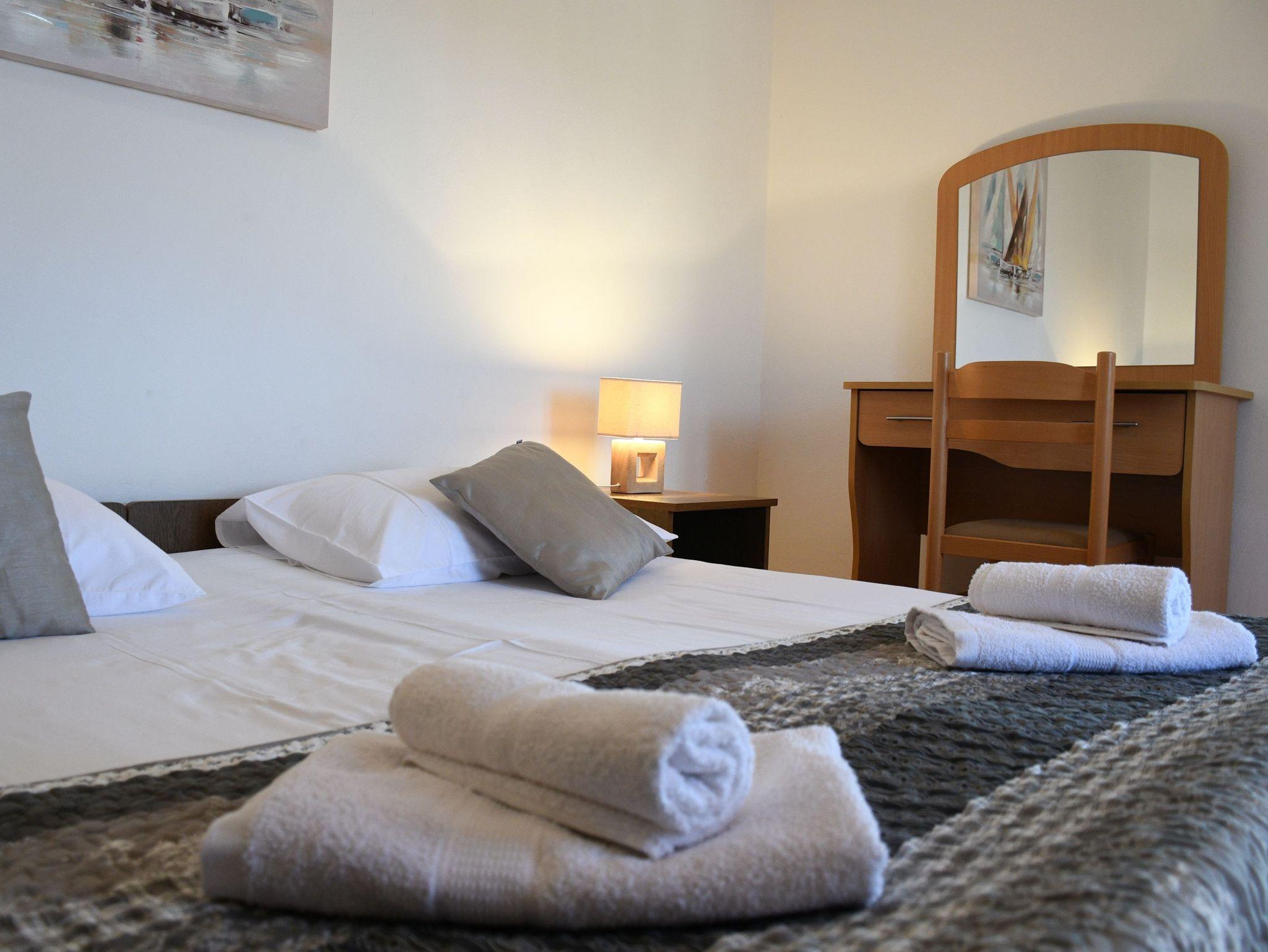 Ferienwohnung bietet Platz für 6 Gäste. Die Betten sind in Schlafzimmern, die es 2 gibt, und in Wohnzimmer, innerhalb einer Gesamtfläche von 63m2, angeordnet. Die Gäste haben eine eigene Terrasse zur Verfügung, auf der sie in warmen Sommernächten genießen können. Das Apartment bietet Meerblick. Es ist erlaubt, Speisen auf dem Gemeinschafts-Grill vorzubereiten. IM PREIS INBEGRIFFEN: Kurtaxe, Endreinigung, Klimatisierung, Parkplatz, Internet, Wäschewaschen, Bügeleisen, Bügelbrett, Föhn, tragbarer Grill. Die Verfügbarkeit zusätzlicher Dienstleistungen in Ihrem reservierten Termin und die Preise derselben (falls nicht aufgeführt) müssen im Voraus überprüft werden. Zusätzliche Dienstleistungen die in der Zahlungsaufforderung nicht aufgeführt sind werden direkt beim Vermieter bezahlt, angenommen der Gast nutzt auch diese.
