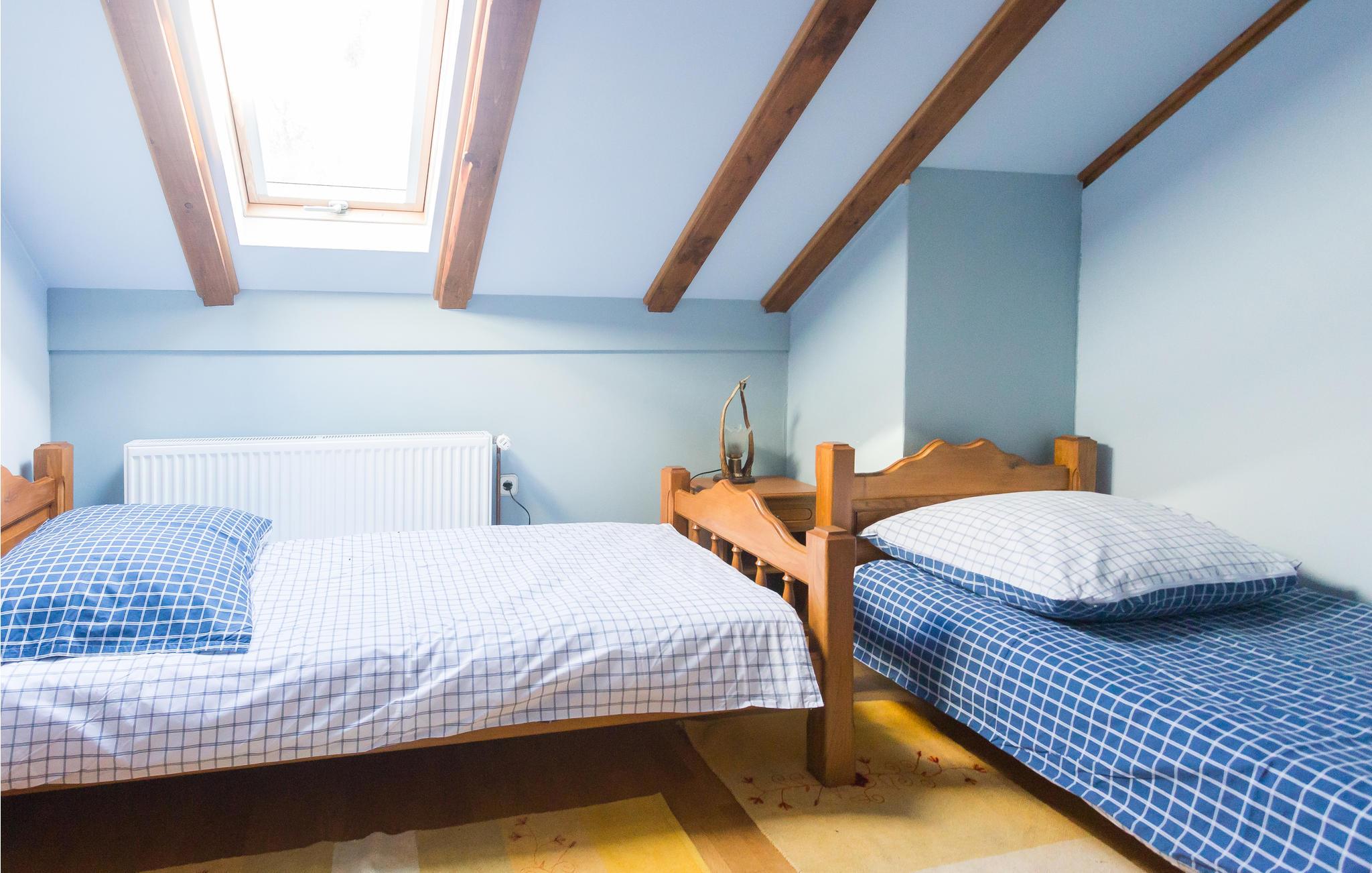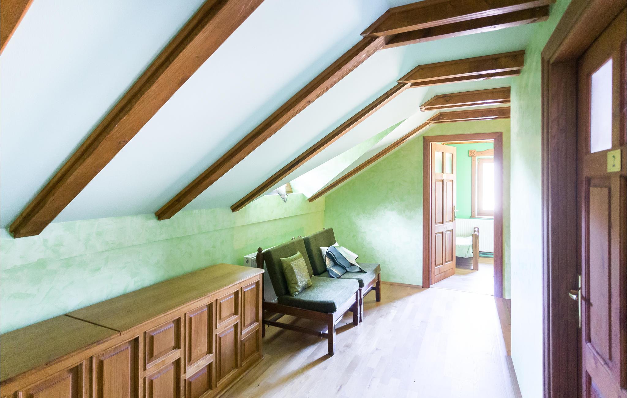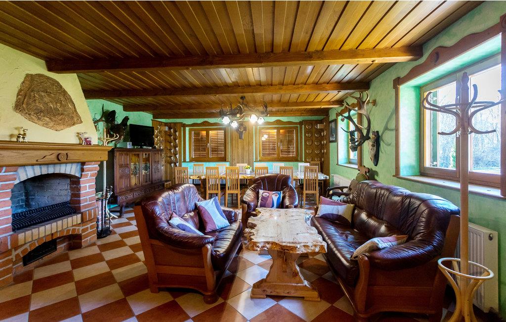 Træhuset venter sine gæster med 3 soveværelser og 2 badeværelser. Op til 8 personer kan finde sig godt til rette her. Husets placering er rolig, mens I på ferie vil I nyde fuglenes kvidren og lyden af ??en bæk ikke langt fra ejendommen. Gør jer komfortable ved pejsen om aftenen, brænde er tilgængelig gratis. Husejeren er jæger, og der er flere trofæer af forskellige vilde dyr i huset.