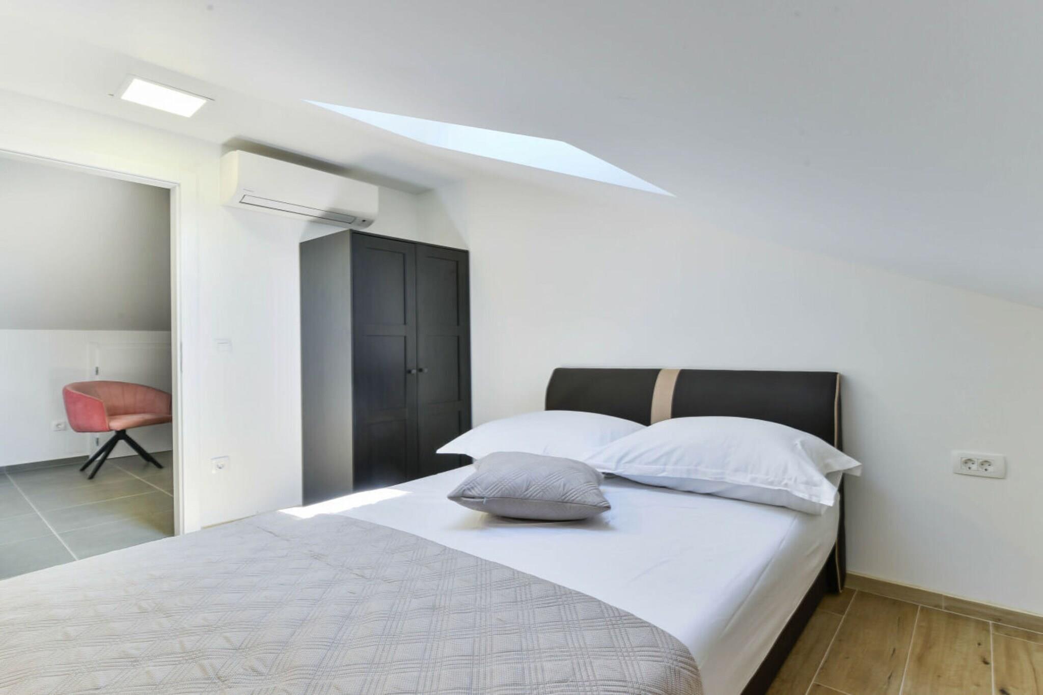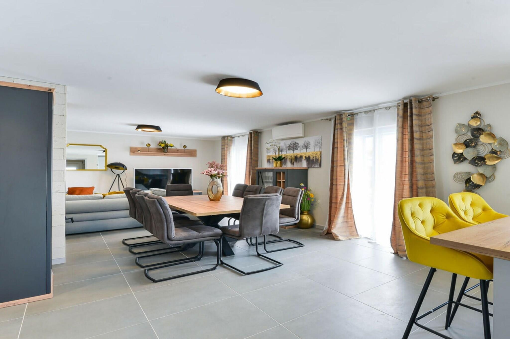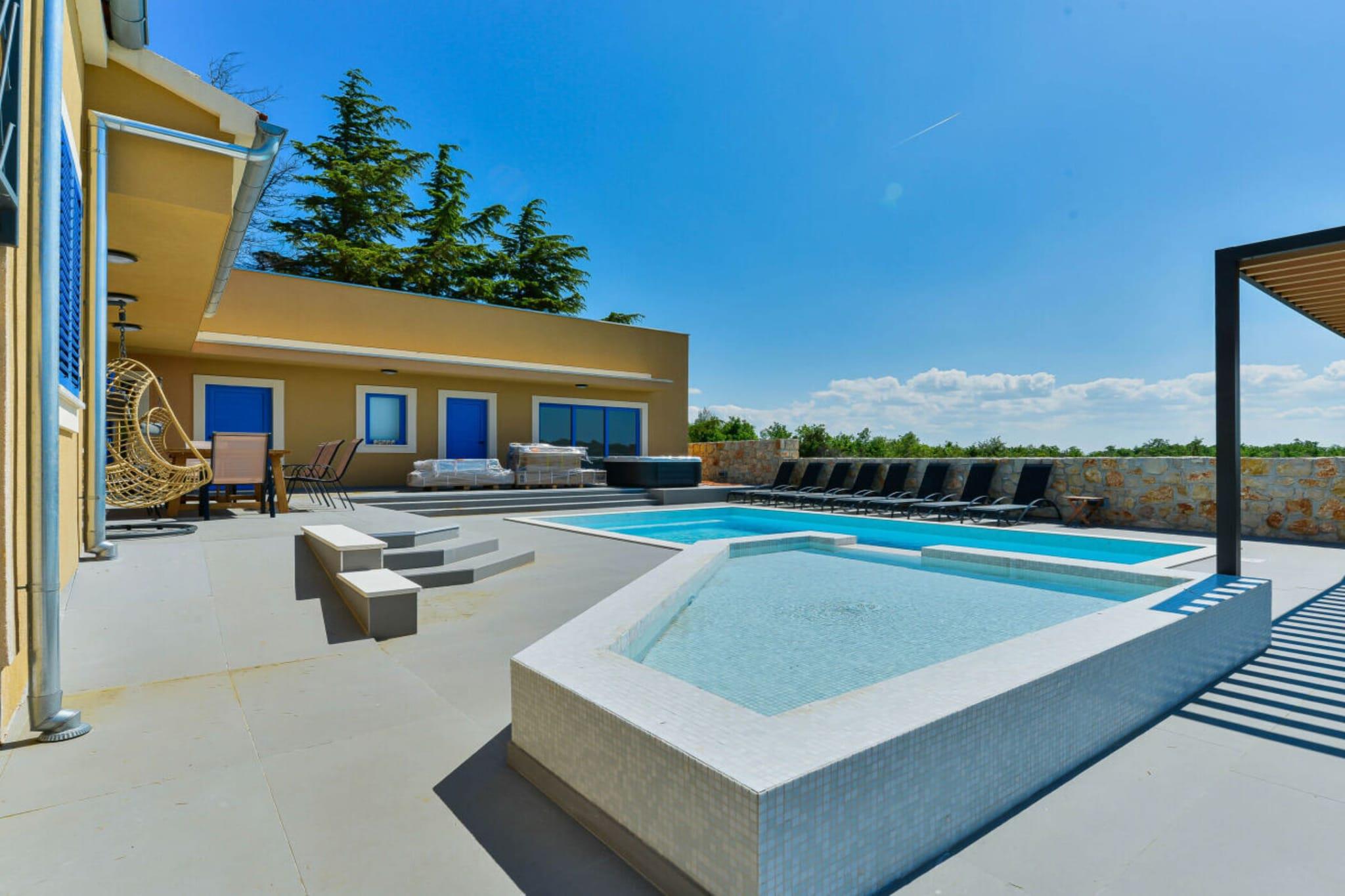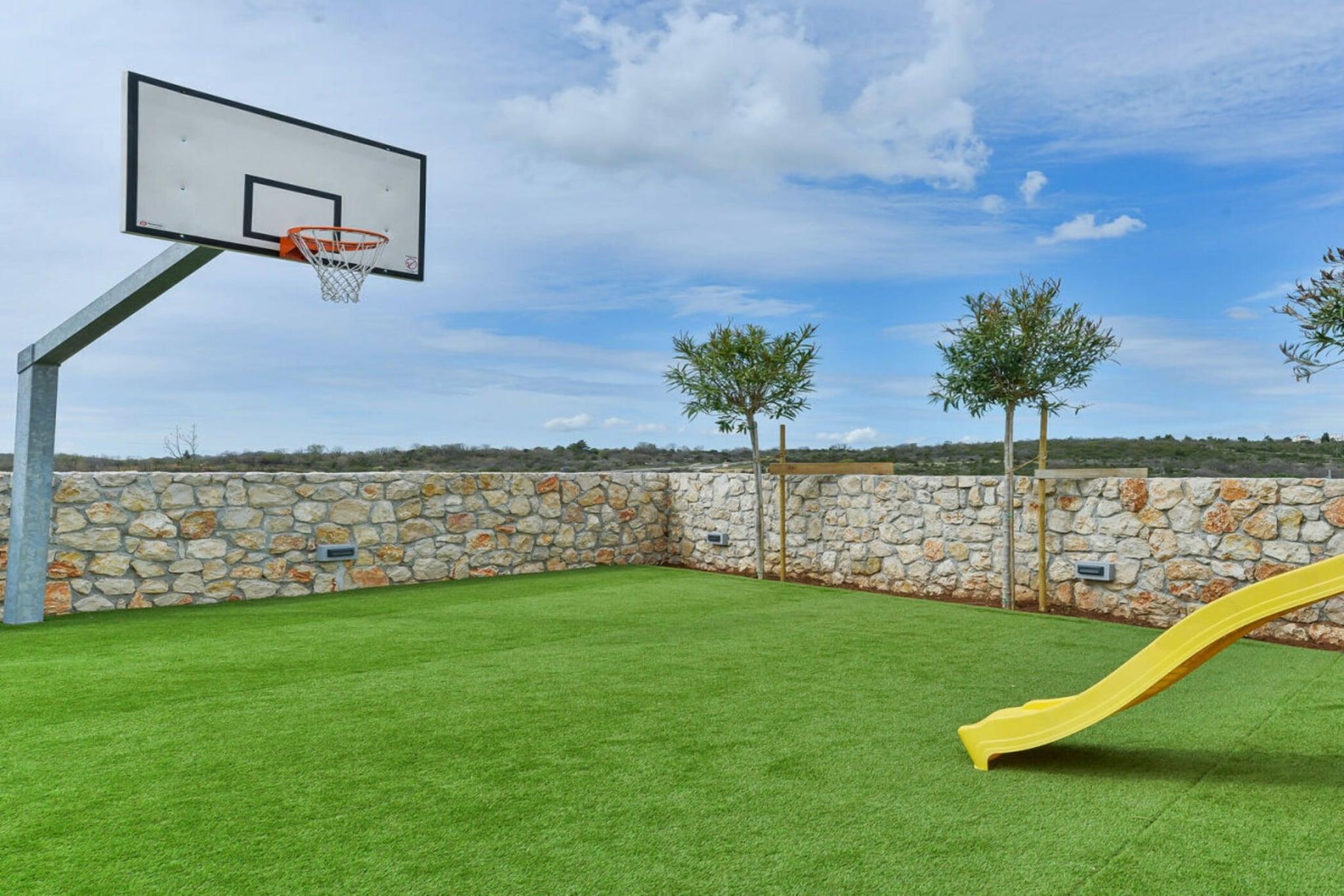 Die Villa bietet eine ruhige Umgebung für einen erholsamen Urlaub, sowie viele Annehmlichkeiten für die Unterhaltung Ihrer Familie und Freunde. Die 200 m2 große Villa befindet sich auf einem 1000 m2 großen Grundstück. Im Erdgeschoss finden Sie einen schönen offenen Wohnbereich, der ein Wohnzimmer, ein Esszimmer und eine voll ausgestattete Küche umfasst, alle mit einem direkten Ausgang zu einer erstaunlichen Terrasse und Poolbereich. Ebenfalls im Erdgeschoss befinden sich 4 Schlafzimmer, von denen 2 über ein eigenes Bad verfügen und die anderen 2 sich ein Bad teilen. Es gibt auch eine zusätzliche Toilette im Erdgeschoss. Die erste Etage ist von außen zugänglich und hat einen eigenen Eingang sowie eine zusätzliche Küchenzeile. Es gibt 2 weitere Schlafzimmer im ersten Stock. Das eine hat ein Doppelbett, das andere ein Doppelbett und ein Zusatzbett. Es gibt ein Badezimmer und eine zusätzliche Toilette. Der Außenbereich bietet eine Vielzahl von Annehmlichkeiten - einen Swimmingpool, einen Kinderpool, einen überdachten Grillplatz, Sonnenliegen, einen überdachten Gartenpavillon, einen Ess- und Sitzbereich im Freien... Die Villa verfügt über eine Sauna, einen Jacuzzi, einen Kinderspielplatz, einen Basketballplatz, SAT-TV, Wi-Fi im gesamten Haus und bietet Parkplätze. Haustiere sind gegen eine zusätzliche Gebühr erlaubt.
