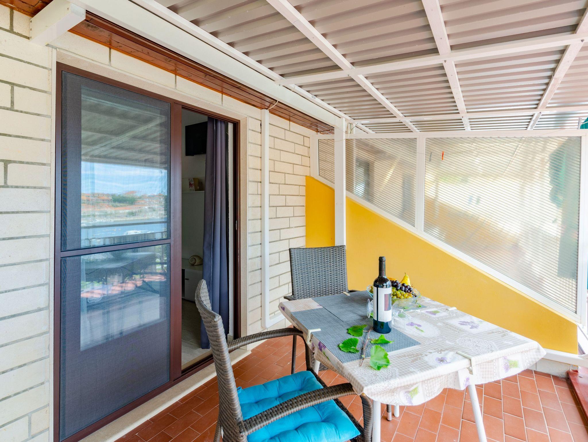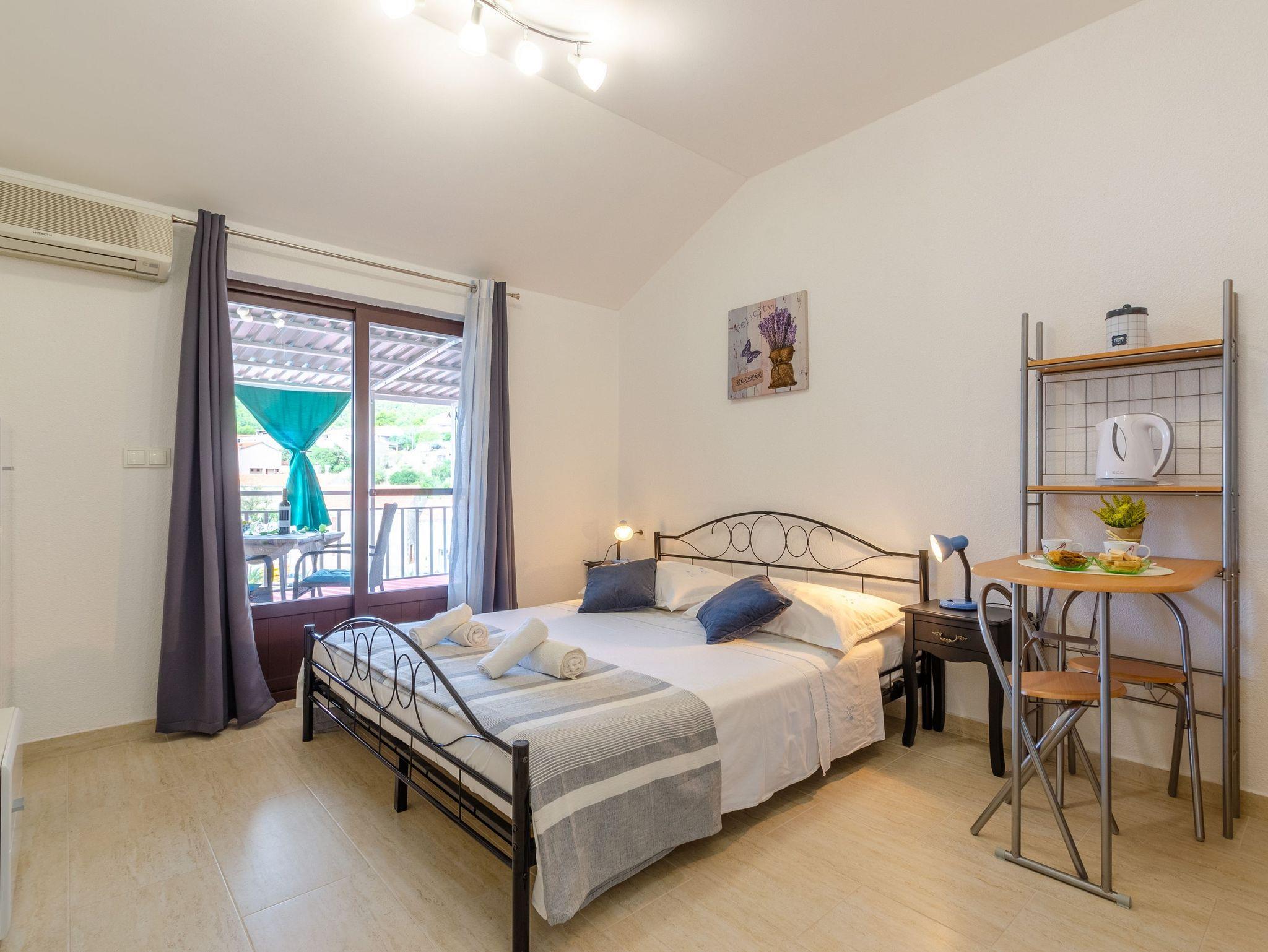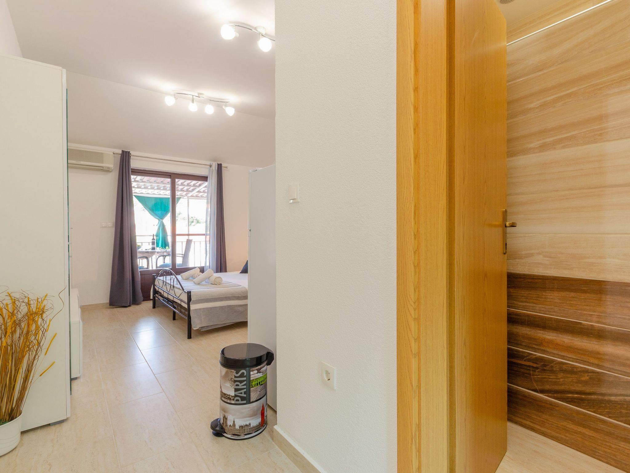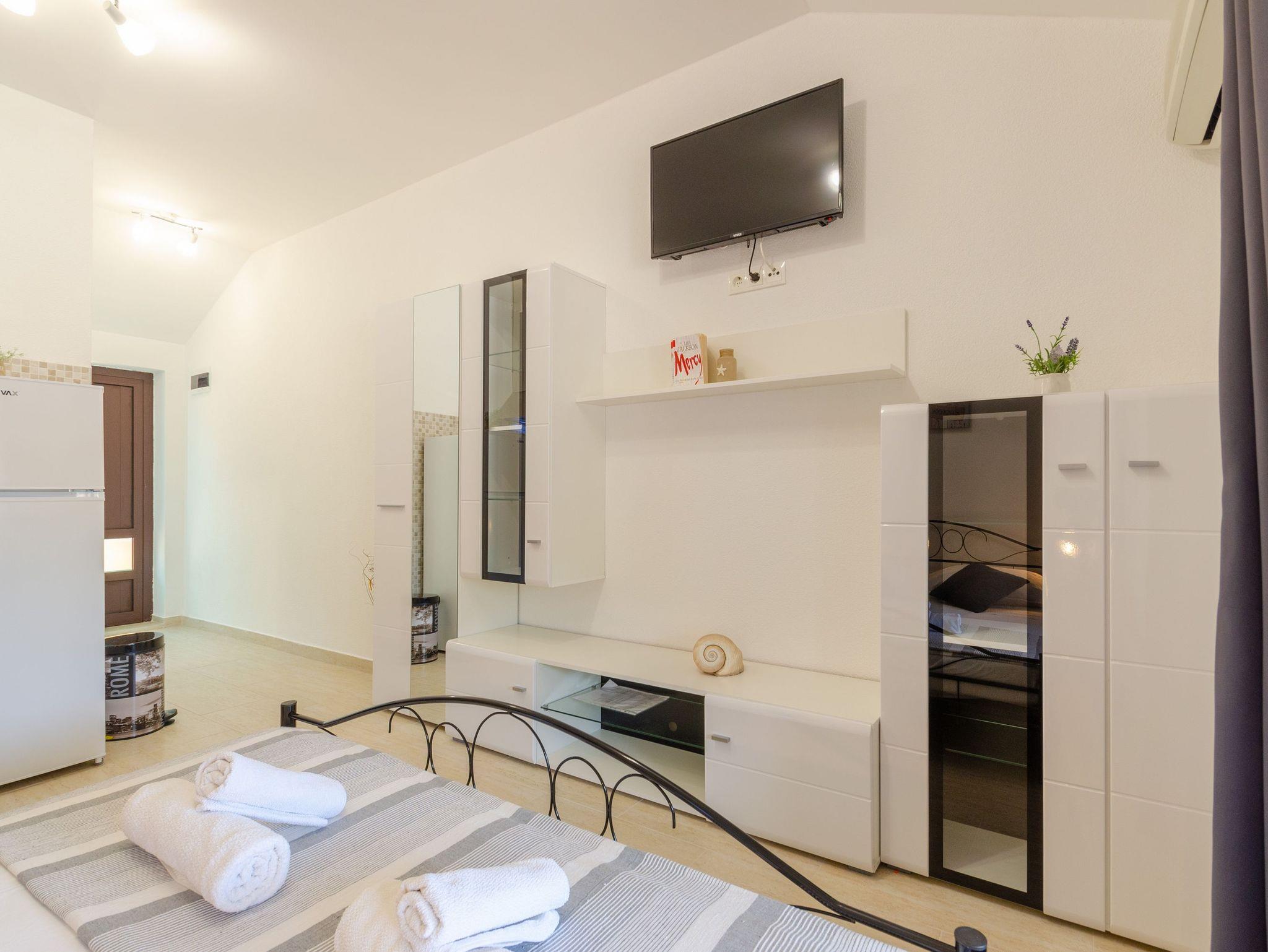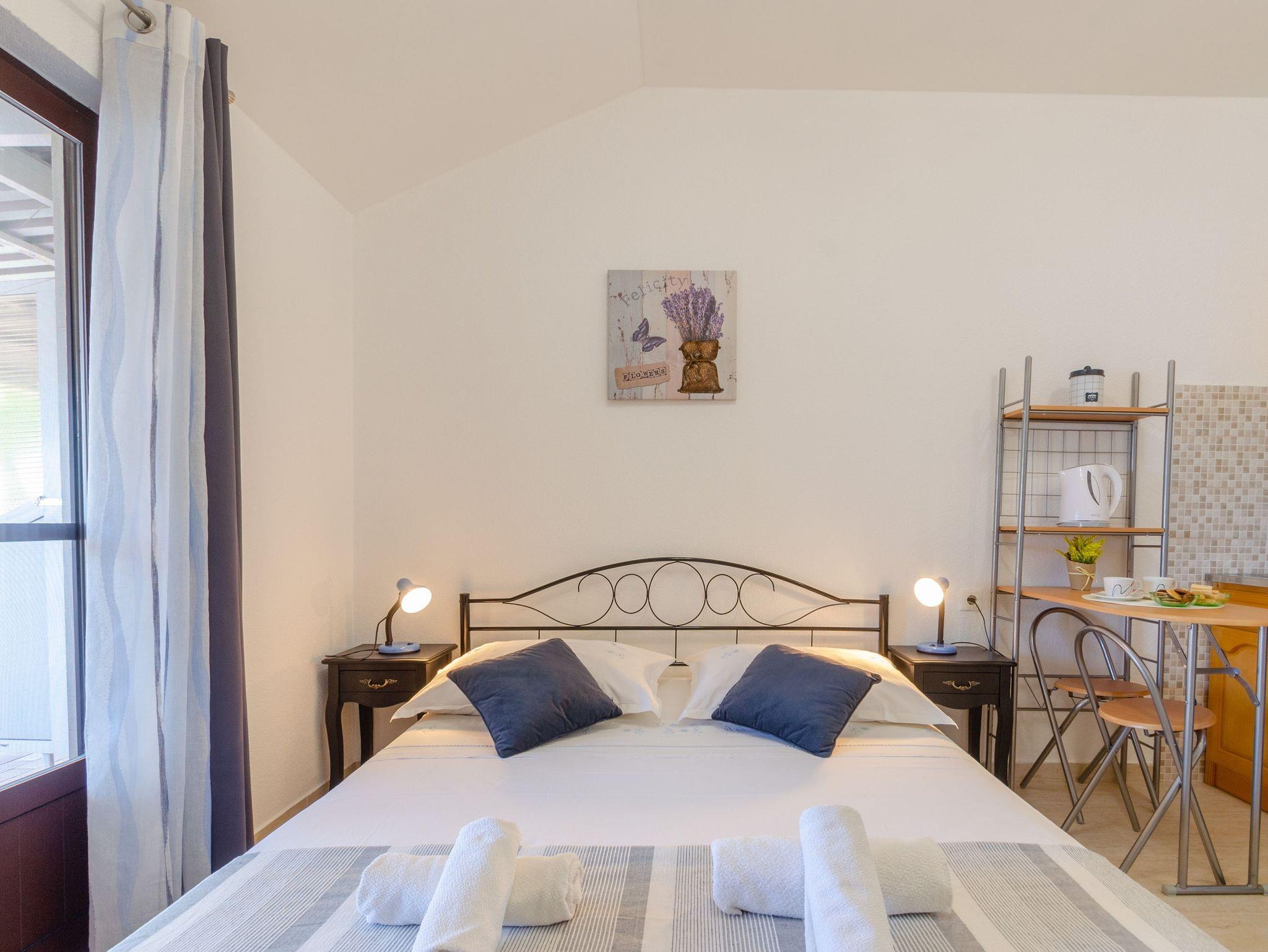 Studio bietet Platz für 2 Gäste. Die Betten sind in Schlafzimmern, die es 1 gibt, innerhalb einer Gesamtfläche von 20m2, angeordnet. Die Gäste haben eine eigene Terrasse zur Verfügung, auf der sie in warmen Sommernächten genießen können. Das Studio-Apartment bietet Meerblick. Es ist erlaubt, Speisen auf dem Gemeinschafts-Grill vorzubereiten. IM PREIS INBEGRIFFEN: Kurtaxe, Endreinigung, Parkplatz, Internet, Kinderbett, Bügeleisen, Bügelbrett, Föhn, tragbarer Grill. VERBINDLICHE ZUSÄTZLICHE KOSTEN: Aufzahlung für Kurzaufenthalte (prozentualer Zuschlag pro Nächtigungsanzahl: 30% - 1, 20% - 2, 10% - 3). UNVERBINDLICHE ZUSÄTZLICHE KOSTEN: Klimatisierung (5,00 € pro Nacht), Wäschewaschen (5,00 € Waschen), Bootsanlegeplatz (5,00 € pro Nacht). Die Verfügbarkeit zusätzlicher Dienstleistungen in Ihrem reservierten Termin und die Preise derselben (falls nicht aufgeführt) müssen im Voraus überprüft werden. Zusätzliche Dienstleistungen die in der Zahlungsaufforderung nicht aufgeführt sind werden direkt beim Vermieter bezahlt, angenommen der Gast nutzt auch diese. Ermäßigung auf den Grundpreis: Gratistag 14=13 (bei einem Aufenthalt von 14 Tagen oder mehr erhalten Sie einen Gratistag für den Aufenthalt bis 31.12.26).