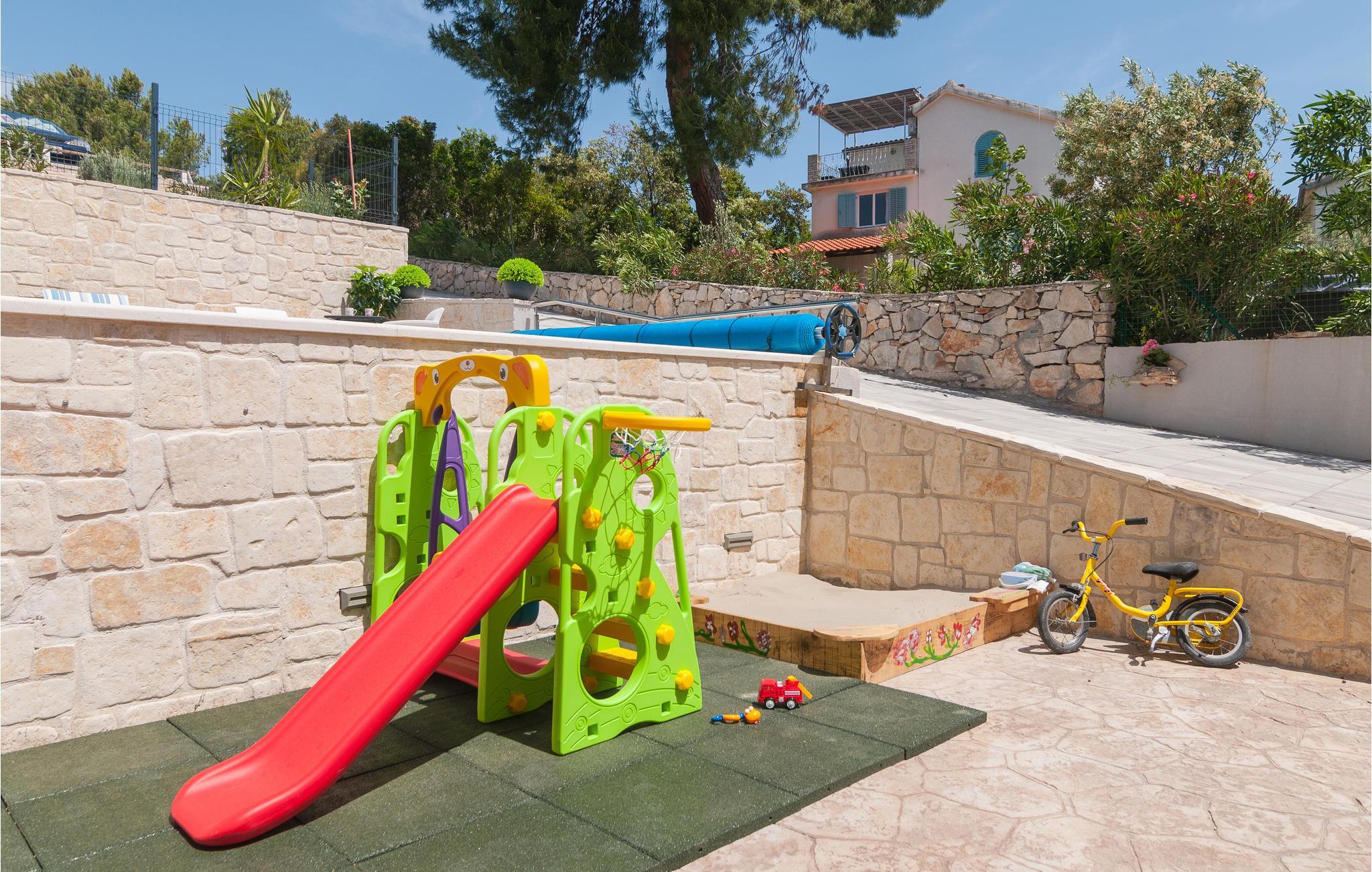 Huset ligger i et roligt kvarter kun 150 m fra centrum, hvor I kan gå ture og nyde det lokale gastronomiske tilbud. Husets have er udstyret med en næsten fuldstændig synlig pool, og grunden med masser af børnefaciliteter og en grill er helt indhegnet, hvilket gør den ideel til børnefamilier.