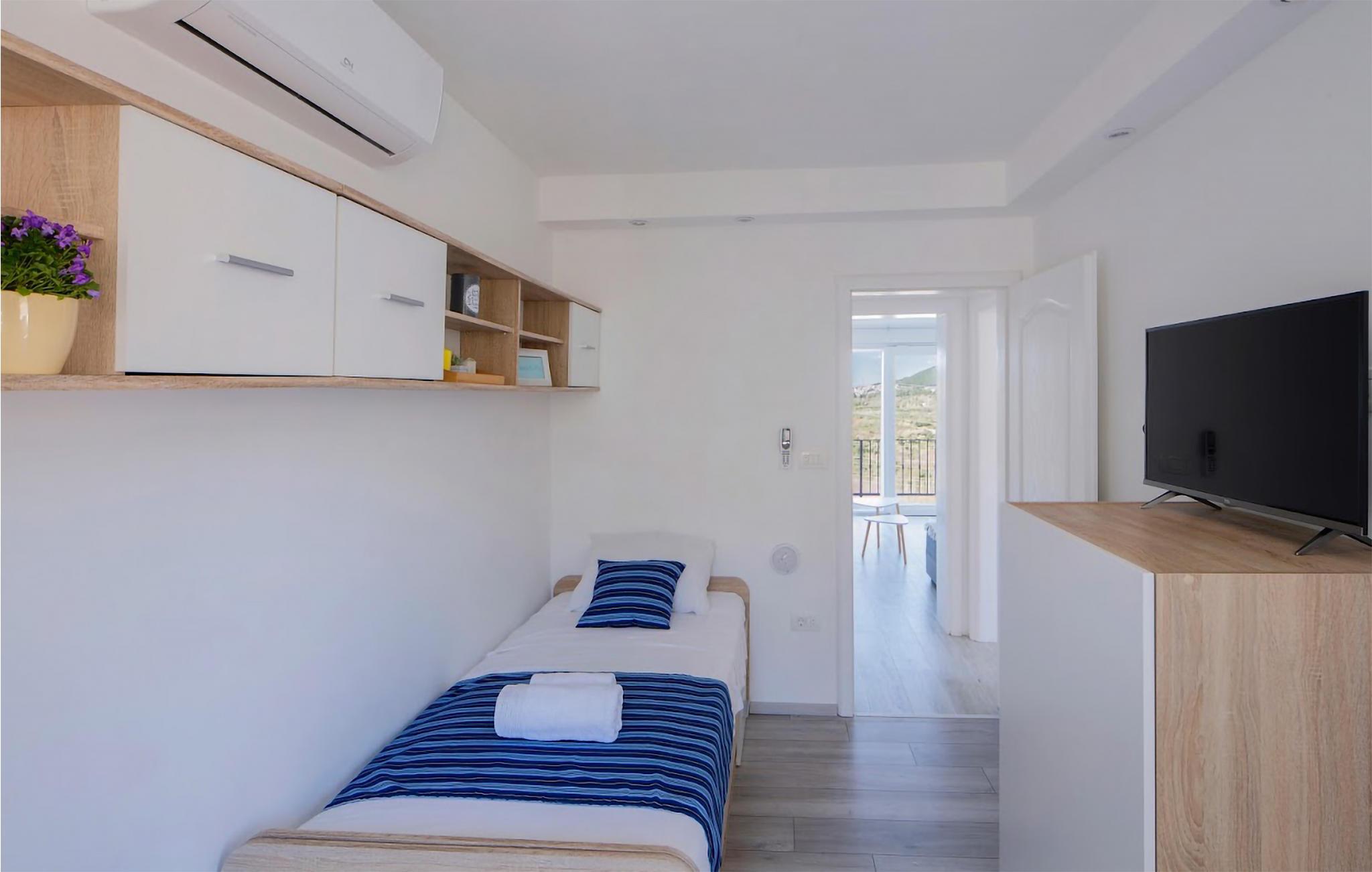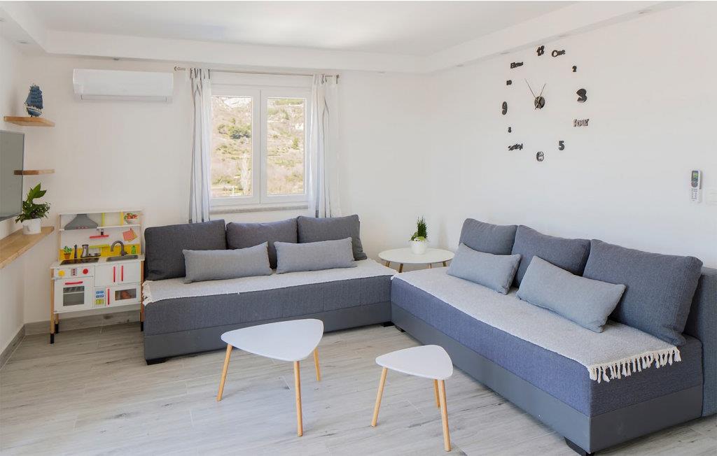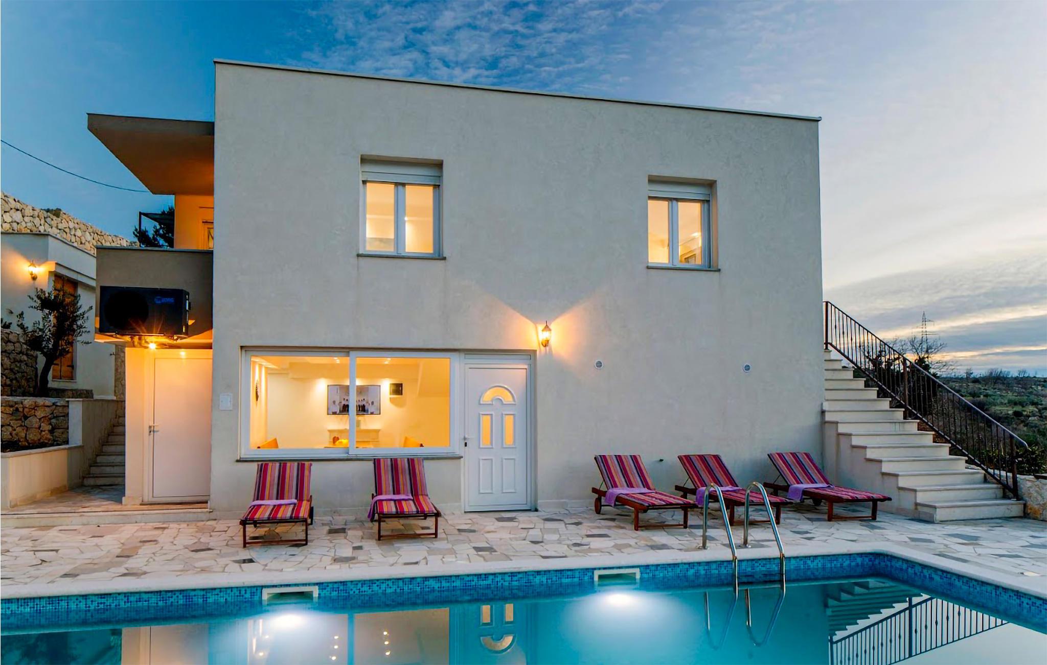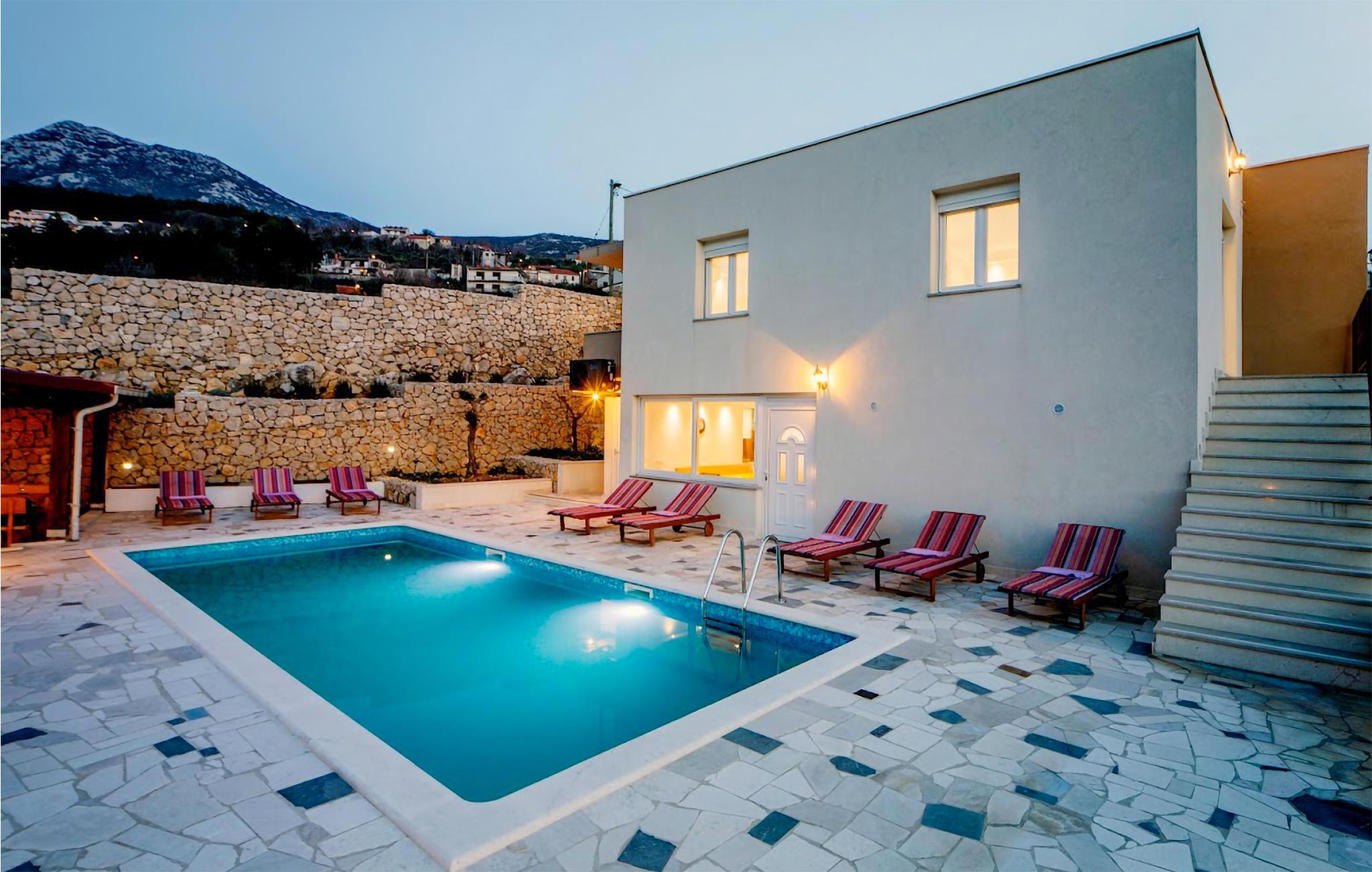 Med en ideel beliggenhed i nærheden af den attraktive kystby Split, kan I se frem til en ferie i særklasse i dette moderne designede hus. Udendørsarealet imponerer med den store terrasse og poolen, hvor I finder masser af plads til afslapning, og ikke mindst den uhindrede udsigt over det omkringliggende kuperede landskab. Grillen med bænke foran inviterer til at spise sammen i den friske luft, mens poolen, der er oplyst om aftenen, skaber den rette atmosfære dagen igennem.